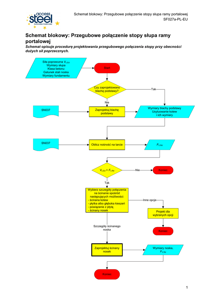 Schemat blokowy: Przegubowe połączenie stopy słupa ramy portalowej SF027a-PL-EU Schemat blokowy: Przegubowe połączenie stopy słupa ramy portalowej Schemat opisuje procedurę projektowania przegubowego połączenia stopy przy obecności duŜych sił poprzecznych. Siła poprzeczna Vc,Ed Wymiary słupa Klasa betonu Gatunek stali noska Wymiary fundamentu Start Czy zaprojektowano blachę podstawy? Tak Nie SN037 SN037 Wymiary blachy podstawy Usytuowanie kotew i ich wymiary Zaprojektuj blachę podstawy Oblicz nośność na tarcie Vc,Ed > Fv,Rd FV,Rd Nie Koniec Tak Wybierz szczegóły połączenia na ścinanie spośród następujących moŜliwości: - ścinana kotew - płytka albo głęboka kieszeń - powiązanie z płytą - ścinany nosek Inne opcje Projekt dla wybranych opcji Szczegóły ścinanego noska Koniec Zaprojektuj ścinany nosek Wymiary noska, FV,Rd Koniec 1 Schemat blokowy: Przegubowe połączenie stopy słupa ramy portalowej SF027a-PL-EU Projekt ścinanego noska Siła poprzeczna Vc,Ed Wymiary słupa Klasa betonu Gatunek stali noska Wymiary fundamentu Start Znany typ noska i wymiary ? Tak Nie SN021 Przyjmij typ noska i wymiary Typ noska i wymiary Oblicz nośność na ścinanie ze względu na beton VRd (Beton) Oblicz nośność na ścinanie ze względu na spoiny noska VRd (Spoiny noska) Oblicz nośność na ścinanie ze względu na charakterystyki noska VRd (Nosek) Oblicz nośność na ścinanie ze względu na nośność środnika słupa VRd (Środnik słupa) Ustal nośność na ścinanie jako minimum z 4 obliczonych wcześniej Wartości VRd Fv,Rd SN021 Vc,Ed ≤ Fv,Rd Nie Tak Powrót 2 Schemat blokowy: Przegubowe połączenie stopy słupa ramy portalowej SF027a-PL-EU Quality Record RESOURCE Title Schemat blokowy: Przegubowe połączenie stopy słupa ramy portalowej Reference(s) ORIGINAL DOCUMENT Name Company Date Created by Ivor Ryan CTICM 06/02/2006 Technical content checked by Alain Bureau CTICM 06/02/2006 1. UK G W Owens SCI 7/4/06 2. France A Bureau CTICM 7/4/06 3. Sweden B Uppfeldt SBI 7/4/06 4. Germany C Müller RWTH 7/4/06 5. Spain J Chica Labein 7/4/06 G W Owens SCI 25/7/06 Editorial content checked by Technical content endorsed by the following STEEL Partners: Resource approved by Technical Coordinator TRANSLATED DOCUMENT This translation made and checked by: Translated resource approved by 3 Schemat blokowy: Przegubowe połączenie stopy słupa ramy portalowej SF027a-PL-EU Wrapper Information Title Schemat blokowy: Przegubowe połączenie stopy słupa ramy portalowej Series Description Schemat opisuje procedurę projektowania przegubowego połączenia stopy przy obecności duŜych sił poprzecznych. Access Level Expertise Practitioner Identifiers Filename SF027a-PL-EU.vsd Resource Type Schemat blokowy Viewpoint Engineer Subject Application Area(s) Budynki jednokondygnacyjne Dates Created Date 2004-03-15 Last Modified Date 24/03/2006 Checked Date 24/03/2006 Format Category Valid From Valid To Languages Contacts Polski Author Ivor Ryan, CTICM Checked By Alain Bureau, CTICM Approved By Editor Last Modified By Keywords Połączenia stóp słupów, ramy portalowe See Also Eurocode Reference EN 1993-1-8, EN 1992 Worked Examples Commentary Discussion Other Coverage National Applicability EU Special Instructions 4