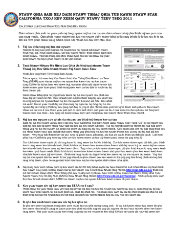 NTAWV QHIA SAIB NEJ DAIM NTAWV TSHAJ QHIA TUB KAWM NTAWV STAR CALIFORNIA TXOJ KEV XEEM QAUV NTAWV TEEV TSEG 2011 CALIFORNIA LUB CHAW KHIAV DEJ NUM SAIB KEV KAWM Daim ntawv qhia saib no yuav pab nej taug xyuas nej tus me nyuam daim ntawv tshaj qhia thiab tej kev pom zoo uas raug muab. Qee phab ntawv ntawm nej tus me nyuam daim ntawv tshaj qhia raug txhais ib lo lus rau ib lo lus, tab sis lwm phab ntawv raug txhais raws lub ntsiab lus dav dav ntau dua. 1. Tej lus qhia txog nej tus me nyuam Ntawm no nej yuav pom nej tus me nyuam tus naj npawb tub kawm ntawv, hnub yug, qib, hnub xeem ntawv, lub tsev kawm ntawv, thiab cheeb tsam tsev kawm ntawv. Yog tias muaj, nej qhov chaw nyob rau kev xa ntawv kuj yuav pom tshwm rau hauv phab ntawv no tib yam nkaus. 2. Tsab Ntawv Nthuav Me Ntsis Lus Qhia Ua Ntej tuaj ntawm Tuam Thawj Coj Kev Qhia Ntaub Ntawv Pej Xeem hauv Xeev Nyob Zoo txog Niam Txiv/Neeg Saib Xyuas, Txhua xyoos, lub xeev txoj Kev Xeem thiab Kev Tshaj Qhia Raws Lus Teev Tseg (STAR) yuav ntsuas nej tus me nyuam kev kawm tau rau kev caum cuag California tej lus teev kev kawm txuj, uas piav qhia saib tag nrho cov tub kawm ntawv yuav tsum paub thiab muaj peev xwm ua tau dab tsi nyob rau tej thwb theem qib. Daim ntawv tshaj qhia no yog nthuav tawm nej tus me nyuam cov qhab nia hauv tej kev xeem STAR. Kuv txhawb kom nej los tham txog tej kev xeem tau no nrog nej tus me nyuam thiab nej tus me nyuam tus(cov) xib fwb. Cov qhab nia xeem tau no yuav muab tej lus qhia muaj nuj nqis rau nej txog nej tus me nyuam tej kev tshaj lij thiab tej kev qaug qeb txuj ci, yog ib qho ntawm ntau yam kev qhia tawm saib peb cov tsev kawm ntawv ua tau zoo li cas, thiab yuav pab peb to taub saib ntxim peb yuav ua tau li cas kom zoo dua qub rau tes hauj lwm tseem ceeb dua ntais – kev npaj tub kawm ntawv kom vam meej hauv tsev kawm ntawv thiab dhau ntawd. 3. Nej tus me nyuam cov qhab nia ntsuas tau thiab tej theem kev ua tau Saib nej tus me nyuam ua tau zoo li cas rau hauv California Txoj Kev Xeem Qauv Ntawv Teev Tseg (CSTs) los ntawm kev saib tej kab dub tig sawv ntsug hauv qab tej zwb zaj kev kawm lub npe. Tus naj npawb saum toj ntawm tej kwb kab sawv ntsug yog nej tus me nyuam tus qhab nia xeem tau kiag rau zaj kev kawm ntawd. Cov boxes zas xim rov sab laug thiab cov lus ntaub ntawv hauv qab tej kab dub sawv ntsug yog qhia txog nej tus me nyuam theem kev ua tau rau tej zwb zaj kev kawm. Nws muaj tsib theem kev ua tau: tshaj lij, paub txaus, pib paub, qis dua pib paub, thiab qis deb pib paub. Lub hom phiaj hauv California yog kom tag nrho cov tub kawm ntawv ua tau txij theem paub txaus los yog tshaj lij. Cov tub kawm ntawv nyob qib ob txog kaum ib raug xeem lus As Kiv thiab lej. Cov tub kawm ntawv nyob qib tsib, yim, thiab kaum raug xeem kev tshawb fawb, thiab ib txhia tub kawm tsev kawm ntawv theem siab tej zaum kuj tau xeem tej kev xeem kev tshawb fawb thaum xaus zaj kev kawm tib si. Tag nrho cov tub kawm ntawv nyob qib yim thiab kaum ib raug xeem keeb kwm-kev nyob haum xeeb, thiab ib txhia tub kawm tsev kawm ntawv theem siab yuav tau xeem qhov kev xeem keeb kwm ntiaj teb thaum xaus zaj kev kawm. Qhab nia raug muab rau tag nrho tej kev xeem nej tus me nyuam tau xeem. Yog tias nej tus me nyuam tsis tau xeem ib los yog ntau dua qhov ntawm cov kev xeem no los yog yog tias ib tug qhab nia twg tsis raug tshaj tawm, qhov no raug ceeb toom rau hauv nej tus me nyuam daim ntawv tshaj qhia. 4. Nej muaj peev xwm nrhiav pom tej kev xeem tau STAR txhij txhua nyob rau hauv California Lub Chaw Khiav Dej Num Saib Kev Kawm Txuj (CDE) nplooj ntawv tso tej Kev Xeem Tau STAR hauv Nruab Ntug ntawm http://star.cde.ca.gov thiab nej lub tsev kawm ntawv daim ntawv tshaj qhia kev ris dej num nyob rau hauv CDE nplooj ntawv tso Ntawv Tshaj Qhia Tsev Kawm Ntawv Kev Ris Dej Num (SARC) hauv Nruab Ntug ntawm http://www.cde.ca.gov/ta/ac/sa/. Nej kuj muaj peev xwm thov tau ib tsab ntawm daim SARC los ntawm nej tus me nyuam lub tsev kawm ntawv tib yam nkaus. 5. Kuv yuav tsum siv tej kev xeem tau STAR no li cas? Phab ntawv no yuav ntaus tswv yim txog tej kev ua los tswj nej tus me nyuam kev kawm tau txuj ci, xam nrog rau tej kev xeem hauv chav kawm, tej dej num teem ua, thiab tej qhab nia. Nej muaj peev xwm siv tau tej chaw muab lus qhia no los tham nrog nej tus me nyuam tus xib fwb txog tej seem kev kawm ntsees twg rau kev nce kev kawm tau. 6. Ib qho lus ceeb toom rau kev siv tej lus qhia no Ib qho kev xeem twg tsuas muaj peev xwm muab tau lus qhia tsawg tsawg xwb. Ib tug tub kawm ntawv twg xeem tib qho kev xeem ntau tshaj ib zaug tej zaum yuav tau qhab nia siab zog los yog qis zog me me rau hauv tej swb seem kev kawm raug xeem. Nej yuav tsum xyuas kom meej txog nej tus me nyuam tej kev tshaj lij thiab kev poob qis hauv tej seem kev kawm no los ntawm kev tshuaj xyuas tej dej num ua hauv chav kawm, tej kev soj ntsuam raws lus teev tseg, thiab tej ntawv tshaj qhia kev kawm tau hauv lub xyoo. 7. Nej tus me nyuam tej kev tshaj lij thiab tej kev poob qis raws li cov kev xeem no Cov duab nthuav lus qhia no yog nthuav tawm qhov nej tus me nyuam ua tau zoo li cas hauv tej seem kev kawm sib txawv rau tej qhwb qho kev xeem tau xeem. Zaj kev kawm rau tej qhwb qho kev xeem raug teev tseg saum toj ntawm tej dwb daim duab nthuav lus qhia. Cov ntawv tshaj qhia feem ntau rau cov tub kawm ntawv nyob qib ob txog kaum ib yuav xam nrog rau lus As Kiv thiab lej. Cov ntawv tshaj qhia rau cov tub kawm ntawv nyob qib yim thiab kaum ib yuav xam nrog rau keeb kwm-kev nyob haum xeeb. Cov ntawv tshaj qhia rau cov tub kawm tsev kawm ntawv theem siab tej zaum kuj xam nrog rau kev xeem tau tej kev xeem thaum xaus zaj kev kawm hauv kev tshawb fawb thiab keeb kwm ntiaj teb. Tej nqe lus nug hauv cov CSTs raug cais ua pawg raws tej seem kev kawm nthuav tawm rau sab laug ntawm tej dwb daim duab nthuav lus qhia. Tej seem kev kawm no raug tso raws California tej qauv ntawv teev tseg, uas piav txog qhov nej tus me nyuam yuav tsum paub thiab muaj peev xwm ua tau dab tsi nyob rau tej thwb t