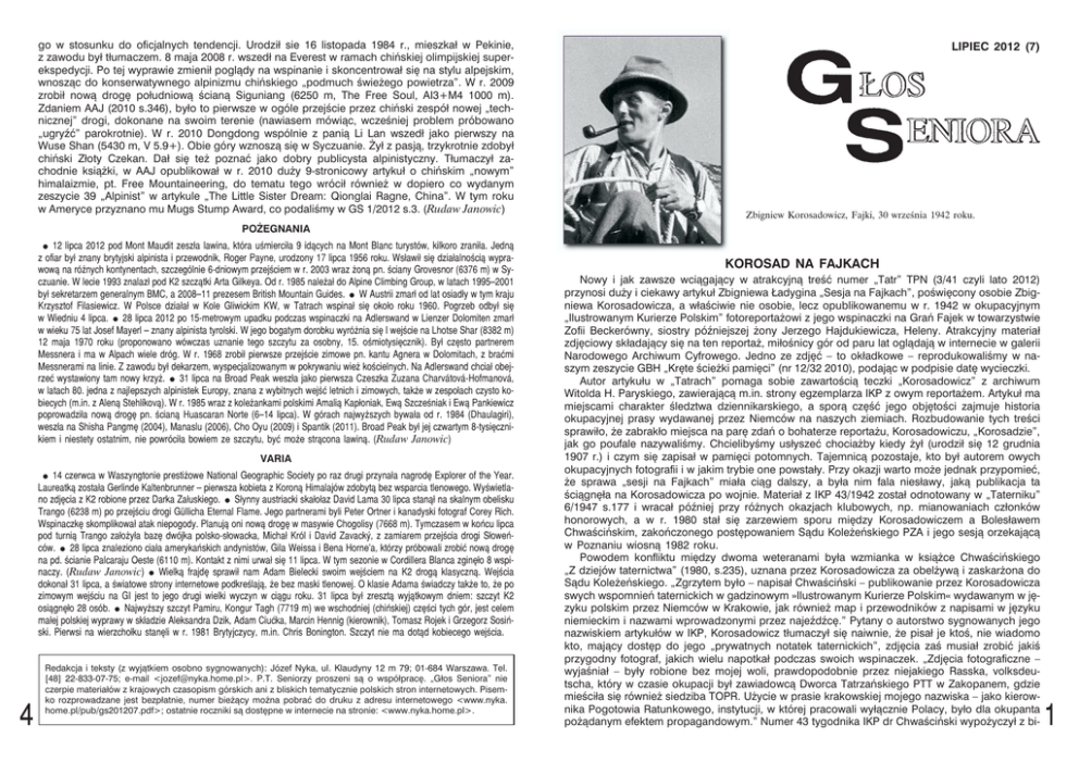 go w stosunku do oficjalnych tendencji. Urodził sie 16 listopada 1984 r., mieszkał w Pekinie, z zawodu był tłumaczem. 8 maja 2008 r. wszedł na Everest w ramach chińskiej olimpijskiej superekspedycji. Po tej wyprawie zmienił poglądy na wspinanie i skoncentrował się na stylu alpejskim, wnosząc do konserwatywnego alpinizmu chińskiego „podmuch świeżego powietrza”. W r. 2009 zrobił nową drogę południową ścianą Siguniang (6250 m, The Free Soul, AI3+M4 1000 m). Zdaniem AAJ (2010 s.346), było to pierwsze w ogóle przejście przez chiński zespół nowej „technicznej” drogi, dokonane na swoim terenie (nawiasem mówiąc, wcześniej problem próbowano „ugryźć” parokrotnie). W r. 2010 Dongdong wspólnie z panią Li Lan wszedł jako pierwszy na Wuse Shan (5430 m, V 5.9+). Obie góry wznoszą się w Syczuanie. Żył z pasją, trzykrotnie zdobył chiński Złoty Czekan. Dał się też poznać jako dobry publicysta alpinistyczny. Tłumaczył zachodnie książki, w AAJ opublikował w r. 2010 duży 9-stronicowy artykuł o chińskim „nowym” himalaizmie, pt. Free Mountaineering, do tematu tego wrócił również w dopiero co wydanym zeszycie 39 „Alpinist” w artykule „The Little Sister Dream: Qionglai Ragne, China”. W tym roku w Ameryce przyznano mu Mugs Stump Award, co podaliśmy w GS 1/2012 s.3. (Rudaw Janowic) LIPIEC 2012 (7) Zbigniew Korosadowicz, Fajki, 30 września 1942 roku. POŻEGNANIA ● 12 lipca 2012 pod Mont Maudit zesz³a lawina, która uœmierci³a 9 id¹cych na Mont Blanc turystów, kilkoro zrani³a. Jedn¹ z ofiar by³ znany brytyjski alpinista i przewodnik, Roger Payne, urodzony 17 lipca 1956 roku. Ws³awi³ siê dzia³alnoœci¹ wyprawow¹ na ró¿nych kontynentach, szczególnie 6-dniowym przejœciem w r. 2003 wraz ¿on¹ pn. œciany Grovesnor (6376 m) w Syczuanie. W lecie 1993 znalaz³ pod K2 szcz¹tki Arta Gilkeya. Od r. 1985 nale¿a³ do Alpine Climbing Group, w latach 1995–2001 by³ sekretarzem generalnym BMC, a 2008–11 prezesem British Mountain Guides. ● W Austrii zmar³ od lat osiad³y w tym kraju Krzysztof Filasiewicz. W Polsce dzia³a³ w Kole Gliwickim KW, w Tatrach wspina³ siê oko³o roku 1960. Pogrzeb odby³ siê w Wiedniu 4 lipca. ● 28 lipca 2012 po 15-metrowym upadku podczas wspinaczki na Adlerswand w Lienzer Dolomiten zmar³ w wieku 75 lat Josef Mayerl – znany alpinista tyrolski. W jego bogatym dorobku wyró¿nia siê I wejœcie na Lhotse Shar (8382 m) 12 maja 1970 roku (proponowano wówczas uznanie tego szczytu za osobny, 15. oœmiotysiêcznik). By³ czêsto partnerem Messnera i ma w Alpach wiele dróg. W r. 1968 zrobi³ pierwsze przejœcie zimowe pn. kantu Agnera w Dolomitach, z braæmi Messnerami na linie. Z zawodu by³ dekarzem, wyspecjalizowanym w pokrywaniu wie¿ koœcielnych. Na Adlerswand chcia³ obejrzeæ wystawiony tam nowy krzy¿. ● 31 lipca na Broad Peak wesz³a jako pierwsza Czeszka Zuzana Charvátová-Hofmanová, w latach 80. jedna z najlepszych alpinistek Europy, znana z wybitnych wejœæ letnich i zimowych, tak¿e w zespo³ach czysto kobiecych (m.in. z Alen¹ Stehlíkov¹). W r. 1985 wraz z kole¿ankami polskimi Amali¹ Kap³oniak, Ew¹ Szczeœniak i Ew¹ Pankiewicz poprowadzi³a now¹ drogê pn. œcian¹ Huascaran Norte (6–14 lipca). W górach najwy¿szych bywa³a od r. 1984 (Dhaulagiri), wesz³a na Shisha Pangmê (2004), Manaslu (2006), Cho Oyu (2009) i Spantik (2011). Broad Peak by³ jej czwartym 8-tysiêcznikiem i niestety ostatnim, nie powróci³a bowiem ze szczytu, byæ mo¿e str¹cona lawin¹. (Rudaw Janowic) VARIA 14 czerwca w Waszyngtonie presti¿owe National Geographic Society po raz drugi przyna³a nagrodê Explorer of the Year. Laureatk¹ zosta³a Gerlinde Kaltenbrunner – pierwsza kobieta z Koron¹ Himalajów zdobyt¹ bez wsparcia tlenowego. Wyœwietlano zdjêcia z K2 robione przez Darka Za³uskiego. ● S³ynny austriacki ska³o³az David Lama 30 lipca stan¹³ na skalnym obelisku Trango (6238 m) po przejœciu drogi Güllicha Eternal Flame. Jego partnerami byli Peter Ortner i kanadyski fotograf Corey Rich. Wspinaczkê skomplikowa³ atak niepogody. Planuj¹ oni now¹ drogê w masywie Chogolisy (7668 m). Tymczasem w koñcu lipca pod turni¹ Trango za³o¿y³a bazê dwójka polsko-s³owacka, Micha³ Król i David Zavacký, z zamiarem przejœcia drogi S³oweñców. ● 28 lipca znaleziono cia³a amerykañskich andynistów, Gila Weissa i Bena Horne’a, którzy próbowali zrobiæ now¹ drogê na pd. œcianie Palcaraju Oeste (6110 m). Kontakt z nimi urwa³ siê 11 lipca. W tym sezonie w Cordillera Blanca zginê³o 8 wspinaczy. (Rudaw Janowic) ● Wielk¹ frajdê sprawi³ nam Adam Bielecki swoim wejœciem na K2 drog¹ klasyczn¹. Wejœcia dokona³ 31 lipca, a œwiatowe strony internetowe podkreœlaj¹, ¿e bez maski tlenowej. O klasie Adama œwiadczy tak¿e to, ¿e po zimowym wejœciu na GI jest to jego drugi wielki wyczyn w ci¹gu roku. 31 lipca by³ zreszt¹ wyj¹tkowym dniem: szczyt K2 osi¹gnê³o 28 osób. ● Najwy¿szy szczyt Pamiru, Kongur Tagh (7719 m) we wschodniej (chiñskiej) czêœci tych gór, jest celem ma³ej polskiej wyprawy w sk³adzie Aleksandra Dzik, Adam Ciuæka, Marcin Hennig (kierownik), Tomasz Rojek i Grzegorz Sosiñski. Pierwsi na wierzcho³ku stanêli w r. 1981 Brytyjczycy, m.in. Chris Bonington. Szczyt nie ma dot¹d kobiecego wejœcia. ● 4 Redakcja i teksty (z wyjątkiem osobno sygnowanych): Józef Nyka, ul. Klaudyny 12 m 79; 01-684 Warszawa. Tel. [48] 22-833-07-75; e-mail <[email protected]>. P.T. Seniorzy proszeni są o współpracę. „Głos Seniora” nie czerpie materiałów z krajowych czasopism górskich ani z bliskich tematycznie polskich stron internetowych. Pisemko rozprowadzane jest bezpłatnie, numer bieżący można pobrać do druku z adresu internetowego <www.nyka. home.pl/pub/gs201207.pdf>; ostatnie roczniki są dostępne w internecie na stronie: <www.nyka.home.pl>. KOROSAD NA FAJKACH Nowy i jak zawsze wciągający w atrakcyjną treść numer „
