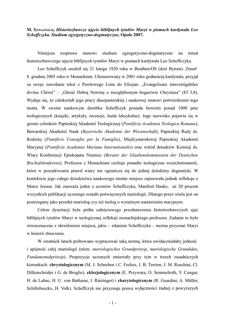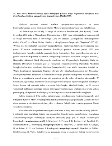 M. SZWAJNOCH, Historiozbawcze ujęcie biblijnych tytułów Maryi w pismach kardynała Leo Scheffczyka. Studium egzegetyczno-dogmatyczne, Opole 2007. Niniejsza rozprawa stanowi studium egzegetyczno-dogmatyczne na temat historiozbawczego ujęcia biblijnych tytułów Maryi w pismach kardynała Leo Scheffczyka. Leo Scheffczyk urodził się 21 lutego 1920 roku w Beuthen/OS (dziś Bytom). Zmarł 8. grudnia 2005 roku w Monachium. Uhonorowany w 2001 roku godnością kardynała, przyjął za swoje zawołanie tekst z Pawłowego Listu do Efezjan: „Evangelizare ininvestigabiles divitas Christi” – „Głosić Dobrą Nowinę o niezgłębionym bogactwie Chrystusa” (Ef 3,8). Wydaje się, Ŝe całokształt jego pracy duszpasterskiej i naukowej stanowi potwierdzenie tego motta. W swoim naukowym dorobku Scheffczyk posiada bowiem ponad 1000 prac teologicznych (ksiąŜki, artykuły, recenzje, hasła leksykalne). Jego nazwisko pojawia się w gronie członków Papieskiej Akademii Teologicznej (Pontificia Academia Teologica Romana), Bawarskiej Akademii Nauk (Bayerische Akademie der Wissenschaft), Papieskiej Rady ds. Rodziny (Pontificio Consiglio per la Famiglia), Międzynarodowej Papieskiej Akademii Maryjnej (Pontificia Academia Mariana Internationalis) oraz wśród doradców Komisji ds. Wiary Konferencji Episkopatu Niemiec (Berater der Glaubenskommission der Deutschen Bischofskonferenz). Profesora z Monachium cechuje ponadto teologiczna wszechstronność, która w poszukiwaniu prawd wiary nie ogranicza się do jednej dziedziny dogmatyki. W kontekście jego całego dziedzictwa naukowego istotne miejsce zajmowała jednak refleksja o Matce Jezusa. Jak zauwaŜa jeden z uczniów Scheffczyka, Manfred Hauke, aŜ 20 procent wszystkich publikacji uczonego zostało poświęconych mariologii. Dlatego przez wielu jest on postrzegany jako przedni mariolog czy teŜ teolog o wyraźnym nastawieniu maryjnym. Celem dysertacji była próba całościowego przedstawienia historiozbawczych ujęć biblijnych tytułów Maryi w teologicznej refleksji monachijskiego profesora. Zadanie to było równoznaczne z określeniem miejsca, jakie – zdaniem Scheffczyka – moŜna przyznać Maryi w historii zbawienia. W ostatnich latach próbowano wypracować taką normę, która uwidaczniałaby jedność i spójność całej mariologii (niem. mariologisches Grundprinzip, mariologische Grundidee, Fundamentalprinzip). Propozycje uczonych zmierzały przy tym w trzech zasadniczych kierunkach: chrystologicznym (M. J. Scheeben i C. Feckes, J. B. Terrien, J. M. Roschini, Cl. Dillenscheider i G. de Broglie), eklezjologicznym (E. Przywara, O. Semmelroth, Y. Congar, H. de Lubac, H. U. von Bathasar, J. Ratzinger) i charytologicznym (R. Guardini, A. Müller, Schillebeeckx, H. Volk). Scheffczyk nie przyznaje prawa wyłączności Ŝadnej z powyŜszych -1- koncepcji. Jego zdaniem kwestii tej nie rozwiązał równieŜ definitywnie VIII rozdział Konstytucji Lumen Gentium. Monachijski dogmatyk uwaŜa, Ŝe Sobór podał jedynie dwie wskazówki teoriopoznawcze, na podstawie których naleŜy konstruować wnioski dotyczące Maryi. Pierwszą z nich jest organiczny związek mariologii z nauką o zbawieniu, drugą zaś – korelacja z pozostałymi prawdami wiary. Na podstawie takich przesłanek uczony starał się wypracować odpowiednie kryterium usystematyzowania prawd mariologicznych. Fundamentalną zasadą porządkującą stała się dla niego historia zbawienia. W związku z tym to, co w teologii moŜna ująć w kategorię „systemu”, uczony utoŜsamił z wydarzeniem zbawczym (Heilsgeschehen). Jego centrum tworzy osoba i zbawcze dzieło Chrystusa. Tym samym wnioski teologiczne zyskują swoją wartość tylko wtedy, gdy prowadzą do obecnego w Chrystusie centrum zbawienia lub teŜ są z niego wyprowadzane. Zgodnie z takimi załoŜeniami większe znaczenie historiozbawcze przysługuje tym prawdom, które są usytuowane bliŜej osoby Odkupiciela. Dla Scheffczyka nie ulega wątpliwości, Ŝe właśnie osoba Maryi znajduje się w bezpośredniej bliskości zbawczego epicentrum skonkretyzowanego w jej Synu. Ostatecznie więc historia zbawienia i rola, jaką odegrała w niej Matka Jezusa, stanowią dla uczonego klucz do usystematyzowania teologicznych ujęć. Wśród nich waŜna pozostawała równieŜ próby odnalezienia teologicznych implikacji maryjnych tytułów biblijnych. W realizacji celu pracy zachowano systematyzujący charakter układu materiału. W rozdziale pierwszym, skoncentrowano się na przedstawieniu metodologicznych załoŜeń stanowiących istotny składnik w odkrywaniu biblijnego obrazu Maryi, na podstawie którego moŜna wyodrębnić poszczególne jej tytuły. Kluczowe znaczenie posiadało przy tym ustalenie historycznej wiarygodności biblijnych przekazów o Matce Chrystusa. Badania wykazały, Ŝe ostrej krytyce poddany został przez Scheffczyka aksjomat filozoficzno-światopoglądowy metody historyczno-krytycznej, który nie dopuszcza moŜliwości bezpośredniej interwencji Boga w konkretnych uwarunkowaniach społeczno-historycznych. Teksty biblijne, w tym takŜe te o charakterze mariologicznym, naleŜy odczytywać w duchu głębokiej wiary. Tylko taka postawa umoŜliwia zaakceptowanie zjawisk nadprzyrodzonych jako autentycznych wydarzeń historycznych i zbawczych. Stąd teŜ fakty biblijne o charakterze nadprzyrodzonym nie stanowią wytworu teologiczno-literackich załoŜeń redaktora, lecz wręcz przeciwnie – same stają się podstawą do poszukiwania odpowiedniej formy literackiej dla ich wyraŜenia. Niektóre twierdzenia dogmatyczne dotyczące historiozbawczych ujęć biblijnych tytułów Maryi zostały związane z koniecznością odwołania się do ustaleń hermeneutyki biblijnej. Umiejętne jej wykorzystanie w odkrywaniu sensu biblijnego umoŜliwiło głębsze -2- wniknięcie w misterium Matki Pana. W ten sposób historiozbawczej konkretyzacji nabrały starotestamentalne osoby, wydarzenia i wiodące idee, które na zasadzie typolo