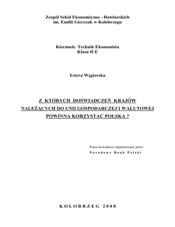 Zespół Szkół Ekonomiczno - Hotelarskich im. Emilii Gierczak w Kołobrzegu Kierunek: Technik Ekonomista Klasa II E Estera Węgierska Z KTÓRYCH DOŚWIADCZEŃ KRAJÓW NALEŻĄCYCH DO UNII GOSPODARCZEJ I WALUTOWEJ POWINNA KORZYSTAĆ POLSKA ? Praca na konkurs organizowany przez Narodowy Bank Polski KOŁOBRZEG 2008 Wstęp Przez pojęcie Unii Gospodarczej i Walutowej określa się złożony system współpracy państw Unii Europejskiej, (do której Polska przystąpiła 01 maja 2004 r.) dotyczący swobodnego przepływu towarów, osób, usług i kapitału, a także ustabilizowania kursów walutowych. Celem tych działań jest wprowadzenie wspólnej waluty, stopniowe ujednolicanie polityki monetarnej oraz koordynacja działań ekonomicznych i gospodarczych, a inaczej mówiąc celem Unii Gospodarczej i Walutowej jest integracja gospodarek krajów Unii Europejskiej. Dla Polski integracja ta oznacza osiągnięcie wyższego tj. podobnego do gospodarek państw zachodnioeuropejskich stopnia rozwoju oraz standardu życia obywateli. Tymczasem przeciętny Polak zarabia obecnie pięć razy mniej niż Niemiec, ale również wydajność pracowników w Polsce jest dwukrotnie niższa niż na Zachodzie. Aby nasze płace się zrównały polska gospodarka musi rozwijać się szybciej, niż gospodarki 15 krajów starej Unii. Realistyczne prognozy przewidują, że nasz Produkt Krajowy Brutto1 na jednego mieszkańca zrówna się z obecnym poziomem w Niemczech czy Francji za około 30 lat, ale i tak przez ten czas kraje unijne będą nam uciekać. Jak widać dogonienie Europy to ambitne i trudne zadanie, jednak nie jest to cel niemożliwy do zrealizowania. Jeszcze 30 lat temu w Irlandii sytuacja była podobna do tej, która obecnie panuje w Polsce, jednakże przeprowadzone przez Irlandczyków reformy spowodowały, że kraj ten zaczął rozwijać się w tempie 7% rocznie i obecnie PKB na jednego mieszkańca w Irlandii jest wyższy o 40% niż średnia w krajach Unii Europejskiej. Skuteczna pogoń za Europą wymaga reform, rozbudowy infrastruktury, pozyskania kapitału zza granicy, a wszystkie te działania wiążą się ze sobą. Polska musi m.in. dogłębnie zreformować rynek pracy, uprościć system podatkowy, zreformować finanse publiczne, wprowadzić ułatwienia dla przedsiębiorców, kontynuować prywatyzację. Wprowadzając reformy i podejmując działania zmierzające do osiągnięcia dojrzałej, dynamicznej i przy tym stabilnej gospodarki, Polska może korzystać z doświadczeń krajów, które wcześniej od nas przystąpiły do Unii Europejskiej, jaka istnieje w obecnym kształcie jak również może brać przykład z krajów, które równocześnie z nami przystąpiły do Unii Europejskiej, ale wprowadziły już reformy zapewniające im szybszy rozwój gospodarczy. Oczywiście korzystanie z tych doświadczeń polega nie tylko na powielaniu bądź adaptowaniu do naszych warunków doświadczeń pozytywnych, ale również na unikaniu doświadczeń negatywnych tj. błędów, które popełniły tamte państwa na drodze swojego rozwoju. Rynek Pracy Polska nie ma bogactw naturalnych, ale posiada olbrzymi potencjał rozwojowy, który stanowią ludzie i ich przedsiębiorczość. O nowoczesności kraju decyduje struktura zatrudnienia, 1 Produkt Krajowy Brutto (PKB) podstawowy miernik dochodu narodowego stosowany w rachunkowości narodowej. PKB opisuje wartość dóbr i usług finalnych wytworzonych na terenie danego kraju w określonej jednostce czasu. Wartość wytworzonych dóbr i usług finalnych oblicza się, odejmując od produkcji całkowitej wartość dóbr i usług zużytych do tej produkcji (wartość dodana). 2 która wpływa na efektywność wykorzystywania pracy ludzkiej oraz wskaźnik wykształcenia przedsiębiorców. W 15 krajach starej Unii dwie trzecie świadczących pracę jest zatrudniona w usługach, jedna trzecia w przemyśle, a tylko 5% w rolnictwie. Rolnictwo jest mało efektywne, dlatego miarą archaiczności struktury zatrudnienia jest ten właśnie wskaźnik. Wystarczy zauważyć, że w krajach wysoko rozwiniętych wynosi on poniżej 3% , a w Polsce wynosi około 15% tworząc zaledwie 4,8% wartości dodanej w gospodarce. Gorsze od nas w Europie są tylko Turcja i Rumunia np. na Węgrzech i w Polsce udział sektora rolnego w tworzeniu wartości dodanej, to efektywność węgierskiego rolnictwa jest znacznie wyższa, gdyż wartość ta jest tworzona tam przez 5% aktywnych zawodowo Węgrów. Spośród państw, które weszły do Unii Europejskiej w 2004 r. to Czechy uznawane są za najlepiej rozwinięte. Aż 47% ludności znajduje zatrudnienie w przemyśle. W Europie 37% stanowią wykwalifikowani pracownicy umysłowi w tym w Holandii, Finlandii czy Luksemburgu jest to blisko połowa ogółu wykwalifikowanych pracowników. To właśnie oni w największym stopniu tworzą postęp, a w Polsce ich odsetek stanowi niecałe 24 %, co stawia nasz kraj w najbardziej pod tym względem „zacofanej” – trójce państw kontynentu. Ponadto bardzo niska jest produktywność polskiego przemysłu, utrudnia ona rozwój usług, gdyż postęp technologiczny i wzrost wydajności pracy w przemyśle prowadzi poprzez względny wzrost cen usług to towarów przemysłowych do wzrostu zatrudnienia w sektorze usług, Słaba w Polsce jest również jakość kapitału ludzkiego. Przeważają osoby z wykształceniem zawodowym i średnim w wieku powyżej 35 lat, które mają ograniczoną zdolność do przekwalifikowania się, co wraz z nazbyt rozbudowanym systemem zabezpieczenia społecznego, w razie jakiegokolwiek kryzysu prowadzi do trwałego wypchnięcia tych osób poza rynek pracy. Inną cechą odróżniającą Polskę od państw Unii Europejskiej jest bardzo niski współczynnik aktywności zawodowej osób, które ukończyły 45 lat. Spowodowane to jest konstrukcją zabezpieczenia społecznego, na które składają się m.in.: renty inwalidzkie, wcześniejsze emerytury, zasiłki i świadczenia przedemerytalne oraz re