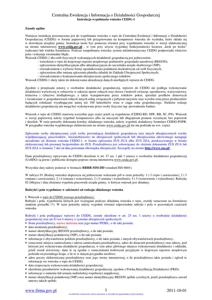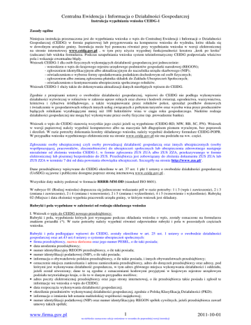 Centralna Ewidencja i Informacja o Działalności Gospodarczej Instrukcja wypełniania wniosku CEIDG-1 Zasady ogólne Niniejsza instrukcja przeznaczona jest do wypełniania wniosku o wpis do Centralnej Ewidencji i Informacji o Działalności Gospodarczej (CEIDG) w formie papierowej lub przygotowania na komputerze wniosku do wydruku, które składa się w dowolnym urzędzie gminy. Instrukcja moŜe być pomocna równieŜ przy wypełnianiu wniosku w wersji elektronicznej na stronie internetowej www.ceidg.gov.pl , w tym przy uŜyciu wygodnej funkcjonalności kreatora „krok po kroku” (zalecane) lub widoku formularza. Podczas uzupełniania wniosku system teleinformatyczny CEIDG podpowiada właściwe pola i wskazuje ewentualne błędy. Wniosek CEIDG-1 dla osób fizycznych wykonujących działalność gospodarczą jest jednocześnie: - wnioskiem o wpis do krajowego rejestru urzędowego podmiotów gospodarki narodowej (REGON); - zgłoszeniem identyfikacyjnym albo aktualizacyjnym do naczelnika urzędu skarbowego (NIP); - oświadczeniem o wyborze formy opodatkowania podatkiem dochodowym od osób fizycznych; - zgłoszeniem albo zmianą zgłoszenia płatnika składek do Zakładu Ubezpieczeń Społecznych; - oświadczeniem o kontynuowaniu ubezpieczenia społecznego rolników. Wniosek CEIDG-1 słuŜy takŜe do dokonywania aktualizacji danych nieobjętych wpisem do CEIDG. Zgodnie z przepisami ustawy o swobodzie działalności gospodarczej, wpisowi do CEIDG nie podlega wykonywanie działalności wytwórczej w rolnictwie w zakresie upraw rolnych oraz chowu i hodowli zwierząt, ogrodnictwa, warzywnictwa, leśnictwa i rybactwa śródlądowego, a takŜe wynajmowanie przez rolników pokoi, sprzedaŜ posiłków domowych i świadczenie w gospodarstwach rolnych innych usług związanych z pobytem turystów oraz wyrobu wina przez producentów będących rolnikami wyrabiającymi mniej niŜ 100 hektolitrów wina w ciągu roku gospodarczego. Niektóre rodzaje działalności gospodarczej nie mogą być wykonywane przez osoby fizyczne (np. prowadzenie banku). Wniosek o wpis do CEIDG stanowią wszystkie jego części jeŜeli są wypełnione (CEIDG-RD, MW, RB, SC, PN). Wniosek w wersji papierowej naleŜy wypełnić komputerowo albo na maszynie lub długopisem pismem wyraźnym, bez poprawek i skreśleń. W razie potrzeby dokonania korekty składanego wniosku, naleŜy wypełnić dodatkowy formularz CEIDG-POPR. W przypadku wniosku wypełnionego elektronicznie na stronie www.ceidg.gov.pl nie ma podziału na ww. części. Zgłoszenie osoby ubezpieczonej czyli osoby prowadzącej działalność gospodarczą oraz innych ubezpieczonych (osoby współpracującej, pracowników, zleceniobiorców) do ubezpieczeń społecznych lub ubezpieczenia zdrowotnego następuje niezaleŜnie od złoŜenia wniosku CEIDG-1, w formie zgłoszenia ZUS ZUA albo ZUS ZZA, przekazywanego w formie elektronicznej lub pisemnej bezpośrednio do ZUS. Przedsiębiorca jest zobowiązany do złoŜenia dokumentu ZUS ZUA lub ZUS ZZA w terminie 7 dni od dnia powstania obowiązku ubezpieczeń. Szczegóły na stronie http://www.zus.pl/ . Dane przedsiębiorcy wpisywane do CEIDG określone w art. 37 ust. 1 pkt 1 ustawy o swobodzie działalności gospodarczej (UoSDG) są jawne i publicznie dostępne poprzez stronę internetową www.ceidg.gov.pl . Wszystkie daty naleŜy podawać w formacie RRRR-MM-DD (standard ISO 8601). W rubryce 01 (Rodzaj wniosku) dopuszcza się jednoczesne wskazanie pól w razie potrzeby: 1 i 3 (wpis i zawieszenie), 2 i 3 (zmiana i zawieszenie), 2 i 4 (zmiana i wznowienie), 2 i 5 (zmiana i wykreślenie), 4 i 5 (wznowienie i wykreślenie). Rubrykę 02 (Miejsce i data złoŜenia) wypełnia pracownik urzędu gminy, w którym wniosek jest składany. Rubryki i pola wypełniane w zaleŜności od rodzaju składanego wniosku I. Wniosek o wpis do CEIDG nowego przedsiębiorcy: Rubryki i pola, wypełnienie których jest wymagane podczas składania wniosku o wpis, zostały oznaczone na formularzu znakiem gwiazdki (*). W razie potrzeby naleŜy wypełnić równieŜ odpowiednie rubryki i pola w pozostałych częściach wniosku. Rubryki i pola podlegające wpisowi do CEIDG, zostały określone w art. 25 ust. 1 ustawy o swobodzie działalności gospodarczej oraz art.43 ust.4 ustawy o systemie ubezpieczeń społecznych: • firma przedsiębiorcy, nazwa skrócona oraz jego numer PESEL, o ile taki posiada; • data urodzenia przedsiębiorcy; • numer identyfikacyjny REGON przedsiębiorcy, o ile taki posiada; • numer identyfikacji podatkowej (NIP), o ile taki posiada; • informacja o obywatelstwie polskim przedsiębiorcy, o ile takie posiada, i innych obywatelstwach przedsiębiorcy; • oznaczenie miejsca zamieszkania i adresu zamieszkania przedsiębiorcy, adres do doręczeń przedsiębiorcy oraz adresy, pod którymi jest wykonywana działalność gospodarcza, w tym adres głównego miejsca wykonywania działalności i oddziału, jeŜeli został utworzony; dane te są zgodne z oznaczeniami kodowymi przyjętymi w krajowym rejestrze urzędowym podziału terytorialnego kraju, o ile to w danym przypadku moŜliwe; • adres poczty elektronicznej przedsiębiorcy oraz jego strony internetowej, o ile przedsiębiorca takie posiada i zgłosił te informacje we wniosku o wpis do CEIDG; • data rozpoczęcia wykonywania działalności gospodarczej; • określenie przedmiotów wykonywanej działalności gospodarczej, zgodnie z Polską Klasyfikacją Działalności (PKD); • informacje o istnieniu lub ustaniu małŜeńskiej wspólności majątkowej; • numer identyfikacji podatkowej (NIP) oraz numer identyfikacyjny REGON spółek cywilnych, jeŜeli przedsiębiorca zawarł umowy takich spółek; www.firma.gov.pl 1 na niebiesko zaznaczono sekcje zmienione w stosunku do poprzedniej wersji instrukcji 2011-10-01 Centralna Ewidencja i Informacja o Działalności Gospodarczej Instrukcja wypełniania wniosku CEIDG-1 Formularz naleŜy wypełnić zgodnie ze stanem rzeczywistym, informa