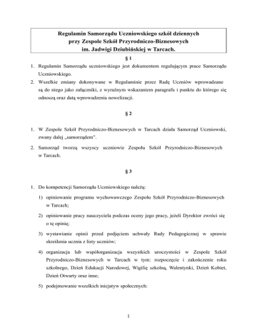 Regulamin Samorządu Uczniowskiego szkół dziennych przy Zespole Szkół Przyrodniczo-Biznesowych im. Jadwigi Dziubińskiej w Tarcach. §1 1. Regulamin Samorządu uczniowskiego jest dokumentem regulującym prace Samorządu Uczniowskiego. 2. Wszelkie zmiany dokonywane w Regulaminie przez Radę Uczniów wprowadzane są do niego jako załączniki, z wyraźnym wskazaniem paragrafu i punktu do którego się odnoszą oraz datą wprowadzenia nowelizacji. §2 1. W Zespole Szkół Przyrodniczo-Biznesowych w Tarcach działa Samorząd Uczniowski, zwany dalej „samorządem”. 2. Samorząd tworzą wszyscy uczniowie Zespołu Szkół Przyrodniczo-Biznesowych w Tarcach. §3 1. Do kompetencji Samorządu Uczniowskiego należą: 1) opiniowanie programu wychowawczego Zespołu Szkół Przyrodniczo-Biznesowych w Tarcach; 2) opiniowanie pracy nauczyciela podczas oceny jego pracy, jeżeli Dyrektor zwróci się o tę opinię; 3) wystawianie opinii przed podjęciem uchwały Rady Pedagogicznej w sprawie skreślenia ucznia z listy uczniów; 4) organizacja lub współorganizacja wszystkich uroczystości w Zespole Szkół Przyrodniczo-Biznesowych w Tarcach w tym: rozpoczęcie i zakończenie roku szkolnego, Dzień Edukacji Narodowej, Wigilię szkolną, Walentynki, Dzień Kobiet, Dzień Otwarty oraz inne; 5) podejmowanie wszelkich inicjatyw społecznych: 1 6) organizowanie pomocy uczniom nie radzącym sobie z nauką oraz motywowanie najlepszych do dalszego rozwoju. §4 1. Samorząd może przedstawić Radzie Pedagogicznej, Dyrektorowi, Radzie Rodziców wnioski i opinie we wszystkich sprawach Zespołu Szkół Przyrodniczo-Biznesowych, w szczególności dotyczących realizacji podstawowych praw ucznia takich jak: 1) prawo do zapoznania się z programem nauczania, z jego treścią, celem i stawianymi wymaganiami; 2) prawo do jawnej i motywowanej oceny postępów w nauce i zachowania; 3) prawo do organizacji życia szkolnego, umożliwiającego zachowanie właściwych proporcji między wysiłkiem szkolnym a możliwością rozwijania i zaspakajania własnych zainteresowań; 4) prawo organizowania działalności kulturalnej, oświatowej, sportowej oraz rozrywkowej zgodnie z własnymi potrzebami i możliwościami organizacyjnymi w porozumieniu z Dyrektorem Zespołu Szkół Przyrodniczo-Biznesowych w Tarcach; 5) prawo wyboru nauczyciela pełniącego rolę opiekuna samorządu. §5 1. Głównymi organami samorządu jest: 1) Rada Uczniów składająca się z przewodniczących poszczególnych klas i ich zastępców. 2. Rada Uczniów spośród swoich członków wybiera: 1) Przewodniczącego; 2) Zastępcę Przewodniczącego; 3) Rzecznika Praw Ucznia 4) Sekretarza; 5) Koordynatora do spraw finansowych 3. Każdy z członków funkcyjnych Rady Uczniów może pełnić tylko jedną funkcję. 2 §6 1. Osobami uprawnionymi do kandydowania na członków funkcyjnych Rady Uczniów są Przewodniczący i Zastępcy przewodniczącego w poszczególnych klas 2. Osobami uprawnionymi do wyboru członków funkcyjnych Rady Uczniów są przedstawiciele Rady Uczniów, o której mowa w § 5 pkt.1. 3. W wyborach członków funkcyjnych biorą udział zawsze dwaj przedstawiciele każdej klasy (Przewodniczący Klasy oraz jego Zastępca). 4. W przypadku nieobecności którejś z osób wymienionych w § 6 pkt.3, podczas wyborów członków funkcyjnych muszą zastąpić je Skarbnik Klasowy lub, jeśli to nie jest możliwe, inny przedstawiciel danej klasy, tak by każda klasa miała dwóch przedstawicieli. 5. Oddelegowani przez klasę uczniowie, zastępujący osoby wymienione w § 6 pkt.3 nie mogą kandydować na członków funkcyjnych Samorządu Uczniowskiego. 6. Wybory odbywają się zawsze w październiku. 7. Głosowanie jest tajne i równe. 8. Komisję wyborczą stanowią dwaj losowo wybrani przedstawiciele Rady Uczniów. 9. Wybory przeprowadzane są pod nadzorem nauczyciela, pełniącego obowiązki opiekuna samorządu. 10. Nowi członkowie funkcyjni Samorządu Uczniowskiego zostają zaprezentowani społeczności szkolnej podczas najbliższego apelu szkolnego. §7 1. Rada Uczniów jest jedynym organem mogącym wprowadzić zmiany w regulaminie samorządu 2. Członkowie Rady Uczniów mają obowiązek regulaminowo uczestniczyć w zebraniach i konferencjach samorządu. 3. Rada Uczniów podejmuje decyzje zwykłą większością głosów. 4. Aby głosowanie Rady Uczniów było ważne, musi w nim wziąć udział co najmniej 60% wszystkich członków Rady Uczniów.. 5. Wszyscy członkowie Rady Uczniów mają prawo do zgłaszania projektów uchwał. 3 6. Rada Uczniów ma prawo odwołać każdego członka Prezydium, jeżeli wotum nieufności wobec wyżej wymienionych osób poprze co najmniej 70% członków Rady Uczniów. 7. Uchwały podjęte przez Radę Uczniów wchodzą w życie po sprawdzeniu ich zgodności z aktualnymi przepisami. 8. Przewodniczący klas i ich Zastępca mogą zostać dyscyplinarnie wykluczeni z Rady Uczniów za powtarzające się nieusprawiedliwione nieobecności na zebraniach, na czas określony przez Prezydium Samorządu. 9. Przewodniczący klas mają obowiązek informować swoich kolegów i wychowawcę oddziału o najbliższych planach i akcjach, które przedstawiono na zebraniu Rady Uczniów. §8 1. Przewodniczący Samorządu jest głównym reprezentantem ogółu uczniów. 2. Przewodniczący koordynuje działania Rady Uczniów oraz pozostałych członków Prezydium. 3. Przewodniczący prowadzi obrady Samorządu Uczniowskiego. 4. W przypadku, gdy Prezydium, bądź Rada Uczniów nie jest w stanie podjąć decyzji ze względu na równy podział głosów za i przeciw, o podjęciu lub odrzuceniu uchwały decyduje Przewodniczący. 5. Kadencja Przewodniczącego trwa rok. 6. Przewodniczący z uzasadnionej przyczyny może podać się do dymisji przed zakończeniem kadencji. 7. W przypadku podania się Przewodniczącego do dymisji przed zakończeniem kadencji, jego obowiązki przejmuje wskazany przez niego kandydat, po uprzednim przegłosowaniu jego kandy
