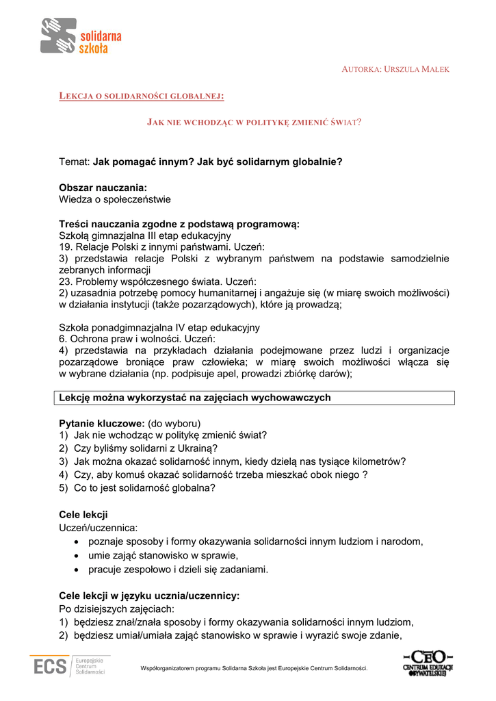 AUTORKA: URSZULA MAŁEK LEKCJA O SOLIDARNOŚCI GLOBALNEJ : JAK NIE WCHODZĄC W POLITYKĘ ZMIENIĆ ŚWIAT? Temat: Jak pomagać innym? Jak być solidarnym globalnie? Obszar nauczania: Wiedza o społeczeństwie Treści nauczania zgodne z podstawą programową: Szkołą gimnazjalna III etap edukacyjny 19. Relacje Polski z innymi państwami. Uczeń: 3) przedstawia relacje Polski z wybranym państwem na podstawie samodzielnie zebranych informacji 23. Problemy współczesnego świata. Uczeń: 2) uzasadnia potrzebę pomocy humanitarnej i angażuje się (w miarę swoich możliwości) w działania instytucji (także pozarządowych), które ją prowadzą; Szkoła ponadgimnazjalna IV etap edukacyjny 6. Ochrona praw i wolności. Uczeń: 4) przedstawia na przykładach działania podejmowane przez ludzi i organizacje pozarządowe broniące praw człowieka; w miarę swoich możliwości włącza się w wybrane działania (np. podpisuje apel, prowadzi zbiórkę darów); Lekcję można wykorzystać na zajęciach wychowawczych Pytanie kluczowe: (do wyboru) 1) Jak nie wchodząc w politykę zmienić świat? 2) Czy byliśmy solidarni z Ukrainą? 3) Jak można okazać solidarność innym, kiedy dzielą nas tysiące kilometrów? 4) Czy, aby komuś okazać solidarność trzeba mieszkać obok niego ? 5) Co to jest solidarność globalna? Cele lekcji Uczeń/uczennica: poznaje sposoby i formy okazywania solidarności innym ludziom i narodom, umie zająć stanowisko w sprawie, pracuje zespołowo i dzieli się zadaniami. Cele lekcji w języku ucznia/uczennicy: Po dzisiejszych zajęciach: 1) będziesz znał/znała sposoby i formy okazywania solidarności innym ludziom, 2) będziesz umiał/umiała zająć stanowisko w sprawie i wyrazić swoje zdanie, Współorganizatorem programu Solidarna Szkoła jest Europejskie Centrum Solidarności. 3) będziesz kształcić umiejętność pracy w zespole, a także będziesz dzielić się zadaniami. Czas: 2 godziny lekcyjne (1 godzina lekcyjna w zależności od wykorzystania poszczególnych części lekcji i pracy z filmem) Metody i formy pracy: „światła”, rozmowa w parach, burza mózgów, mapa myśli, praca w grupach, praca z multimediami Słowa kluczowe: Solidarność globalna, Majdan, Ukraina, wydarzenia na Ukrainie Przebieg zajęć 1. Poproś uczniów, aby w Mapach Google https://www.google.pl/maps/preview (dostęp: 04.04.2014) odszukali Majdan w Kijowie. Wykorzystaj opcje Street View, a także zdjęcia tradycyjne i widok satelitarny https://www.google.com/maps/place/Maidan/@50.4501,30.523399,17z/data=!4m2!3m1! 1s0x40d4ce5007ce8455:0xcb8ab981175b5fad (dostęp: 04.04.2014). Następnie poproś ich o skojarzenia na temat „Majdanu w Kijowie”. Skojarzenia możesz wypisywać w sposób tradycyjny na tablicy lub z wykorzystaniem chmury wyrazów. W tym drugim przypadku zastosuj jeden z programów: TagCrowd http://tagcrowd.com/ (dostęp: 04.04.2014; możliwość wyboru języka polskiego); Wordle http://www.wordle.net/create (dostęp: 04.04.2014); ImageChef Word Mosaic http://www.imagechef.com/ic/word_mosaic/ (dostęp: 04.04.2014) Połącz uczniów w dwójki i zleć im, aby porozmawiali wokół dwóch pytań: Z jakimi wydarzeniami kojarzy wam się „Majdan w Kijowie”? Jakie zdarzenia miały tam miejsce? Tym razem również uczniowie mogą przygotować odpowiedź na pytania z wykorzystaniem chmury wyrazów. Zachęć ich do tego, a podczas omawiania powstałych prac zadaj uczniom pytania: Co było łatwe? Co było trudne? Uwaga! 1. Uczniowie mogą odpowiadać na pytania pracując w parach i przeglądając mapy Google. 2. Do przygotowania zajęć możesz wykorzystać również samouczek https://support.google.com/earth/answer/148176?hl=pl&rd=1 (dostęp: 04.04.2014). Współorganizatorem programu Solidarna Szkoła jest Europejskie Centrum Solidarności. Na zakończenie pracy w tej części zajęć podaj cele lekcji i sprawdź sposób ich zrozumienia za pomocą świateł (czerwona kartka „nie rozumiem”, zielona „rozumiem”, żółta „rozumiem częściowo”). 2. Zaprezentuj uczniom fragment filmu „Zróbmy coś” Helsińskiej Fundacji Praw Człowieka http://youtu.be/UoSLf6aS-CA (dostęp: 04.04.2014; czas 0:00 – 0:51) i zadaj im pytanie: Czy można nie wchodząc w politykę zmienić świat? I tym razem również poproś o odpowiedź stosując światła; z tym, że kartka zielona oznacza „tak”, czerwona „nie”; żółta „i tak i nie”. Następnie poinformuj uczniów, że za chwile obejrzą fragment film (lub cały film) dotyczący tego problemu. Odtwórz fragment (0:00 – 8:14) filmu „Zróbmy coś” Helsińskiej Fundacji Praw Człowieka http://youtu.be/UoSLf6aS-CA (dostęp: 04.04.2014; czas), a po zakończeniu emisji poproś uczniów o pierwsze refleksje. Np. zadaj pytania: Co szczególnie zapamiętałeś? lub Jakie emocje wzbudził w Tobie fragment filmu? Uwaga! W zależności od tego, czy zajęcia zostały zaplanowane na 45 min, czy 90 min (jedna, czy dwie lekcje) możesz wykorzystać cały film (23:33) „Zróbmy, coś” lub jego części (0:00 – 8:14). Pamiętaj zawsze, aby przed emisją fragmentu uczniowie obejrzeli początek, czyli 0:00 – 0:51. Podziel uczniów na grupy i poproś, aby na podstawie filmu odpowiedzieli na pytanie. Jak nie wchodząc w politykę zmienić świat? Zadaniem uczniów będzie podanie konkretnych przykładów odwołując się do filmu. Zadanie uczniowie mogą wykonać w formie mapy myśli, a jako techniczną instrukcję do pracy pokaż im link http://youtu.be/ZpvruFwRQR0 dostęp: 04.04.2014. Pamiętaj o wyznaczeniu czasu pracy. Zleć zespołom, aby jeszcze raz obejrzały fragment filmu „Zróbmy, coś” http://youtu.be/ZpvruFwRQR0 (dostęp: 04.04.2014) (czas: 13:10 – 19:20) i zastanowiły się, co jeszcze mogą dopisać do swojej mapy. Tym razem również wyznacz czas pracy, a po jego zakończeniu poproś o podzielenie się wiadomościami. Grupy kolejno będą przedstawiały – po jednej - uzyskane informacje; z tym, 