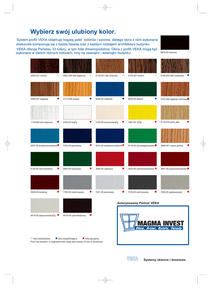 Wybierz swój ulubiony kolor. System profili VEKA obejmuje bogatą palet´ kolorów i wzorów, dlatego okna z nich wykonane doskonale komponują się z kaŜdą fasadą oraz z kaŜdym rodzajem architektury budynku. VEKA oferuje Państwu 33 kolory, w tym folie drewnopodobne. Okna z profili VEKA mogą być wykonane w dwóch róŜnych kolorach; inny na zewnątrz i wewnątrz budynku. 8875.05 bràzowy 2065.021 mahoƒ 2052.089 dàb bagienny 2178.001 dàb z∏ocisty 2178.007 orzech 3156.003 dàb rustykalny 3069.037 daglezja 2115.008 oregon 5030.05 niebieski 6005.05 zielony 3152.009 daglezja cieniowana 1179.002 biel antyczna 9152.05 bia∏y 1379.05 kremowobia∏y 1087.05 ˝ó∏ty 3118.076 jasny dàb 5007.05 brylantowoniebieski 5150.05 granatowy 5013.05 kobaltowoniebieski 6110.05 szmaragdowozielony 3069.041 sosna górska 6125.05 ciemnozielony 6004.05 turkusowy 3054.05 czerwony 3003.05 rubinowoczerwony 3081.05 purpurowoczerwony 3005.05 bordowy 7155.05 srebrnoszary 7251.05 jasnoszary 7016.05 ciemnoszary 7038.05 agatowoszary Autoryzowany Partner VEKA 9018.05 papirusowobia∏y 8518.05 czarnobràzowy folia standardowa folia uzupe∏niajàca folia specjalna Pomi´dzy drukiem, a oryginalnà folià mogà wyst´powaç ró˝nice w odcieniach. Systemy okienne i drzwiowe.