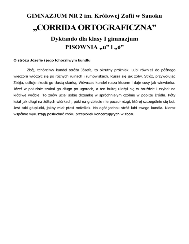 GIMNAZJUM NR 2 im. Królowej Zofii w Sanoku „CORRIDA ORTOGRAFICZNA” Dyktando dla klasy I gimnazjum PISOWNIA „u” i „ó” O stróżu Józefie i jego tchórzliwym kundlu Zbój, tchórzliwy kundel stróża Józefa, to okrutny próżniak. Lubi również do późnego wieczora włóczyć się po różnych ruinach i rumowiskach. Rusza się jak żółw. Stróż, przywołując Zbója, usiłuje skusić go tłustą skórką. Wówczas kundel rusza kłusem i daje susy jak wiewiórka. Józef w południe szukał go długo po ugorach, a ten hultaj ułożył się w bruździe i czyhał na kłótliwe wróble. To znów uciął sobie drzemkę w spróchniałym czółnie w pobliżu źródła. Póty leżał jak długi na żółtych wiórkach, póki na grzbiecie nie poczuł rózgi, której szczególnie się boi. Jest taki głupiutki, jakby miał ptasi móżdżek. Na ogół jednak stróż lubi swego kundla. Nieraz wspólnie wyruszają posłuchać chóru przepiórek koncertujących w zbożu.