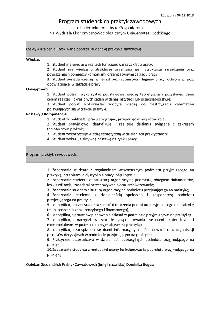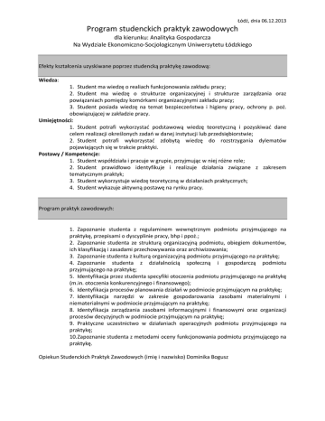 Łódź, dnia 06.12.2013 Program studenckich praktyk zawodowych dla kierunku: Analityka Gospodarcza Na Wydziale Ekonomiczno-Socjologicznym Uniwersytetu Łódzkiego Efekty kształcenia uzyskiwane poprzez studencką praktykę zawodową: Wiedza: 1. Student ma wiedzę o realiach funkcjonowania zakładu pracy; 2. Student ma wiedzę o strukturze organizacyjnej i strukturze zarządzania oraz powiązaniach pomiędzy komórkami organizacyjnymi zakładu pracy; 3. Student posiada wiedzę na temat bezpieczeństwa i higieny pracy, ochrony p. poż. obowiązującej w zakładzie pracy. Umiejętności: 1. Student potrafi wykorzystać podstawową wiedzę teoretyczną i pozyskiwać dane celem realizacji określonych zadań w danej instytucji lub przedsiębiorstwie; 2. Student potrafi wykorzystać zdobytą wiedzę do rozstrzygania dylematów pojawiających się w trakcie praktyki. Postawy / Kompetencje: 1. Student współdziała i pracuje w grupie, przyjmując w niej różne role; 2. Student prawidłowo identyfikuje i realizuje działania związane z zakresem tematycznym praktyk; 3. Student wykorzystuje wiedzę teoretyczną w działaniach praktycznych; 4. Student wykazuje aktywną postawę na rynku pracy. Program praktyk zawodowych: 1. Zapoznanie studenta z regulaminem wewnętrznym podmiotu przyjmującego na praktykę, przepisami o dyscyplinie pracy, bhp i ppoż.; 2. Zapoznanie studenta ze strukturą organizacyjną podmiotu, obiegiem dokumentów, ich klasyfikacją i zasadami przechowywania oraz archiwizowania; 3. Zapoznanie studenta z kulturą organizacyjną podmiotu przyjmującego na praktykę; 4. Zapoznanie studenta z działalnością społeczną i gospodarczą podmiotu przyjmującego na praktykę; 5. Identyfikacja przez studenta specyfiki otoczenia podmiotu przyjmującego na praktykę (m.in. otoczenia konkurencyjnego i finansowego); 6. Identyfikacja procesów planowania działań w podmiocie przyjmującym na praktykę; 7. Identyfikacja narzędzi w zakresie gospodarowania zasobami materialnymi i niematerialnymi w podmiocie przyjmującym na praktykę; 8. Identyfikacja zarządzania zasobami informacyjnymi i finansowymi oraz organizacji procesów decyzyjnych w podmiocie przyjmującym na praktykę; 9. Praktyczne uczestnictwo w działaniach operacyjnych podmiotu przyjmującego na praktykę; 10.Zapoznanie studenta z metodami oceny funkcjonowania podmiotu przyjmującego na praktykę. Opiekun Studenckich Praktyk Zawodowych (imię i nazwisko) Dominika Bogusz Łódź, dnia 06.12.2013 Program studenckich praktyk zawodowych dla kierunku: Ekonomia (studia stacjonarne) Na Wydziel Ekonomiczno-Socjologicznym Uniwersytetu Łódzkiego Efekty kształcenia uzyskiwane poprzez studencką praktykę zawodową: Wiedza: W efekcie odbytych praktyk student zdobywa i poszerza praktyczną wiedzę na temat: a) warunków funkcjonowania i organizacji rynku podmiotu przyjmującego na praktykę; b) zasad funkcjonowania odpowiednio przedsiębiorstw, instytucji państwowych i samorządowych lub organizacji społecznych; c) planowania, organizacji i przebiegu procesów gospodarczych; d) sposobów obsługi klienta; e) różnych praktycznych aspektów funkcjonowania podmiotu przyjmującego na praktykę w tym zasad finansowania i kultury organizacyjnej; f) interakcji podmiotów gospodarczych z instytucjami państwowymi Umiejętności: W wyniku odbytych praktyk student potrafi: a) analizować procesy gospodarcze; b) pracować w zespole; c) wykonywać obowiązki zgodne z organizacją i strukturą danej jednostki; d) sporządzać określoną dokumentację i odpowiednio ją archiwizować; e) dokumentować czas pracy i opracować sprawozdanie z realizowanych zadań w ramach praktyk. Postawy / Kompetencje: W wyniku praktyk student będzie posiadał zdolność do funkcjonowania na krajowym lub międzynarodowym rynku pracy. Pozna wybrane przez siebie środowisko zawodowe. Zweryfikuje swoje predyspozycje zawodowe. Zwiększy świadomość o obszarach wiedzy, które musi pogłębić aby być wartościowym pracownikiem w określonej dziedzinie. Pozna oczekiwania pracodawców w zakresie wiedzy, umiejętności i postaw wobec przyszłych pracowników. Nawiąże kontakty zawodowe. Program praktyk zawodowych: 1. Zapoznanie studenta z regulaminem wewnętrznym podmiotu przyjmującego na praktykę, przepisami o dyscyplinie pracy, bhp i ppoż.; 2. Zapoznanie studenta ze strukturą organizacyjną podmiotu, obiegiem dokumentów, ich klasyfikacją i zasadami przechowywania oraz archiwizowania; 3. Zapoznanie studenta z kulturą organizacyjną podmiotu przyjmującego na praktykę; 4. Zapoznanie studenta z działalnością społeczną i gospodarczą podmiotu przyjmującego na praktykę; 5. Identyfikacja przez studenta specyfiki otoczenia podmiotu przyjmującego na praktykę (m.in. otoczenia konkurencyjnego i finansowego); 6. Identyfikacja procesów planowania działań w podmiocie przyjmującym na praktykę; 7. Identyfikacja narzędzi w zakresie gospodarowania zasobami materialnymi i niematerialnymi w podmiocie przyjmującym na praktykę; 8. Identyfikacja zarządzania zasobami informacyjnymi i finansowymi oraz organizacji procesów decyzyjnych w podmiocie przyjmującym na praktykę; 9. Praktyczne uczestnictwo w działaniach operacyjnych podmiotu przyjmującego na praktykę; 10.Zapoznanie studenta z metodami oceny funkcjonowania podmiotu przyjmującego na praktykę. Opiekun Studenckich Praktyk Zawodowych (imię i nazwisko) prof. Stanisław Szukalski Łódź, dnia 06.12.2013 Program studenckich praktyk zawodowych dla kierunku: Ekonomia (studia niestacjonarne) Na Wydziel Ekonomiczno-Socjologicznym Uniwersytetu Łódzkiego Efekty kształcenia uzyskiwane poprzez studencką praktykę zawodową: Wiedza: W efekcie odbytych praktyk student zdobywa i poszerza praktyczną wiedzę na temat: a) warunków funkcjonowania i organizacji rynku podmiotu przyjmującego na praktykę; b) zasad funkcjonowania odpowiednio przedsiębiorstw, instytucji państwowych i samorządowych lub organizacji