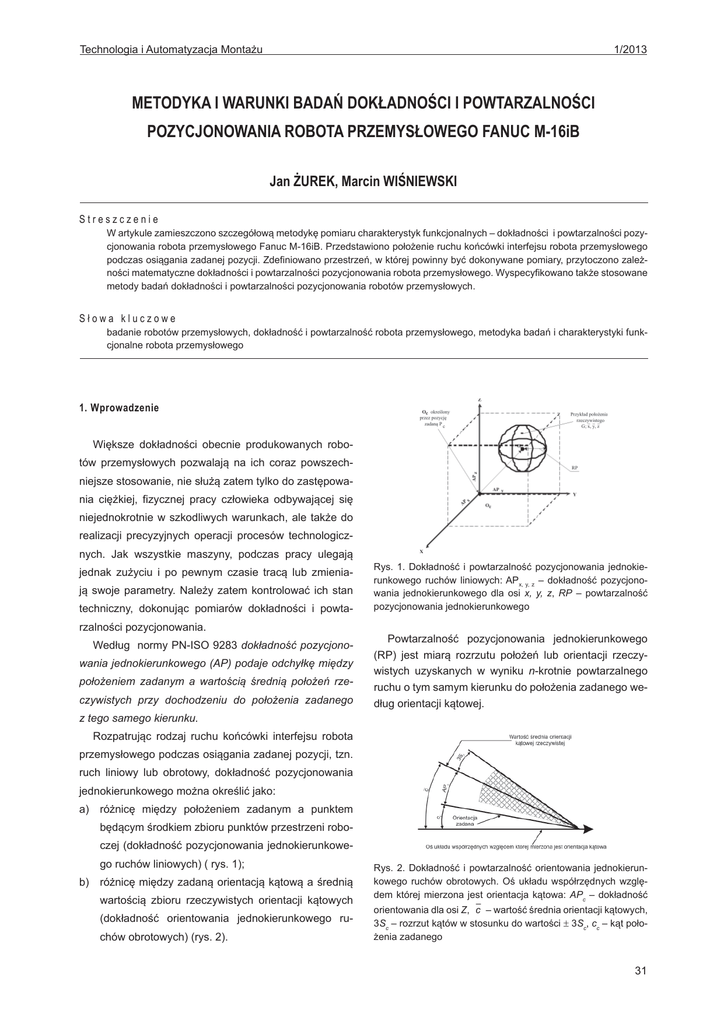 Technologia i Automatyzacja Montażu 1/2013 METODYKA I WARUNKI BADAŃ DOKŁADNOŚCI I POWTARZALNOŚCI POZYCJONOWANIA ROBOTA PRZEMYSŁOWEGO FANUC M-16iB Jan ŻUREK, Marcin WIŚNIEWSKI Streszczenie W artykule zamieszczono szczegółową metodykę pomiaru charakterystyk funkcjonalnych – dokładności i powtarzalności pozycjonowania robota przemysłowego Fanuc M-16iB. Przedstawiono położenie ruchu końcówki interfejsu robota przemysłowego podczas osiągania zadanej pozycji. Zdefiniowano przestrzeń, w której powinny być dokonywane pomiary, przytoczono zależności matematyczne dokładności i powtarzalności pozycjonowania robota przemysłowego. Wyspecyfikowano także stosowane metody badań dokładności i powtarzalności pozycjonowania robotów przemysłowych. Słowa kluczowe badanie robotów przemysłowych, dokładność i powtarzalność robota przemysłowego, metodyka badań i charakterystyki funkcjonalne robota przemysłowego 1. Wprowadzenie Większe dokładności obecnie produkowanych robotów przemysłowych pozwalają na ich coraz powszechniejsze stosowanie, nie służą zatem tylko do zastępowania ciężkiej, fizycznej pracy człowieka odbywającej się niejednokrotnie w szkodliwych warunkach, ale także do realizacji precyzyjnych operacji procesów technologicznych. Jak wszystkie maszyny, podczas pracy ulegają jednak zużyciu i po pewnym czasie tracą lub zmieniają swoje parametry. Należy zatem kontrolować ich stan techniczny, dokonując pomiarów dokładności i powtarzalności pozycjonowania. Według normy PN-ISO 9283 dokładność pozycjonowania jednokierunkowego (AP) podaje odchyłkę między położeniem zadanym a wartością średnią położeń rzeczywistych przy dochodzeniu do położenia zadanego Rys. 1. Dokładność i powtarzalność pozycjonowania jednokierunkowego ruchów liniowych: APx, y, z – dokładność pozycjonowania jednokierunkowego dla osi x, y, z, RP – powtarzalność pozycjonowania jednokierunkowego Powtarzalność pozycjonowania jednokierunkowego (RP) jest miarą rozrzutu położeń lub orientacji rzeczywistych uzyskanych w wyniku n-krotnie powtarzalnego ruchu o tym samym kierunku do położenia zadanego według orientacji kątowej. z tego samego kierunku. Rozpatrując rodzaj ruchu końcówki interfejsu robota przemysłowego podczas osiągania zadanej pozycji, tzn. ruch liniowy lub obrotowy, dokładność pozycjonowania jednokierunkowego można określić jako: a) różnicę między położeniem zadanym a punktem będącym środkiem zbioru punktów przestrzeni roboczej (dokładność pozycjonowania jednokierunkowego ruchów liniowych) ( rys. 1); b) różnicę między zadaną orientacją kątową a średnią wartością zbioru rzeczywistych orientacji kątowych (dokładność orientowania jednokierunkowego ruchów obrotowych) (rys. 2). Rys. 2. Dokładność i powtarzalność orientowania jednokierunkowego ruchów obrotowych. Oś układu współrzędnych względem której mierzona jest orientacja kątowa: APc – dokładność orientowania dla osi Z, c – wartość średnia orientacji kątowych, 3Sc – rozrzut kątów w stosunku do wartości 3Sc, cc – kąt położenia zadanego 31 1/2013 2. Metodyka badań W celu prawidłowego przeprowadzenia pomiaru charakterystyk funkcjonalnych robota przemysłowego Fanuc M-16iB należy go ustalić i zamocować zgodnie z instrukcją obsługi. Służy do tego płyta o grubości 30 mm mocowana do podłoża za pomocą czterech kotew mocowanych chemicznie (pręt gwintowany osadzony w podłożu na zasadzie wklejania masą na bazie żywic) i dokręcona nakrętkami M20 wykonanymi w klasie wytrzymałości 4.8 momentem 186 Nm. Do płyty mocowana jest podstawa robota za pomocą czterech śrub M16 o klasie wytrzymałości 12.9, dokręconych momentem 314 Nm [4]. Minimalna montażowa powierzchnia serwisowa wynosi 1,55 m2, a realizacja finalnego etapu instalacji robota przemysłowego dotycząca kontroli wszystkich osi za pomocą instalowanych czujników (powierzchnia kontrolna) wynosi 0,54 m2. Wymiary określające powierzchnię serwisową i kontrolną przedstawia rys. 3 [4]. Technologia i Automatyzacja Montażu Następnie należy skontrolować temperaturę pracy robota przemysłowego (określona jest przez producenta – nie dotyczy badania pełzania charakterystyk pozycjonowania); producent określa dopuszczalną podczas pracy robota przemysłowego temperaturę otoczenia 0° – 45°C oraz podczas transportu i magazynowania -20° – 60°C przy współczynniku temperaturowym równym 1,1°C/min [4]. Użytkownik ma możliwość zmiany nastaw parametrów robota, które mogą mieć wpływ na badane charakterystyki. Podczas każdego pomiaru powinny być zachowane stałe warunki, a wartości parametrów należy zamieścić w protokole badań [2]. Badania robota przemysłowego Fanuc M-16iB przeprowadza się w warunkach pracy (warunkach środowiska) zalecanych przez producenta: – dopuszczalna wilgotność względna otoczenia: 30% – 96%, bez kondensacji (nie większa niż 75HR), – w przypadku instalacji w środowisku o dużym zanieczyszczeniu (kurz, płyny słabo przewodzące, rozpuszczalniki organiczne, kwasy, gaz i/lub sól powodujące przyspieszenie korozji) należy stosować środki dodatkowej ochrony, – wartość drgań powinna być mniejsza od 0,5 G, – nie zaleca się instalacji powyżej 1000 m nad poziomem morza, – w przypadku promieniowania jonizującego i niejonizującego (mikrofalowe, promienie ultrafioletowe, wiązki promieni lasera i/lub promieniowanie rentgenowskie) należy stosować dodatkowe ekranowanie. Dodatkowe warunki badań robota przemysłowego są następujące: Rys. 3. Schemat robota: a) – wymagana przestrzeń serwisowa i ustawienia finalnego robota przemysłowego Fanuc M-16iB, b) – pozycja i parametry ustawienia finalnego [4] 32 – osie układu współrzędnych powinny być równoległe do podstawowego układu współrzędnych, – badany punkt powinien być usytuowany względem inte