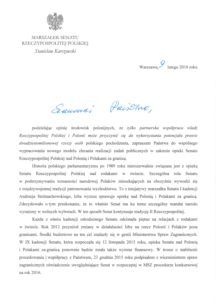 MARSZALEK SENATU RZECZYPOSPOLITEJ POLSKIEJ Stanislaw Karczewski Warszawa, 9 lutego 2016 roku podzielajC}C Oplllly srodowisk polonijnych, ze tyfko partnerska wsp6/praca w/adz Rzeczypospolitej Polskiej i Polonii mote przyczynic si(j do wykorzystania potencjalu prawie dwudziestomilionowej rzeszy os6b polskiego pochodzenia, zapraszam Panstwa do wsp6lnego wypracowania nowego modelu zlecania realizacji zadan publicznych w zakresie opieki Senatu Rzeczypospolitej Polskiej nad Poloni'l i Polakami za granicC}. Historia polskiego parlamentaryzmu po 1989 roku nierozerwalnie zwiC}zana jest z opiek'l Senatu Rzeczypospolitej Polskiej nad rodakami w swiecie. Szczeg6lna rola Senatu w podtrzymywaniu tozsamosci narodowej Polak6w mieszkajC}cych na obczyznie wywodzi siy z miydzywojennej tradycji patronowania wychodzstwu. To z inicjatywy marszalka Senatu I kadencji Andrzeja Stelmachowskiego, Izba wyzsza sprawuje opieky nad Poloni'l i Polakami za graniq. Zdecydowalo o tym przekonanie, ze to wlasnie Senat rna ku temu szczeg6lny mandat narodu wyrazony w wolnych wyborach. W ten spos6b Senat kontynuuje tradycjy II Rzeczypospolitej. Kazda z osmiu kadencji odrodzonego Senatu odcisnyla piytno na relacjach z rodakami w swiecie. Rok 2012 przyni6sl zmiany w dzialalnosci Izby na rzecz Polonii i Polak6w poza granicami. Srodki budzetowe na ten eel znalazly siy w gestii Ministerstwa Spraw Zagranicznych. W IX kadencji Senatu, kt6ra rozpoczyla siy 12 listopada 2015 roku, opieka Senatu .nad Poloni'l i Polakami za granic'l ponownie bydzie miala tak:Ze wymiar finansowy. W trosce o stabilnosc procedowania i wsp6lpracy z Panstwem, 23 grudnia 2015 roku podpisalem z wiceministrem spraw zagranicznych oswiadczenie uwzglydniajC}ce Senat w rozpoczytej w MSZ procedurze konkursowej narok 2016. Senat juz teraz chcialby prawidlowo rozpoznac wsp6lczesne potrzeby Polonii i Polak6w za granicq tak, by w efekcie stworzyc model opieki oraz procedury finansowania, kt6re pozwolq je skutecznie zaspokoic i kreowac sp6jnq polityk(( polonijnq. W zwiqzku z tym zwracam siy z prosbq do srodowisk polonijnych oraz wsp6lpracujqcych z nimi organizacji pozarzqdowych o wyrazenie opinii, zgloszenie propozycji i uwag dotyczqcych PaiJ.stwa doswiadczen z realizacji zadan publicznych w zakresie opieki nad Poloniq i Polakami za gramcq oraz wsp6lpracy z organami wladzy publicznej w ostatnim cwiercwieczu. Bydzie to pomocne w ocenie kondycji srodowisk organizacji oraz wyzwaiJ., jakie rysujq siy we wzajemnych relacjach na przyszlosc. Odpowiedzi przeslane do Kancelarii Senatu bydq przedmiotem naszych analiz i posluzq wypracowaniu mozliwie najlepszego sposobu finansowania opieki nad Poloniq i Polakami za granicq na nast((pne lata. Proszy kierowac je do konca marca 2016 roku na adres korespondencyjny: Kancelaria Senatu Biuro Analiz i Dokumentacji Zesp61 ds. Polonijnych ul. Wiejska 6 00-902 Warszawa lube-mail: [email protected] 2