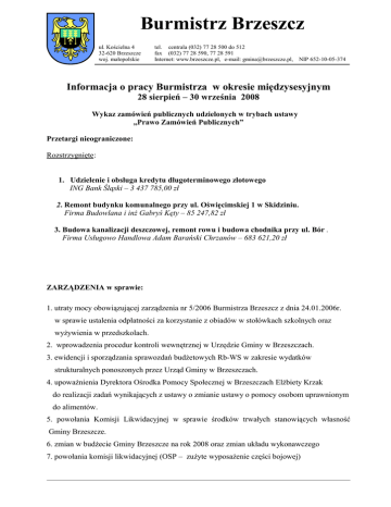 Burmistrz Brzeszcz ul. Kościelna 4 32-620 Brzeszcze woj. małopolskie tel. centrala (032) 77 28 500 do 512 fax (032) 77 28 590, 77 28 591 Internet: www.brzeszcze.pl, e-mail: [email protected], NIP 652-10-05-374 Informacja o pracy Burmistrza w okresie międzysesyjnym 28 sierpień – 30 września 2008 Wykaz zamówień publicznych udzielonych w trybach ustawy „Prawo Zamówień Publicznych” Przetargi nieograniczone: Rozstrzygnięte: 1. Udzielenie i obsługa kredytu długoterminowego złotowego ING Bank Śląski – 3 437 785,00 zł 2. Remont budynku komunalnego przy ul. Oświęcimskiej 1 w Skidziniu. Firma Budowlana i inż Gabryś Kęty – 85 247,82 zł 3. Budowa kanalizacji deszczowej, remont rowu i budowa chodnika przy ul. Bór . Firma Usługowo Handlowa Adam Barański Chrzanów – 683 621,20 zł ZARZĄDZENIA w sprawie: 1. utraty mocy obowiązującej zarządzenia nr 5/2006 Burmistrza Brzeszcz z dnia 24.01.2006r. w sprawie ustalenia odpłatności za korzystanie z obiadów w stołówkach szkolnych oraz wyżywienia w przedszkolach. 2. wprowadzenia procedur kontroli wewnętrznej w Urzędzie Gminy w Brzeszczach. 3. ewidencji i sporządzania sprawozdań budżetowych Rb-WS w zakresie wydatków strukturalnych ponoszonych przez Urząd Gminy w Brzeszczach. 4. upoważnienia Dyrektora Ośrodka Pomocy Społecznej w Brzeszczach Elżbiety Krzak do realizacji zadań wynikających z ustawy o zmianie ustawy o pomocy osobom uprawnionym do alimentów. 5. powołania Komisji Likwidacyjnej w sprawie środków trwałych stanowiących własność Gminy Brzeszcze. 6. zmian w budżecie Gminy Brzeszcze na rok 2008 oraz zmian układu wykonawczego 7. powołania komisji likwidacyjnej (OSP – zużyte wyposażenie części bojowej) SPOTKANIA: 1 września 3 września 4 września 5 września 5 września 7 września 7 września 8 września 10 września 11 września 14 września W Zespole Szkolno-Przedszkolnym nr 3 im. Kostka Jagiełły odbyła się uroczystość inauguracji roku szkolnego 2008/2009. Wraz z przedstawicielami dzieci, młodzieży i organizacji lokalnych uczciliśmy rocznicę wybuchu II wojny światowej składając wieńce kwiatów pod pomnikiem "Ku czci poległych w walce z faszyzmem" w Parku Miejskim przy ul Kościuszki ,na cmentarzu komunalnym w Brzeszczach - pod pomnikiem „Żołnierzy Wojska Polskiego poległych we wrześniu 1939 r. w bitwie pod Rajskiem” , w Jawiszowicach-Kółku pod pomnikiem „Poległych na polu chwały w Jawiszowicach”. oraz w Zasolu pod pomnikiem "Kostka Jagiełły". Spotkanie robocze przedstawicieli KWK Brzeszcze – Silesia i urzędu gminy w sprawie realizacji umów dotyczących naprawy szkód górniczych na majątku gminy Uczestniczyliśmy w obchodach 69 rocznicy Boju pod Rajskiem Spotkanie z burmistrzami Kęt i Chełmka i wójtem Gminy Oświęcim w sprawie współpracy Lokalnej Grupy Działania Dolina Soły W Oświęcimiu odbył się III Piknik Organizacji Pozarządowych. W tym dniu zostały wręczone nagrody dla najlepszej inicjatywy realizowanej przez organizacje pozarządowe i inne podmioty prowadzące działalność pożytku publicznego za 2007 rok. Fundacja Pomocy Społecznej w Brzeszczach otrzymała nagrodę za najlepszą inicjatywę "Los Motyla" . W gronie laureatów znalazła się również druga nasza organizacja - Stowarzyszenie "Amazonek" z siedzibą w Brzeszczach, która otrzymała dyplom za inicjatywę „Wygrajmy tę wojnę”. W Pikniku wzięły również udział stowarzyszenia: Diabetyków, Bios i Cykliści. W Przecieszynie odbyła się uroczystość 60-lecia Koła Łowieckiego RYŚ oraz otwarcie Strzelnicy. W Częstochowie, na Jasnej Górze odbywały się Dożynki Centralne. W związku z organizacją Dożynek Powiatowo-Diecezjalnych zaproszenie otrzymała nasza gmina. W dożynkach uczestniczyła delegacja w składzie, Pani Burmistrz Teresa Jankowska, Ks. Kazimierz Kulpa dziekan dekanatu Jawiszowickiego, zespól regionalny Skidzinianie oraz Przewodnicząca Koła Gospodyń Wiejskich w Brzeszczach Pani Kazimiera Kołodziejczyk. W Myślenicach odbyła się Konferencja Infrastruktura i Środowisko. W konferencji udział wzięli: Minister Rozwoju Regionalnego Bieńkowska i Marszalek Marek Sowa. W Rajsku odbyło się Walne Zebranie członków LGD Dolina Soły. Dokonano wyboru Zarządu i Komisji Rewizyjnej. Na basenie „Pod Platanem” odbyły się po raz piąty zawody pływackie dla uczniów klas IV. Celem zawodów było podsumowanie całorocznej nauki pływania dla klas III w roku szkolnym 2007/2008, wręczenie odznak „Już pływam” i dyplomów 215 uczniom, którzy zdobyli umiejętność pływania, a także wyłonienie mistrzów pływania z rocznika 1998. 14 września 2008 roku w naszej gminie, w sołectwie Jawiszowice odbyły się Dożynki Gminno-Powiatowo-Diecezjalne. To był dla nas wielki zaszczyt, że święto dziękczynne za szczęśliwie zebrane tegoroczne plony odbyło się właśnie u nas. 29 września Dzięki zaangażowaniu wielu instytucji, organizacji i mieszkańców mogliśmy godnie przyjąć zaproszonych rolników, hodowców, sadowników, przedstawicieli Prezydenta RP, parlamentu, administracji rządowej, samorządów województwa małopolskiego, powiatu oświęcimskiego, gminnego i duchowieństwo oraz reprezentacje dekanatów i parafii diecezji bielsko-żywieckiej. Funkcję Starostów dożynek pełnili Pani Urszula Galoch i Jakub Korczyk . Pani Urszula Galoch mieszka wraz z mężem Ryszardem w Jawiszowicach. Oboje są rodzicami dwójki dzieci: 18-letniego Pawła i 21-letniej Elżbiety. Uprawiane przez rodzinę Galochów gospodarstwo rolne liczy 4,5 hektara gruntów. Pani Urszula specjalizuje się w uprawach zbóż i nasion oleistych. Posiada nowoczesny park maszynowy: kombajn zbożowy, ciągnik i maszyny do prac rolnych. Oprócz gospodarstwa rolnego Państwo Galochowie prowadzą na terenie Brzeszcz skład materiałów sypkich „GRUDEX”. Pan Jakub Korczyk wraz z żoną Teresą mieszka i pracuje w Jawiszowicach. Posiada gospodarstwo ro