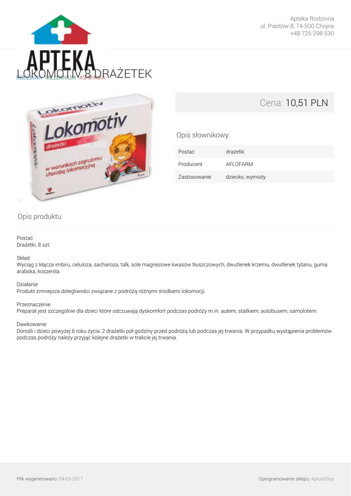 Apteka Rodzinna ul. Piastów 8, 74-500 Chojna +48 725 298 530 LOKOMOTIV 8 DRAŻETEK Cena: 10,51 PLN Opis słownikowy Postać drażetki Producent AFLOFARM Zastosowanie dziecko, wymioty Opis produktu Postać Drażetki, 8 szt. Skład Wyciąg z kłącza imbiru, celuloza, sacharoza, talk, sole magnezowe kwasów tłuszczowych, dwutlenek krzemu, dwutlenek tytanu, guma arabska, koszenila. Działanie Produkt zmniejsza dolegliwości związane z podróżą różnymi środkami lokomocji. Przeznaczenie Preparat jest szczególnie dla dzieci które odczuwają dyskomfort podczas podróży m.in. autem, statkiem, autobusem, samolotem. Dawkowanie Dorośli i dzieci powyżej 6 roku życia: 2 drażetki pół godziny przed podróżą lub podczas jej trwania. W przypadku wystąpienia problemów podczas podróży należy przyjąć kolejne drażetki w trakcie jej trwania. Plik wygenerowano: 04-03-2017 Powered by TCPDF (www.tcpdf.org) Oprogramowanie sklepu: AptusShop