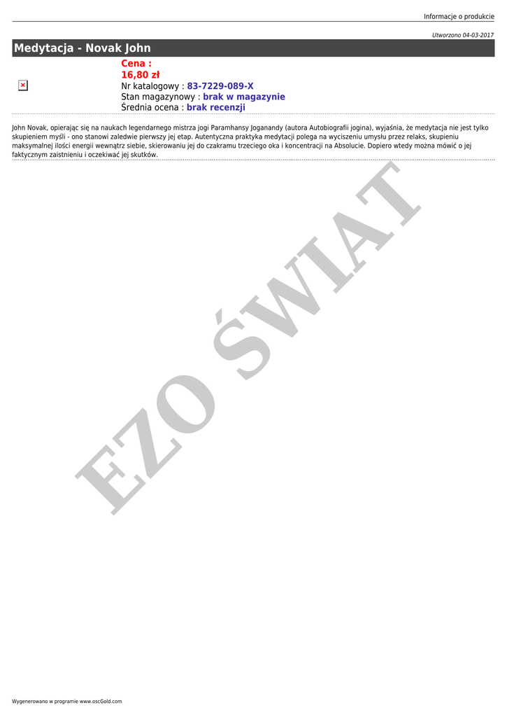 Informacje o produkcie Utworzono 04-03-2017 Medytacja - Novak John Cena : 16,80 zł Nr katalogowy : 83-7229-089-X Stan magazynowy : brak w magazynie Średnia ocena : brak recenzji EZ O ŚW IA T John Novak, opierając się na naukach legendarnego mistrza jogi Paramhansy Joganandy (autora Autobiografii jogina), wyjaśnia, że medytacja nie jest tylko skupieniem myśli - ono stanowi zaledwie pierwszy jej etap. Autentyczna praktyka medytacji polega na wyciszeniu umysłu przez relaks, skupieniu maksymalnej ilości energii wewnątrz siebie, skierowaniu jej do czakramu trzeciego oka i koncentracji na Absolucie. Dopiero wtedy można mówić o jej faktycznym zaistnieniu i oczekiwać jej skutków. Wygenerowano w programie www.oscGold.com