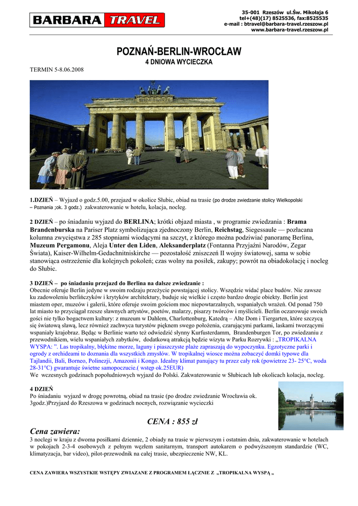 35-001 Rzeszów ul.Św. Mikołaja 6 tel+(48)(17) 8525536, fax:8525535 e-mail : [email protected] www.barbara-travel.rzeszow.pl POZNAŃ-BERLIN-WROCŁAW 4 DNIOWA WYCIECZKA TERMIN 5-8.06.2008 1.DZIEŃ – Wyjazd o godz.5.00, przejazd w okolice Słubic, obiad na trasie (po drodze zwiedzanie stolicy Wielkopolski zakwaterowanie w hotelu, kolacja, nocleg. – Poznania ;ok. 3 godz.) 2 DZIEŃ – po śniadaniu wyjazd do BERLINA; krótki objazd miasta , w programie zwiedzania : Brama Brandenburska na Pariser Platz symbolizująca zjednoczony Berlin, Reichstag, Siegessaule — pozłacana kolumna zwycięstwa z 285 stopniami wiodącymi na szczyt, z którego moŜna podziwiać panoramę Berlina, Muzeum Pergamonu, Aleja Unter den Liden, Aleksanderplatz (Fontanna Przyjaźni Narodów, Zegar Świata), Kaiser-Wilhelm-Gedachnitniskirche — pozostałość zniszczeń II wojny światowej, sama w sobie stanowiąca ostrzeŜenie dla kolejnych pokoleń; czas wolny na posiłek, zakupy; powrót na obiadokolację i nocleg do Słubic. 3 DZIEŃ – po śniadaniu przejazd do Berlina na dalsze zwiedzanie : Obecnie oferuje Berlin jedyne w swoim rodzaju przeŜycie powstającej stolicy. Wszędzie widać place budów. Nie zawsze ku zadowoleniu berlińczyków i krytyków architektury, buduje się wielkie i często bardzo drogie obiekty. Berlin jest miastem oper, muzeów i galerii, które oferuje swoim gościom moc niepowtarzalnych, wspaniałych wraŜeń. Od ponad 750 lat miasto to przyciągał rzesze sławnych artystów, poetów, malarzy, pisarzy twórców i myślicieli. Berlin oczarowuje swoich gości nie tylko bogactwem kultury: z muzeum w Dahlem, Charlottenburg, Katedrą – Alte Dom i Tiergarten, które szczycą się światową sławą, lecz równieŜ zachwyca turystów pięknem swego połoŜenia, czarującymi parkami, laskami tworzącymi wspaniały krajobraz. Będąc w Berlinie warto teŜ odwiedzić słynny Kurfusterdamm, Brandenburgen Tor, po zwiedzaniu z przewodnikiem, wielu wspaniałych zabytków, dodatkową atrakcją będzie wizyta w Parku Rozrywki : „TROPIKALNA WYSPA: ”. Las tropikalny, błękitne morze, laguny i piaszczyste plaŜe zapraszają do wypoczynku. Egzotyczne parki i ogrody z orchideami to doznania dla wszystkich zmysłów. W tropikalnej wiosce moŜna zobaczyć domki typowe dla Tajlandii, Bali, Borneo, Polinezji, Amazonii i Kongo. Idealny klimat panujący tu przez cały rok (powietrze 23- 25°C, woda 28-31°C) gwarantuje świetne samopoczucie.( wstęp ok.25EUR) We wczesnych godzinach popołudniowych wyjazd do Polski. Zakwaterowanie w Słubicach lub okolicach kolacja, nocleg. 4 DZIEŃ Po śniadaniu wyjazd w drogę powrotną, obiad na trasie (po drodze zwiedzanie Wrocławia ok. 3godz.)Przyjazd do Rzeszowa w godzinach nocnych, rozwiązanie wycieczki CENA : 855 zł Cena zawiera: 3 noclegi w kraju z dwoma posiłkami dziennie, 2 obiady na trasie w pierwszym i ostatnim dniu, zakwaterowanie w hotelach w pokojach 2-3-4 osobowych z pełnym węzłem sanitarnym, transport autokarem o podwyŜszonym standardzie (WC, klimatyzacja, bar video), pilot-przewodnik na całej trasie, ubezpieczenie NW, KL. CENA ZAWIERA WSZYSTKIE WSTĘPY ZWIAZANE Z PROGRAMEM ŁĄCZNIE Z „TROPIKALNA WYSPĄ „