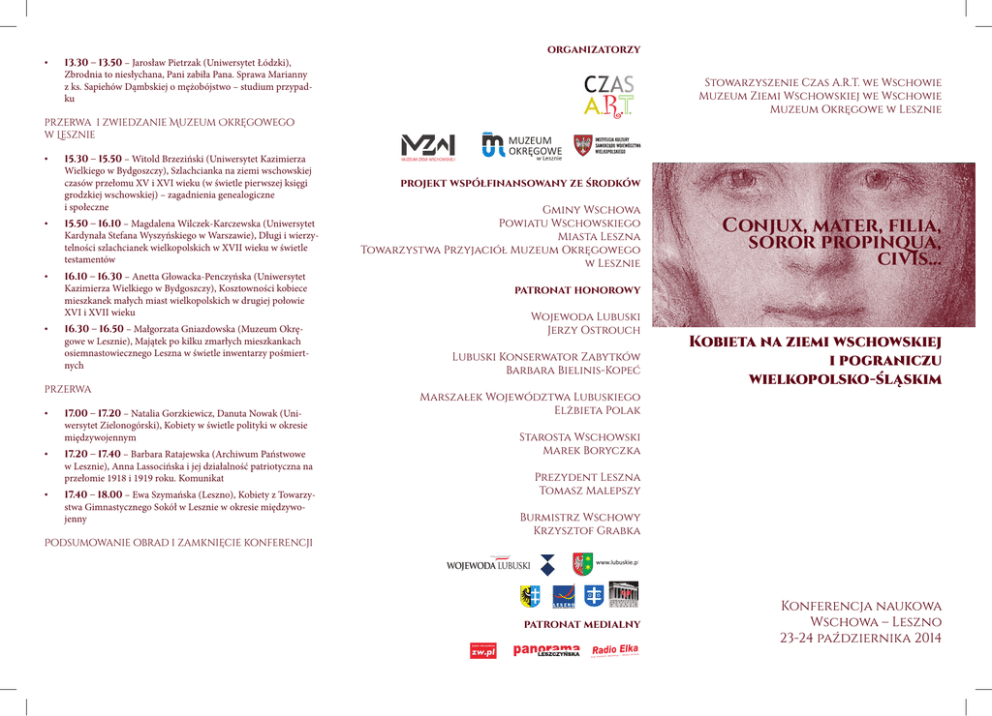 • 13.30 – 13.50 – Jarosław Pietrzak (Uniwersytet Łódzki), Zbrodnia to niesłychana, Pani zabiła Pana. Sprawa Marianny z ks. Sapiehów Dąmbskiej o mężobójstwo – studium przypadku organizatorzy Stowarzyszenie Czas A.R.T. we Wschowie Muzeum Ziemi Wschowskiej we Wschowie Muzeum Okręgowe w Lesznie przerwa i zwiedzanie Muzeum Okręgowego w Lesznie • 15.30 – 15.50 – Witold Brzeziński (Uniwersytet Kazimierza Wielkiego w Bydgoszczy), Szlachcianka na ziemi wschowskiej czasów przełomu XV i XVI wieku (w świetle pierwszej księgi grodzkiej wschowskiej) – zagadnienia genealogiczne i społeczne • 15.50 – 16.10 – Magdalena Wilczek-Karczewska (Uniwersytet Kardynała Stefana Wyszyńskiego w Warszawie), Długi i wierzytelności szlachcianek wielkopolskich w XVII wieku w świetle testamentów • 16.10 – 16.30 – Anetta Głowacka-Penczyńska (Uniwersytet Kazimierza Wielkiego w Bydgoszczy), Kosztowności kobiece mieszkanek małych miast wielkopolskich w drugiej połowie XVI i XVII wieku • 16.30 – 16.50 – Małgorzata Gniazdowska (Muzeum Okręgowe w Lesznie), Majątek po kilku zmarłych mieszkankach osiemnastowiecznego Leszna w świetle inwentarzy pośmiertnych przerwa • • • 17.00 – 17.20 – Natalia Gorzkiewicz, Danuta Nowak (Uniwersytet Zielonogórski), Kobiety w świetle polityki w okresie międzywojennym 17.20 – 17.40 – Barbara Ratajewska (Archiwum Państwowe w Lesznie), Anna Lassocińska i jej działalność patriotyczna na przełomie 1918 i 1919 roku. Komunikat 17.40 – 18.00 – Ewa Szymańska (Leszno), Kobiety z Towarzystwa Gimnastycznego Sokół w Lesznie w okresie międzywojenny Podsumowanie obrad i zamknięcie konferencji projekt współfinansowany ze środków Gminy Wschowa Powiatu Wschowskiego Miasta Leszna Towarzystwa Przyjaciół Muzeum Okręgowego w Lesznie Conjux, mater, filia, soror propinqua, civis... patronat honorowy Wojewoda Lubuski Jerzy Ostrouch Lubuski Konserwator Zabytków Barbara Bielinis-Kopeć Kobieta na ziemi wschowskiej i pograniczu wielkopolsko-śląskim Marszałek Województwa Lubuskiego Elżbieta Polak Starosta Wschowski Marek Boryczka Prezydent Leszna Tomasz Malepszy Burmistrz Wschowy Krzysztof Grabka patronat medialny Konferencja naukowa Wschowa – Leszno 23-24 października 2014 PROGRAM 23 października 2014 Wschowa, Zamek Królewski 9.00 – rozpoczęcie konferencji przerwa i zwiedzanie Muzeum Ziemi Wschowskiej • 15.30 – 15.50 – Justyna Bąk (Uniwersytet Wrocławski), Pomiędzy grzechem a pięknem. Kobieta i melancholia w kulturze staropolskiej na podstawie źródeł z terenów Wielkopolski • 15.50 – 16.10 – Anna Kulińska (Leszno), „Pamiątka wieczna nigdy nie ustaje...” Refleksje nad losem kobiet z rodziny Szlichtyngów na podstawie związanych z nimi artefaktów z XVII i XVIII wieku • 16.10 – 16.30 – Katarzyna Sanocka-Tureczek (Muzeum Lubuskie im. Jana Dekerta w Gorzowie Wlkp.), Kobieca codzienność na przykładzie płyt nagrobnych z lapidarium we Wschowie • 9.20 – 9.40 – Krzysztof Gładkowski (Uniwersytet Warmińsko-Mazurski w Olsztynie), Antropologia kobiety • 9.40 – 10.00 – Emilia Kostka (Uniwersytet Zielonogórski), Pozycja żeńskich bóstw w panteonie pogańskich mitologii Europy • 10.00 – 10.20 – Justyna Żychlińska (Uniwersytet Kazimierza Wielkiego w Bydgoszczy), Kobieta na ziemi wschowskiej – portret archeologiczny • 10.20 – 10.40 – Agnieszka Łachowska (Uniwersytet Zielonogórski), Wizerunek kobiety odświętnej pogranicza wielkopolsko-śląsko-łużyckiego w świetle wiejskich strojów ludowych od XIX wieku do 1945 roku 16.30 – 16.50 – Marta Małkus (Muzeum Ziemi Wschowskiej we Wschowie), Anna Susanna Teschner (1709-1728) – portret zapisany w kamieniu i na papierze • 16.50 – 17.10 – Paweł Łachowski (Uniwersytet Zielonogórski), Z prowincji do stolicy. Droga rozwoju poetki Anny Louisy Karsch • przerwa • 11.00 – 11.20 – Marcin A. Klemenski (Uniwersytet Jagielloński w Krakowie), Jadwiga, księżniczka żagańska, królowa polska i księżna legnicka. Słów parę o królewskim mariażu Kazimierza Wielkiego we Wschowie w 1365 roku • 11.20 – 11.40 – Joanna Partyka (Instytut Badań Literackich PAN w Warszawie), „Die liebe Dorel”. Dorota Sybilla, księżna na Brzegu i Legnicy i jej polska legenda • 11.40 – 12.00 – Agnieszka Jakuboszczak (Uniwersytet Adama Mickiewicza w Poznaniu), Aby zostać matką królów. Wizerunek Marii Leszczyńskiej w jej dokumentach ślubnych przerwa • 12.10 – 12.30 – Joanna Kasprowicz (Uniwersytet Zielonogórski), Błogosławiona Jolenta i księżna Anna – fundatorki klasztorów klarysek w Wielkopolsce i księstwie śląskim • 12.30 – 12.50 – Anna Sutowicz (Wrocław), Dzieje pewnego konfliktu. Klaryski wrocławskie w obronie swojej tożsamości religijnej na przełomie epok • 12.50 – 13.10 – Alojzy Pańczak OFM (Osieczna), Bernardynki we Wschowie 1505-1592 • 13.10 – 13.30 – Jolanta Pawłowska (Wschowa), Bohaterka w habicie elżbietańskim. Iwona Maria Anna Król CSSE przerwa • 18.00 – 18.20 – Jacek Wójcicki (Instytut Badań Literackich PAN w Warszawie), Świat kobiecy w domowej i rodzinnej poezji okolicznościowej hrabiego Rafała Gurowskiego • 18.20 – 18.40 – Małgorzata Mieszek (Uniwersytet Łódzki), Reprezentantki rodziny Radomickich w twórczości literackiej jezuitów • 18.40 – 19.00 – Michał Kuran (Uniwersytet Łódzki), Obraz kobiety z kręgu ziemi wschowskiej w literaturze okolicznościowej XVII i XVIII wieku (małżeństwo, zakon, pogrzeb) – wybrane przykłady 19.30 – promocja książki Rycerze – szlachta – ziemianie. Szlachetnie urodzeni na ziemi wschowskiej i pograniczu wielkopolskośląskim, będącej pokłosiem konferencji z 2012 roku 24 października 2014 Leszno, Muzeum Okręgowe 9.30 – rozpoczęcie obrad • 9.40 – 10.00 – Andrzej Klonder (Uniwersytet Kazimierza Wielkiego w Bydgoszczy), Dialogi kobiet i o kobietach. Stereo