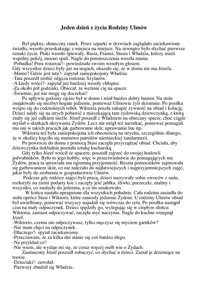 Jeden dzień z życia Rodziny Ulmów Był piękny, słoneczny ranek. Przez szparki w drzwiach zaglądało zaciekawione światło, wesoło przeskakując z miejsca na miejsce. Na zewnątrz było słychać pierwsze oznaki życia. Ptaki wesoło śpiewały. Basia, Franuś, Stasia i Władziu, którzy mieli wspólny pokój, mocno spali. Nagle do pomieszczenia weszła mama. -Pobudka! Pora wstawać!- powiedziała swoim wesołym głosem. Gdy wszystkie dzieci były już na nogach, okazało się, że w domu nie ma Józefa. -Mamo? Gdzie jest tata?- zapytał zaniepokojony Władziu. -Tata poszedł zrobić zdjęcia rodzinie Szylarów. -A kiedy wróci?- zapytał już bardziej wesoły chłopiec -Za około pół godzinki. Obiecał, że weźmie cię na spacer. -Świetnie, już nie mogę się doczekać! Po upływie godziny ojciec był w domu i miał bardzo dobry humor. Na stole znajdowało się niezbyt bogate jedzenie, ponieważ Ulmowie żyli skromnie. Po posiłku wzięto się do codziennych robót. Wiktoria poszła zakupić żywność na obiad i kolację. Dzieci udały się na strych pobawić z mieszkającą tam żydowską dziewczynką, z którą znały się już całkiem nieźle. Józef poszedł z Władziem na obiecany spacer, choć ciągle myślał o skutkach ukrywania Żydów. Lecz nie mógł też narzekać, ponieważ pomagali mu oni w takich pracach jak garbowanie skór, uprawianie lnu itp. Wiktoria też była zaniepokojona ich obecnością na strychu, szczególnie dlatego, że w okolicy kręciło się mnóstwo patrolów niemieckiej żandarmerii. Po powrocie do domu z pomocą Stasi zaczęła przyrządzać obiad. Chciała, aby dziewczynka dokładnie poznała sztukę kucharską. Gdy tylko Józef wrócił ze spaceru, poszedł zajrzeć do swojej hodowli jedwabników. Było to jego hobby, więc w przeciwieństwie do pomagających mu Żydów, praca ta sprawiała mu ogromną przyjemność. Reszta pomocników zajmowała się garbowaniem skór, co nie należało do najłatwiejszych i najprzyjemniejszych zajęć, jakie były do zrobienia w gospodarstwie Ulmów. Podczas gdy rodzice zajęci byli pracą, dzieci nazrywały sobie owoców z sadu, rozłożyły na ziemi podarty koc i zaczęły jeść jabłka, śliwki, porzeczki, maliny i wszystko, co znalazły do jedzenia, a co im smakowało. W końcu nastało upragnione dla wszystkich południe. Cała rodzina zasiadła do stołu oprócz Stasi i Wiktorii, które zaniosły jedzenie Żydom. U rodziny Ulmów obiad był uwielbiany, ponieważ wszyscy najadali się wówczas do syta. Po posiłku nastąpił czas na mały odpoczynek. Dzieci spędziły go, wylegując się w ciepłym słońcu. Wiktoria, zamiast odpoczywać, zaczęła myć naczynia. Nagle do kuchni wtargnął Józef. -Wiktorio, czemu nie odpoczywasz, tylko męczysz się myciem garnków? -Nie mam chęci na odpoczynek. -Dlaczego?- spytał zaciekawiony. -Przeczuwam, że za kilka dni stanie się coś bardzo złego. -Na przykład co? -Nie wiem, ale wydaje mi się, że coraz więcej osób wie o Żydach. Zasmucony Józef poszedł zobaczyć, co słychać u dzieci. Zastał je drzemiące na trawie. -Dzieciaki!- zawołał. Pierwszy zbudził się Władziu. -Tak, tatku? O co chodzi? -Chcecie pójść ze mną w pole i porobić kilka zdjęć? -Pewnie! Stasia, Franuś, Basia wstawajcie! Szybko! -Co się dzieje?- zapytał drugi chłopiec. -Idziemy robić zdjęcia z tatą! -Świetnie! Po chwili byli w polach. Wokoło rosło mnóstwo ślicznych kwiatów, które przepięknie pachniały. -Ach, tu jest pięknie- zachwycał się Stasiu. -Antosiu, choć zrobić zdjęcie!- zawołał rozpromieniony tata. Gdy każdy samodzielnie wykonał zdjęcie, udali się do domu. Zastała ich tam nieprzyjemna cisza. Zaczęli szukać mamy, lecz oprócz Żydów w domu nie było nikogo. Pomysłowa Basia pobiegła zobaczyć, czy jej mamy nie ma u sąsiadów. Dopiero u dalekich znajomych znalazła ją rozmawiającą z pewną kobietą. -Mamo! Mamo! Tak długo cię szukałam- krzyknęła dziewczynka. -Witaj Basiu! Po co przybiegłaś tu za mną? – mama była zdziwiona. -Myśleliśmy, że się zgubiłaś. -Och, ty głuptasku. Zawsze wpadnie ci coś do głowy. -A ciekawe co ty byś zrobiła, gdybyś w domu nie ujrzała nikogo oprócz Żyd..., to znaczy oprócz nikogo- Basia w ostatniej chwili ugryzła się w język. -No dobrze, wracam już do domu. Do widzenia – krzyknęła do znajomej. Gdy już trochę oddaliły się od domu sąsiadki, Wiktoria zwróciła się do dziewczynki: -Czy ty nie wiesz, że ta kobieta to straszna plotkarka! Gdyby się dowiedziała, że przetrzymujemy Żydów, pewnie nie szłabyś tu ze mną! -Przepraszam. Przejęzyczyłam się- odpowiedziała ze skruchą Basia. Zapadał już wieczór. Słońce chowało się za horyzont. Księżyc zaczął powolną wędrówkę po swojej gwiaździstej drodze. Mimo zmroku w małym domku Wiktorii i Józefa życie nadal wrzało pełną parą. Wiktoria ścieliła łóżka najmłodszym członkom rodziny. Józef sprzątał narzędzia, które były mu potrzebne do garbowania skóry. Dzieci bawiły się w teatrzyk cieni przy świecach. Żydzi układali się spać, co było bardzo wyraźnie słychać w całym domu. -Dzieci, pora do łóżek!- zaczęła jak codziennie mama. -Nie, jeszcze nie- odpowiedziały chórem. -Mam zawołać tatę, czy pójdziecie spać? – zagroziła Wiktoria. Po tych słowach wszystkie dzieci wskoczyły do łóżek i zasnęły. W domu nastała cisza. Wiktoria próbowała jeszcze haftować, ale świece dawały bardzo mało światła, więc zrezygnowała. Zmęczona położyła się spać. Na odpoczynek nie udał się jeszcze tylko Józef, który usiadłszy na ławce przed domem, zaczął do późna rozmyślać o niebezpieczeństwie grożącym jego rodzinie. Doskonale wiedział, jaka kara spotyka Polaków za przechowywanie Żydów. Niepokoiła go szczególnie myśl o tym, co stanie się z jego dziećmi i żoną, gdy ich tajemnicę wykryją Niemcy. Zmęczony rozmyślaniem w końcu udał się