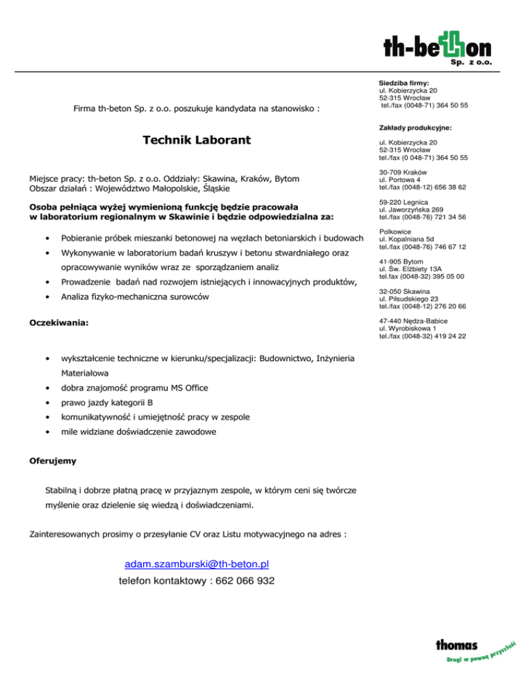 Siedziba firmy: ul. Kobierzycka 20 52-315 Wrocław tel./fax (0048-71) 364 50 55 Firma th-beton Sp. z o.o. poszukuje kandydata na stanowisko : Zakłady produkcyjne: Technik Laborant tel/ ul. Kobierzycka 20 52-315 Wrocław tel./fax (0 048-71) 364 50 55 Miejsce pracy: th-beton Sp. z o.o. Oddziały: Skawina, Kraków, Bytom Obszar działań : Województwo Małopolskie, Śląskie 30-709 Kraków ul. Portowa 4 tel./fax (0048-12) 656 38 62 Osoba pełniąca wyŜej wymienioną funkcję będzie pracowała w laboratorium regionalnym w Skawinie i będzie odpowiedzialna za: 59-220 Legnica ul. Jaworzyńska 269 tel./fax (0048-76) 721 34 56 59-101 • Pobieranie próbek mieszanki betonowej na węzłach betoniarskich i budowach • Wykonywanie w laboratorium badań kruszyw i betonu stwardniałego oraz opracowywanie wyników wraz ze sporządzaniem analiz • Prowadzenie badań nad rozwojem istniejących i innowacyjnych produktów, • Analiza fizyko-mechaniczna surowców 41-905 Bytom ul. Św. ElŜbiety 13A tel.fax (0048-32) 395 05 00 32-050 Skawina ul. Piłsudskiego 23 tel./fax (0048-12) 276 20 66 47-440 Nędza-Babice ul. Wyrobiskowa 1 tel./fax (0048-32) 419 24 22 Oczekiwania: • Polkowice ul. Kopalniana 5d tel./fax (0048-76) 746 67 12 wykształcenie techniczne w kierunku/specjalizacji: Budownictwo, InŜynieria Materiałowa • dobra znajomość programu MS Office • prawo jazdy kategorii B • komunikatywność i umiejętność pracy w zespole • mile widziane doświadczenie zawodowe Oferujemy Stabilną i dobrze płatną pracę w przyjaznym zespole, w którym ceni się twórcze myślenie oraz dzielenie się wiedzą i doświadczeniami. Zainteresowanych prosimy o przesyłanie CV oraz Listu motywacyjnego na adres : [email protected] telefon kontaktowy : 662 066 932