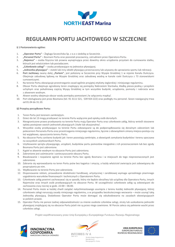 REGULAMIN PORTU JACHTOWEGO W SZCZECINIE § 1 Postanowienia ogólne: 1. 2. 3. 4. 5. 6. 7. 8. 9. 10. „Operator Portu” – Żegluga Szczecińska Sp. z o.o z siedzibą w Szczecinie . „Personel Portu” – Bosmani Portu oraz pozostali pracownicy, zatrudnieni przez Operatora Portu. „Najemca” – osoba fizyczna lub prawna wynajmująca przez dowolny okres urządzenia przystani do cumowania statku, których jest właścicielem lub posiadaczem. „Członkowie załogi” – osoby przebywające na jednostce pływającej. „Jednostka pływająca” – statek lub inny obiekt pływający przeznaczony lub używany do uprawiania sportu lub rekreacji. Port Jachtowy zwany dalej „Portem”, jest położony w Szczecinie przy Wyspie Grodzkiej 1 w rejonie Kanału Duńczyca. Obejmuje zabudowę lądową na Wyspie Grodzkiej oraz zabudowę wodną w kanale rzeki Duńczyca z 73 stanowiskami cumowniczymi. Na terenie Portu obowiązuje przestrzeganie zasad ogólnie przyjętej etykiety żeglarskiej i niniejszego regulaminu. Obszar Portu obejmuje ogrodzony teren znajdujący się pomiędzy Nabrzeżem Starówka, kładką pieszo-jezdną z przęsłem uchylnym oraz południową częścią Wyspy Grodzkiej w tym wszystkie budynki, urządzenia, pomosty i nabrzeża wraz z akwenem wodnym. Akwen wodny obejmuje obszar wody pomiędzy pomostami /w załączeniu mapka/. Port obsługiwany jest przez Bosmana (tel. 91 3111 521, 539 924 222) oraz podległy mu personel. Sezon nawigacyjny trwa od 01.04 do 31.10. §2 Przepisy porządkowe Portu: 1. 2. 3. 4. 5. 6. 7. 8. 9. 10. 11. 12. 13. 14. 15. Teren Portu jest terenem zamkniętym. Dzieci do lat 13 mogą przebywać na terenie Portu wyłącznie pod opieką osób dorosłych. Nieograniczone prawo przebywania na terenie Portu mają Operator Portu oraz członkowie załóg, którzy wnieśli stosowne opłaty postojowe swoich jednostek pływających /stałe lub okazjonalne/. Wszystkie osoby przebywające na terenie Portu zobowiązane są do podporządkowania się doraźnym zaleceniom lub poleceniom Personelu Portu oraz przestrzegania niniejszego regulaminu, łącznie z obowiązkiem zmiany miejsca postoju czy też wyjątkowo, opuszczenia terenu Portu. Na obszarze Portu zarówno budynki jak i teren pozostają zamknięte, a obowiązek zamykania budynków i terenu spoczywa na wszystkich użytkownikach Portu. Użytkowanie sprzętu pływającego, urządzeń, budynków portu pomostów niezgodnie z ich przeznaczeniem lub bez zgody Bosmana Portu jest zabronione. Kąpiel w akwenie wodnym na obszarze Portu jest zabroniona. Zabronione jest zaśmiecanie i zanieczyszczanie obszaru Portu. Biwakowanie i rozpalanie ognisk na terenie Portu bez zgody Bosmana i w miejscach do tego nieprzeznaczonych jest zabronione. Zabrania się wprowadzania na teren Portu psów bez kagańca i smyczy, a każdy właściciel zwierzęcia jest zobowiązany do posprzątania po nim. Wędkowanie na terenie Portu jest zabronione. Eksponowanie reklam, prowadzenie działalności handlowej, artystycznej i zarobkowej wymaga uprzedniego pisemnego uzgodnienia warunków finansowych i technicznych z Operatorem Portu. Członkowie załóg powinni zachowywać się w sposób, który nie będzie obraźliwy lub uciążliwy dla Operatora Portu, innych Najemców oraz innych osób przebywających na obszarze Portu. W szczególności członkowie załóg są zobowiązani do zachowania ciszy nocnej w godz. 22:00 – 06:00. Personel Portu może w każdej chwili zażądać natychmiastowego usunięcia z terenu każdej Jednostki pływającej, której członkowie załogi naruszają zasady niniejszego regulaminu, a w przypadku bezskutecznego wezwania – może usunąć taką Jednostkę pływającą. Dodatkowo Operator Portu może domagać się odszkodowania na zasadach obowiązujących w polskim prawie. Operator Portu nie ponosi żadnej odpowiedzialności za mienie osobiste członków załogi, straty lub uszkodzenia jednostki pływającej znajdującej się na obszarze Portu jeżeli nie są przez niego zawinione. W Porcie zaleca się pełnienie wacht przez członków załogi. Projekt współfinansowany przez Unię Europejską z Europejskiego Funduszu Rozwoju Regionalnego 16. Najemca ponosi pełną odpowiedzialność za działania swoje oraz członków swojej załogi, w szczególności za zniszczenie wyposażenia Portu Jachtowego, za uszkodzenia innych jednostek pływających oraz za zanieczyszczenie środowiska. 17. Wjazd pojazdów mechanicznych na kładkę łączącą Wyspę Grodzką z Nabrzeżem Starówka możliwe jest tylko i wyłącznie za zgodą Operatora Portu. 18. Na terenie Portu zabrania się spożywania alkoholu i innych środków odurzających. §3 Przepisy dotyczące postoju jednostek pływających: 1. 2. 3. 4. 5. 6. 7. 8. 9. 10. 11. 12. 13. 14. 15. 16. 17. 18. Do Portu Jachtowego mogą wpłynąć i zacumować jednostki pływające o długości do 25 m i zanurzeniu nieprzekraczającym 2,75 m. Wpłynięcie do Portu Jachtowego oznacza zaakceptowanie regulaminu Portu Jachtowego Szczecin. Postój jednostek pływających następuje w miejscach wskazanych przez Bosmana, za uprzednim zgłoszeniem zamiaru i określeniu przewidywanego terminu zacumowania. Miejsce postoju jednostki pływającej o ile nie wynika to w wcześniej zawartej umowy wskazuje Bosman Portu. Miejsca wskazane jednostce pływającej nie są miejscami stałymi. Operator zastrzega w uzasadnionych przypadkach prawo zmiany miejsca cumowania jednostki pływającej. Na polecenie Bosmana Portu załoga jednostki zobowiązana jest do zmiany miejsca cumowania. W przypadku braku kontaktu z załogą jednostki pływającej lub nie zastosowaniu się do poleceń, Bosman Portu może dokonać zastępczego przecumowania statku w obrębie Portu z zastrzeżeniem §2 pkt. 15 i 16. W przypadku zacumowania jednostki do burty drugiej jednostki, jednostka ustawiona przy nabrzeżu zobowiązana jest umożliwić bezpieczne przejście do jednostki do niej przycumowanej i okazać mu pomoc przy urządzeniu odpowie