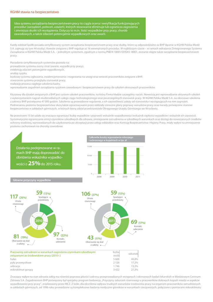 KGHM stawia na bezpieczeństwo Idea systemu zarządzania bezpieczeństwem pracy to ciągła ocena i weryfikacja funkcjonujących procedur (zarządzeń, poleceń, ustaleń), których stosowanie eliminuje lub ogranicza zagrożenia i zmniejsza skutki ich wystąpienia. Dotyczy to m.in. ilości wypadków przy pracy, chorób zawodowych, a także zdarzeń potencjalnie wypadkowych oraz awarii. Każdy oddział Spółki posiada certyfikowany system zarządzania bezpieczeństwem pracy oraz służby, które są odpowiedzialne za BHP (łącznie w KGHM Polska Miedź S.A. zajmują się tym 44 osoby). Kwestie związane z BHP reguluje aż 16 wewnętrznych procedur. W najbliższym czasie – w ramach wdrażania Zintegrowanego Systemu Zarządzania w KGHM Polska Miedź S.A. – jednolitym systemem, zgodnym z normą PN -N 18001/OHSAS 18001, zostanie objęte także zarządzanie bezpieczeństwem pracy. Posiadanie certyfikowanych systemów pozwala na: prowadzenie systemu oceny strat (awarie, wypadki przy pracy), ewidencję zdarzeń potencjalnie wypadkowych, analizę ryzyka, budowę systemu zgłaszania, ewidencjonowania i reagowania na uwagi oraz wnioski pracowników związane z BHP, stworzenie systemu przeglądu stanowisk pracy, realizację procesu ciągłego szkolenia kadry, wprowadzanie zagadnień zarządzania ryzykiem zawodowym i bezpieczeństwem pracy do szkoleń okresowych pracowników. Kluczowy dla działań związanych z BHP jest system szkoleń pracowników, na który Firma kładzie szczególny nacisk. Nowością jest wprowadzanie aktywnych szkoleń z wykorzystaniem nagrań multimedialnych całego ciągu technologicznego oraz poszczególnych stanowisk pracy. W KGHM Polska Miedź S.A. na okresowe szkolenia z zakresu BHP poświęcono 47 095 godzin. Szkolenia są prowadzone regularnie, a ich częstotliwość zależy od stanowiska i występujących na nim zagrożeń. Podniesieniu poziomu bezpieczeństwa służą także opracowywane przez oddziały coroczne plany poprawy warunków pracy oraz narady poświęcone stanowi bezpieczeństwa w zakładach górniczych, w których biorą udział przedstawiciele Okręgowego Urzędu Górniczego we Wrocławiu. Na przestrzeni 15 lat udało się znacząco ograniczyć liczbę wypadków i poprawić wskaźniki wypadkowości (wskaźnik ciężkości wypadków i wskaźnik ich częstości). Systematyczne ograniczanie emisji czynników szkodliwych dla zdrowia, zmniejszanie zatrudnienia w szkodliwych warunkach oraz dostęp do nowoczesnych środków ochrony osobistej, wprowadzanych do użytkowania po akceptacji przez załogi oddziałów oraz Komisję Bezpieczeństwa i Higieny Pracy, miały wpływ na zmniejszenie poziomu zachorowań na choroby zawodowe. Pracownicy zatrudnieni w warunkach zagrożenia czynnikami szkodliwymi związanymi ze środowiskiem pracy (2010 r.) hałas pyły przemysłowe wibracja mikroklimat gorący liczba osób 5 600 2 126 1 746 3 422 odsetek 44,8% 17,2% 13,2% 27,3% Znaczący wpływ na stan zdrowia załóg ma również poprawa jakości i zakresu przeprowadzanych wstępnych i okresowych badań lekarskich w Miedziowym Centrum Zdrowia S.A. Zagadnieniom BHP poświęcony był specjalny program badawczy „Przyczyny zaburzeń równowagi u pracowników dołowych kopalń miedzi w aspekcie wypadkowości przy pracy”, zrealizowany przez MCZ. Z kolei, dla określenia wpływu trudnych warunków środowiska pracy na organizm pracowników zatrudnionych w zakładach górniczych, od 1996 roku prowadzone są kompleksowe badania medyczne górników w warunkach rzeczywistych, połączone z pomiarami mikroklimatu środowiska pracy. W 1996, 2002 i 2008 roku było przeprowadzone „Badanie postaw załóg wobec bezpieczeństwa pracy w Oddziałach Górniczych KGHM Polska Miedź S.A.” aby stwierdzić, jak wygląda poziom kultury bezpieczeństwa pracowników i jaki ma to związek z wypadkowością w zakładach górniczych. Prowadził je Główny Instytut Górnictwa w Katowicach. W 2012 roku badanie to będzie zrealizowane ponownie. Wypadki wg miejsca zdarzenia Oddziały górnicze Oddziały powierzchniowe Liczba wypadków w KGHM Suma W tym śmiertelne W tym ciężkie Liczba straconych dni 2010 450 106 2010 556 10 5 28 915 2011 391 76 2011 467 2 4 25 667 K L I MA TY ZA CJA JEST NI EZB ĘDNA Dla poprawy stanu BHP w zakładach górniczych, w których dominują zagrożenia naturalne i w hutach, Spółka realizuje określone projekty. Są one ujmowane corocznie w planach poprawy warunków BHP. Realizując te inwestycje, przedsiębiorstwo współpracuje z ośrodkami naukowo -badawczymi specjalizującymi się w problematyce bezpieczeństwa pracy. Podczas sukcesywnej modernizacji urządzeń coraz więcej wykorzystywanych maszyn jest wyposażonych w dodatkowe systemy bezpieczeństwa. Na stanie oddziałów górniczych KGHM Polska Miedź S.A. znajduje się w sumie 1 289 maszyn górniczych. Roczne zakupy nowych przekraczają 200 sztuk, a wskaźnik odtworzenia w latach 2007 –2011 wynosił 17%. W kabinę kapsułową, skutecznie ochraniającą operatora w maszynie podczas zdarzeń potencjalnie wypadkowych, czyli tąpnięć, obwałów stropu czy ociosów, wyposażone są już 154 maszyny. Natomiast w kabiny kapsułowe z włazem ułatwiającym uwolnienie operatora w trakcie akcji ratowniczej po tąpnięciu lub obwale, wyposażono 339 maszyn. Ze względu na warunki klimatyczne panujące w wyrobiskach górniczych, kabiny 320 maszyn są klimatyzowane, co poprawia komfort pracy operatorów, a blisko 100 ma zainstalowaną klimatyzację nawiewną. Wszystkie posiadają stałą instalację gaśniczą, a instalację uruchamianą samoczynnie – już 862 maszyny. W samoczynną instalację gaśniczą z wtórnym systemem dogaszania pożaru, którego nie uda się stłumić w zarodku, wyposażono 55 pojazdów niskich, na których zainstalowano także kamery ułatwiające bezpieczną jazdę i pracę. Obecnie jednym z najpoważniejszych wyzwań związanych z bezpieczeństwem pracy jest zagrożenie klimatyczne, decyd