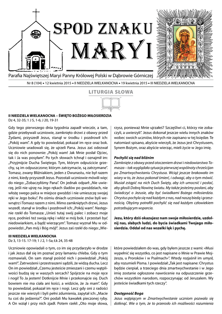SPOD ZNAKU MARYI Parafia Najświętszej Maryi Panny Królowej Polski w Dąbrowie Górniczej Nr 8 (104) • 12 kwietnia 2015 • II NIEDZIELA WIELKANOCNA • 19 kwietnia 2015 • III NIEDZIELA WIELKANOCNA LITURGIA SŁOWA | II NIEDZIELA WIELKANOCNA – ŚWIĘTO BOŻEGO MIŁOSIERDZIA Dz 4, 32-35; 1 J 5, 1-6; J 20, 19-31 Gdy tego pierwszego dnia tygodnia zapadł wieczór, a tam, gdzie przebywali uczniowie, zamknięto drzwi z obawy przed Żydami, przyszedł Jezus, stanął w środku i pozdrowił ich: „Pokój wam”. A gdy to powiedział, pokazał im ręce oraz bok. Uczniowie uradowali się, że ujrzeli Pana. Jezus zaś odezwał się do nich ponownie: „Pokój wam! Jak Mnie posłał Ojciec, tak i Ja was posyłam”. Po tych słowach tchnął i oznajmił im: „Przyjmijcie Ducha Świętego. Tym, którym odpuścicie grzechy, są im odpuszczone; którym zatrzymacie, są zatrzymane”. Tomasz, zwany Bliźniakiem, jeden z Dwunastu, nie był razem z nimi, kiedy przyszedł Jezus. Pozostali uczniowie mówili więc do niego: „Zobaczyliśmy Pana”. On jednak odparł: „Nie uwierzę, jeśli nie ujrzę na Jego rękach śladów po gwoździach, nie włożę swego palca w miejsce gwoździ i nie umieszczę swojej ręki w Jego boku”. Po ośmiu dniach uczniowie znów byli wewnątrz i Tomasz razem z nimi. Mimo zamkniętych drzwi, Jezus wszedł, stanął w środku i pozdrowił ich: „Pokój wam”. Następnie rzekł do Tomasza: „Unieś tutaj swój palec i zobacz moje ręce, podnieś też swoją rękę i włóż w mój bok. I przestań być niedowiarkiem, a bądź wierzącym”. Tomasz wyznał Mu w odpowiedzi: „Pan mój i Bóg mój!”. Jezus zaś rzekł do niego: „Wie- rzysz, ponieważ Mnie ujrzałeś? Szczęśliwi ci, którzy nie zobaczyli, a uwierzyli”. Jezus dokonał jeszcze wielu innych znaków wobec swoich uczniów, których nie zapisano w tej księdze. Te natomiast spisano, abyście wierzyli, że Jezus jest Chrystusem, Synem Bożym, oraz abyście wierząc, mieli życie w Jego imię. Pochylić się nad bliźnim Zamknięte z obawy przed otoczeniem drzwi i niedowiarstwo Tomasza – tak wyglądała sytuacja pierwszej wspólnoty chrześcijan po Zmartwychwstaniu Chrystusa. Wciąż jeszcze brakowało im wiary w to, że Jezus pokonał śmierć, i odwagi, aby o tym mówić. Musiał zstąpić na nich Duch Święty, aby ich umocnić i posłać, aby głosili Dobrą Nowinę światu. My także jesteśmy posłani, aby świadczyć o Jezusie, aby być świadkami Bożego miłosierdzia. Chrystus pochyla się nad każdym z nas, nad naszą biedą i grzesznością. Obyśmy potrafili pochylić się nad każdym człowiekiem potrzebującym wsparcia. Jezu, który dziś okazujesz nam swoje miłosierdzie, uzdolnij nas, słabych ludzi, do bycia świadkami Twojego miłosierdzia. Oddal od nas wszelki lęk i pychę. III NIEDZIELA WIELKANOCNA Dz 3, 13-15. 17-19; 1 J 2, 1-5a; Łk 24, 35-48 Uczniowie opowiadali o tym, co im się przydarzyło w drodze i jak Jezus dał się im poznać przy łamaniu chleba. Gdy o tym rozmawiali, On sam stanął pośród nich i powiedział: „Pokój wam!”. Zatrwożeni i przestraszeni sądzili, że widzą ducha. Lecz On im powiedział: „Czemu jesteście zmieszani i czemu wątpliwości budzą się w waszych sercach? Spójrzcie na moje ręce i nogi! To Ja jestem! Dotknijcie Mnie i przekonajcie się. Duch bowiem nie ma ciała ani kości, a widzicie, że Ja mam”. Gdy to powiedział, pokazał im ręce i nogi. Lecz gdy oni z radości jeszcze nie wierzyli i byli pełni zdumienia, zapytał ich: „Macie tu coś do jedzenia?”. Oni podali Mu kawałek pieczonej ryby. A On wziął i przy nich zjadł. Potem rzekł: „Oto moje słowa, które powiedziałem do was, gdy byłem jeszcze z wami: «Musi wypełnić się wszystko, co jest napisane o Mnie w Prawie Mojżesza, u Proroków i w Psalmach»”. Wtedy rozjaśnił im umysł, aby rozumieli Pisma. I powiedział: „Tak jest napisane: Chrystus będzie cierpiał, a trzeciego dnia zmartwychwstanie i w Jego imię zostanie ogłoszone nawrócenie na odpuszczenie grzechów wszystkim narodom, rozpoczynając od Jeruzalem. Wy jesteście świadkami tych rzeczy”. Dostępność Boga Jezus wątpiącym w Zmartwychwstanie uczniom pozwala się dotknąć. Wie o tym, że to przerosło ich możliwości rozumienia i podchodzi do nich w sposób bardzo ludzki i konkretny: mogą Go dotknąć i spożyć z Nim posiłek. Bóg często będzie zniżał się do poziomu człowieka i szukał takiego sposobu, aby ten mógł Go zrozumieć. Nie trzeba bać się prawd wiary. Jeśli Bóg chciałby pozostać ukryty, nie posłałby swojego Syna na ziemię. Jeśli Jezus chciałby pozostać niedostępny, nie powołałby wspólnoty uczniów. d Jezu, poprzez swoje Wcielenie stałeś się naszym Bratem. Bądź przy mnie, zwłaszcza w chwilach zwątpienia i gdy czuję się osamotniony. Pozwól mi dotykać Twoich zmartwychwstałych dłoni i stóp. ! e Święto Bożego Miłosierdzia Święto Bożego Miłosierdzia obchodzone jest w pierwszą niedzielę po Wielkanocy, czyli II Niedzielę Wielkanocną, zwaną obecnie Niedzielą Bożego Miłosierdzia. Wpisał je do kalendarza liturgicznego najpierw Franciszek kard. Macharski dla archidiecezji krakowskiej (1985), a potem niektórzy biskupi polscy w swoich diecezjach. Na prośbę Episkopatu Polski Ojciec Święty Jan Paweł II w 1995 roku wprowadził to święto dla wszystkich diecezji w Polsce. W dniu kanonizacji Siostry Faustyny, 30 kwietnia 2000 roku, Papież ustanowił to święto dla całego Kościoła. Inspiracją dla ustanowienia tego święta było pragnienie Jezusa, które przekazała Siostra Faustyna. Pan Jezus powiedział do niej: Pragnę, ażeby pierwsza niedziela po Wielkanocy była świętem Miłosierdzia (Dz. 299). Pragnę, aby święto Miłosierdzia było ucieczką i schronieniem dla wszystkich dusz, a szczególnie dla biednych grzeszników. W dniu tym otwarte są wnętrzności miłosierdzia Mego, wylewam całe morze łask na dusze, kt