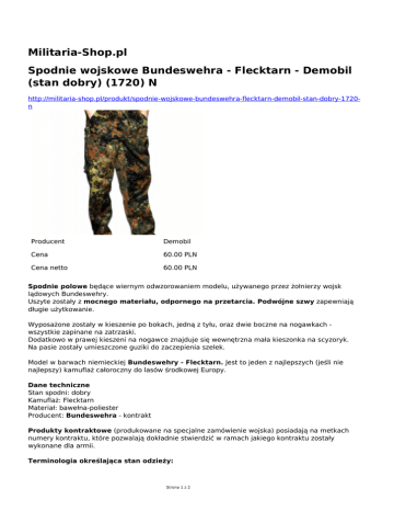 Militaria-Shop.pl Spodnie wojskowe Bundeswehra - Flecktarn - Demobil (stan dobry) (1720) N http://militaria-shop.pl/produkt/spodnie-wojskowe-bundeswehra-flecktarn-demobil-stan-dobry-1720n Producent Demobil Cena 60.00 PLN Cena netto 60.00 PLN Spodnie polowe będące wiernym odwzorowaniem modelu, używanego przez żołnierzy wojsk lądowych Bundeswehry. Uszyte zostały z mocnego materiału, odpornego na przetarcia. Podwójne szwy zapewniają długie użytkowanie. Wyposażone zostały w kieszenie po bokach, jedną z tyłu, oraz dwie boczne na nogawkach wszystkie zapinane na zatrzaski. Dodatkowo w prawej kieszeni na nogawce znajduje się wewnętrzna mała kieszonka na scyzoryk. Na pasie zostały umieszczone guziki do zaczepienia szelek. Model w barwach niemieckiej Bundeswehry - Flecktarn. Jest to jeden z najlepszych (jeśli nie najlepszy) kamuflaż całoroczny do lasów środkowej Europy. Dane techniczne Stan spodni: dobry Kamuflaż: Flecktarn Materiał: bawełna-poliester Producent: Bundeswehra - kontrakt Produkty kontraktowe (produkowane na specjalne zamówienie wojska) posiadają na metkach numery kontraktu, które pozwalają dokładnie stwierdzić w ramach jakiego kontraktu zostały wykonane dla armii. Terminologia określająca stan odzieży: Strona 1 z 2 - nowe stan idealny, nieużywane lub niewidoczne ślady użytkowania, - używane - nie posiadające uszkodzeń, w 100% sprawne, mało widoczne ślady użytkowania, - dobry - używane, widoczne ślady użytkowania, ale nie wpływające na funkcjonalność sprzedawanego sprzętu. Teoria kamuflażu - wprowadzenie Dane techniczne Rodzaj kroju spodni Militarny Kolor / kamuflaż spodni Kamuflaż Nazwa odcienia / kamuflażu Flecktarn Materiał spodni Syntetyczno-naturalny Skład materiału bawełna-poliester Faktura materiału spodni Twill (gładki) Elastyczność materiału spodni Nierozciągliwy Wodoodporność spodni Standardowy Ilość kieszeni 5 Zapięcie kieszeni zatrzaski Zapięcie rozporka Brak Szlufki na pasek tak Uwagi Podwójne szwy zapewniają długie użytkowanie. Strona 2 z 2