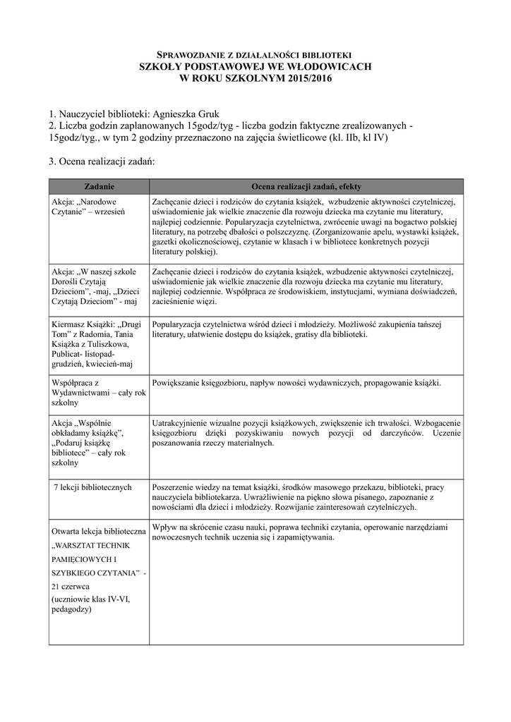 SPRAWOZDANIE Z DZIAŁALNOŚCI BIBLIOTEKI SZKOŁY PODSTAWOWEJ WE WŁODOWICACH W ROKU SZKOLNYM 2015/2016 1. Nauczyciel biblioteki: Agnieszka Gruk 2. Liczba godzin zaplanowanych 15godz/tyg - liczba godzin faktyczne zrealizowanych 15godz/tyg., w tym 2 godziny przeznaczono na zajęcia świetlicowe (kl. IIb, kl IV) 3. Ocena realizacji zadań: Zadanie Ocena realizacji zadań, efekty Akcja: „Narodowe Czytanie” – wrzesień Zachęcanie dzieci i rodziców do czytania książek, wzbudzenie aktywności czytelniczej, uświadomienie jak wielkie znaczenie dla rozwoju dziecka ma czytanie mu literatury, najlepiej codziennie. Popularyzacja czytelnictwa, zwrócenie uwagi na bogactwo polskiej literatury, na potrzebę dbałości o polszczyznę. (Zorganizowanie apelu, wystawki książek, gazetki okolicznościowej, czytanie w klasach i w bibliotece konkretnych pozycji literatury polskiej). Akcja: „W naszej szkole Dorośli Czytają Dzieciom”, -maj, „Dzieci Czytają Dzieciom” - maj Zachęcanie dzieci i rodziców do czytania książek, wzbudzenie aktywności czytelniczej, uświadomienie jak wielkie znaczenie dla rozwoju dziecka ma czytanie mu literatury, najlepiej codziennie. Współpraca ze środowiskiem, instytucjami, wymiana doświadczeń, zacieśnienie więzi. Kiermasz Książki: „Drugi Tom” z Radomia, Tania Książka z Tuliszkowa, Publicat- listopadgrudzień, kwiecień-maj Popularyzacja czytelnictwa wśród dzieci i młodzieży. Możliwość zakupienia tańszej literatury, ułatwienie dostępu do książek, gratisy dla biblioteki. Współpraca z Powiększanie księgozbioru, napływ nowości wydawniczych, propagowanie książki. Wydawnictwami – cały rok szkolny Akcja „Wspólnie obkładamy książkę”, „Podaruj książkę bibliotece” – cały rok szkolny Uatrakcyjnienie wizualne pozycji książkowych, zwiększenie ich trwałości. Wzbogacenie księgozbioru dzięki pozyskiwaniu nowych pozycji od darczyńców. Uczenie poszanowania rzeczy materialnych. 7 lekcji bibliotecznych Poszerzenie wiedzy na temat książki, środków masowego przekazu, biblioteki, pracy nauczyciela bibliotekarza. Uwrażliwienie na piękno słowa pisanego, zapoznanie z nowościami dla dzieci i młodzieży. Rozwijanie zainteresowań czytelniczych. Otwarta lekcja biblioteczna Wpływ na skrócenie czasu nauki, poprawa techniki czytania, operowanie narzędziami nowoczesnych technik uczenia się i zapamiętywania. „WARSZTAT TECHNIK PAMIĘCIOWYCH I SZYBKIEGO CZYTANIA” 21 czerwca (uczniowie klas IV-VI, pedagodzy) Pasowanie na czytelnika uczniów klas I - czerwiec Rozbudzanie chęci sięgania po książkę, wyrabianie właściwych nawyków czytelniczych, rozwijanie szacunku do książki, kształtowanie prawidłowego zachowania się w bibliotece. Nagrodzenie nowych czytelników upominkiem w postaci książki Nagradzanie najlepszych Aktywność czytelnicza dzieci zostaje dostrzeżona – najwierniejsi czytelnicy otrzymują czytelników na koniec roku szkolnego. pamiątkowe upominki. Przeprowadzenie ankiety na temat oczekiwań czytelniczych – „Jaką książkę polecisz naszej bibliotece?” - wrzesień Możliwość współdecydowania o zakupie książek, wzbogacenie i odnowienie księgozbioru biblioteki. Projekt „ Książki Naszych Marzeń”, Program „Narodowy Program Rozwoju Czytelnictwa” – październik -listopad Popularyzacja i wspieranie czytelnictwa wśród dzieci i młodzieży. Zaznajomienie z bogactwem literatury dla dzieci. Poszukiwanie nowości wydawniczych. Ułatwienie dostępu do książek, urozmaicenie i wzbogacenie księgozbioru. Podniesienie jakości i standardów działania biblioteki, przekształcenie jej w nowoczesne centrum dostępu do wiedzy, kultury oraz ośrodek życia społecznego. Konkurs czytelniczy: Quiz Sprawdzenie wiedzy ze znajomości lektur, ze znajomości lektury Zachęcanie do czytania, zwrócenia uwagi nie tylko na treść książek, ale też i na stronę „Chłopcy z placu broni”, graficzną. konkurs plastyczny promujący zabytki i kulturę Węgier - organizowane w ramach Tygodnia Kultury Węgierskiej (październiklistopad). Konkurs plastyczny „Moja ulubiona postać z bajki” (styczeń), konkurs plastyczny „Mój ulubiony bohater literacki” (marzec), konkurs czytelniczy „Nasze Lektury” (kwiecień). Stan czytelnictwa: Klasa Liczba uczniów Liczba czytelników Liczba wypożyczeń Średnia na ucznia Ia 25 25 173 7,2 Ib 24 24 191 7,95 IIa 20 20 186 9,3 IIb 23 23 207 9 III 26 26 338 13 IV 22 22 100 4,5 Va 18 18 89 4,94 Vb 20 20 77 3,85 VIa 20 20 64 3,2 VIb 19 19 53 2,78 Frekwencja: 100% Liczba odwiedzin w wypożyczalni: 1685 Liczba odwiedzin w czytelni: 780 Najlepsi czytelnicy (min. 10 książek): Kalina Kita, Olga Witek – kl. Ia Magdalena Łapaj, Jagoda Biała, Julia Gosztyła, Kacper Kieras, Natalia Gawrońska-Salska, Amelia Surma – kl. Ib Weronika Bembenek, Katarzyna Jabłońska, Nadia Łągiewka, Emilia Łoś, Laura Melka, Zuzanna Latusek - kl. IIa Anna Hamerla, Alicja Konarska, Wiktoria Król, Wiktoria Kucharek, Nikola Nowak, Sandra Wyrwas, Paulina Kitlińska, Daniel Makieła – kl. IIb Natalia Biała, Bartosz Gosztyła, Aleksandra Hadrych, Wiktoria Kania, Natalia Kita, Julia Kurasińska, Kinga Obal, Klaudia Pabich, Kamila Pisarska, Wiktoria Goc, Nikola Żmuda kl. III Wiktoria Gosztyła, Natalia Caban – kl. IV Klaudia Milewska, Wiktoria Pąpka – kl. Va Aleksandra Boniszewska – kl. Vb Sandra Chromiec, Aleksandra Kurek, Paulina Dorobisz – kl. VIa Celem pracy biblioteki było zaspokojenie potrzeb uczniów i nauczycieli związanych z realizacją programu dydaktyczno-wychowawczego szkoły, przygotowanie do samodzielnego wyszukiwania informacji za pomocą warsztatu informatyczno-bibliograficznego; zwracano uwagę na kształtowanie zainteresowań czytelniczych ucznia oraz podnoszenie kultury ogólnej. DODATKOWE ZADANIA: opieka nad ICIM oraz ewidencjonowanie podręczników w bibliotece szkolnej. Wnioski: Znalezienie sponsora chętnego do sfinansowania kompu