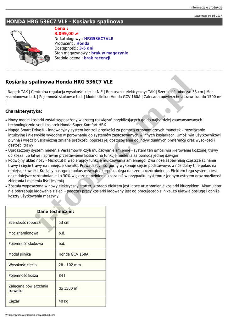 Informacje o produkcie Utworzono 04-03-2017 HONDA HRG 536C7 VLE - Kosiarka spalinowa Cena : 3.099,00 zł Nr katalogowy : HRG536C7VLE Producent : Honda Dostępność : 3-5 dni Stan magazynowy : brak w magazynie Średnia ocena : brak recenzji m .p l Kosiarka spalinowa Honda HRG 536C7 VLE | Napęd: TAK | Centralna regulacja wysokości cięcia: NIE | Rozrusznik elektryczny: TAK | Szerokość robocza: 53 cm | Moc znamionowa: b.d. | Pojemność skokowa: b.d. | Model silnika: Honda GCV 160A | Zalecana powierzchnia trawnika: do 1500 m2 | Charakterystyka: ● ● co ● s. ● Nowy model kosiarki został wyposażony w szereg rozwiązań przybliżających go do najbardziej zaawansowanych technologicznie serii kosiarek Honda Super Komfort HRX Napęd Smart Drive® - innowacyjny system kontroli prędkości za pomocą ergonomicznych manetek – rozwiązanie intuicyjne i niezwykle wygodne w porównaniu do systemów zastosowanych w innych kosiarkach. Umożliwia użytkownikowi płynną i wręcz błyskawiczną zmianę prędkości poprzez jej dostosowanie do indywidualnych preferencji oraz wysokości i gęstości trawy Uproszczony system mielenia Versamow® czyli mulczowanie zmienne - system ten umożliwia kierowanie koszonej trawy do kosza lub łatwe i sprawne przestawienie kosiarki na funkcję mielenia za pomocą jednej dźwigni Podwójny układ noży - MicroCut® wspierający funkcję mulczowania zmiennego. Dwa noże zapewniają częstsze ścinanie trawy i cięcie trawy na mniejsze kawałki. Prowadzący nóż górny wykonuje cięcie podstawowe, a nóż dolny tnie pokos na mniejsze kawałki. Krążący następnie pokos wewnątrz korpusu ulega dalszemu rozdrobnieniu. Efektem tego systemu jest dokładniejsze rozdrabnianie i o 30% większe napełnienie kosza niż w przypadku systemu z jednym ostrzem oraz możliwość zbierania i mielenia liści jesienią Została wyposażona w nowy elektryczny starter, którego efektem jest łatwe uruchomienie kosiarki kluczykiem. Akumulator nie potrzebuje ładowania z sieci - podczas pracy kosiarki ładowany jest od pracującego silnika, co ułatwia obsługę i obniża koszty użytkowania maszyny to ol ● i- Dane techniczne: Szerokość robocza 53 cm Moc znamionowa b.d. Pojemność skokowa b.d. Model silnika Honda GCV 160A Wysokość cięcia 28 - 102 mm Pojemność kosza 84 l Zalecana powierzchnia trawnika do 1500 m2 Ciężar 40 kg Wygenerowano w programie www.oscGold.com GWARANCJA 12 m-cy 60 m-ce ( zakup konsumencki) Wyposażenie standardowe: i- to ol s. co m .p l 1. Kosiarka spalinowa Honda HRG 536C7 VLE 2. Instrukcja obsługi