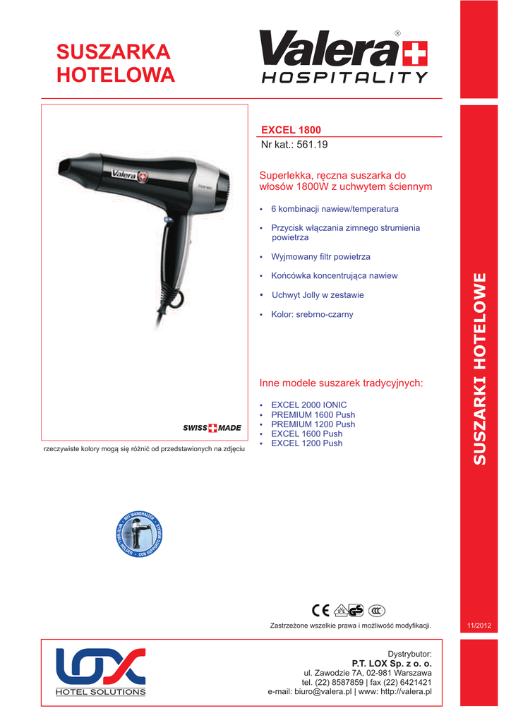 SUSZARKA HOTELOWA EXCEL 1800 Nr kat.: 561.19 ? 6 kombinacji nawiew/temperatura ? Przycisk włączania zimnego strumienia powietrza ? Wyjmowany filtr powietrza ? Końcówka koncentrująca nawiew ? Uchwyt Jolly w zestawie ? Kolor: srebrno-czarny Inne modele suszarek tradycyjnych: rzeczywiste kolory mogą się różnić od przedstawionych na zdjęciu ? ? ? ? ? EXCEL 2000 IONIC PREMIUM 1600 Push PREMIUM 1200 Push EXCEL 1600 Push EXCEL 1200 Push Zastrzeżone wszelkie prawa i możliwość modyfikacji. Dystrybutor: P.T. LOX Sp. z o. o. ul. Zawodzie 7A, 02-981 Warszawa tel. (22) 8587859 | fax (22) 6421421 e-mail: [email protected] | www: http://valera.pl SUSZARKI HOTELOWE Superlekka, ręczna suszarka do włosów 1800W z uchwytem ściennym 11/2012