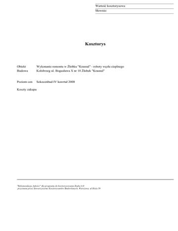 Wartość kosztorysowa Słownie: Kosztorys Obiekt Budowa Wykonanie remontu w Żłobku "Krasnal" - roboty węzła cieplnego Kołobrzeg ul. Bogusława X nr 18 Żłobek "Krasnal" Poziom cen Sekocenbud IV kawrtał 2008 Koszty zakupu "Rekomendacja Jakości" dla programu do kosztorysowania Rodos 6.0 przyznana przez Stowarzyszenie Kosztorysantów Budowlanych, Warszawa, ul.Hoża 50 Rodos 6.0.23.1 [7297] - Rekomendacja SKB Strona 2/6 Przedmiar Wykonanie remontu w Żłobku "Krasnal" - roboty węzła cieplnego Nr Podstawa Opis robót 1 2 Jm Roboty budowlane i instalacyjne Pomieszczenie węzła cieplnego Rozebranie podłoża z betonu żwirowego o grubości do 10cm 0.055 razem m3 m3 0,055 0,055 razem m2 m2 64,676 64,676 m 10,700 m2 m2 16,800 16,800 szt 12,000 m2 m2 16,800 16,800 t 0,680 t t 2,720 2,720 szt szt 2,000 2,000 kpl 1,000 szt 1,000 m 11,400 szt 14,000 urządz 53,000 podejść 2,000 szt 4,000 szt 3,000 m2 8,750 Malowanie dwukrotne z przygotowaniem powierzchni ścian i sufitów farbą emulsyjną (5,88+2,86)+(5,88+2,86)*2*3,20 3 Malowanie dwukrotne rur wodociągowych i gazowych o średnicy do 50mm 4 Środek gruntujący 16,80 razem 5 Ilość Lakierowanie jednokrotne emalią olejną lub ftalową (syntetyczną) elementów o powierzchni do 0,5m2 6 7 8 9 Posadzki cementowe wraz z cokolikami zatarte na gładko grubości 5cm 16,80 razem Wywóz złomu z terenu rozbiórki samochodem skrzyniowym na odległość do 1km z załadunkiem i wyładunkiem ręcznym 11 Wywóz złomu z terenu rozbiórki samochodem skrzyniowym na odległość do 1km - nakłady uzupełniejące za każdy dalszy rozpoczęty km odległości ponad 1km 0,680*4 razem Montaż opraw oświetleniowych na gotowym podłożu z podłączeniem, bryzgoodpornych, strugoodpornych, porcelanowych przykręcanych końcowych- lampy sufitowe hermetyczne 2 razem Uruchomienie węzłów wodnych c.o. 12 Demontaż podgrzewacza o pojemności do 250dm3 13 Demontaż rurociągu stalowego czarnego średnicy 65-80mm łączonego przez spawanie 14 Spawanie czołowe belek stalowych dwuteowych o wysokości do 160mm-ciecie palnikiem elementów metalowych 15 Próby instalacji centralnego ogrzewania na gorąco bez regulacji 16 Dodatki za wykonanie podejść odpływowych z PCW o połączeniach wciskowych, o średnicy 50mm 17 Demontaż zaworu zaporowego i redukcyjnego o średnicy 65-80mm o połączeniu kołnierzowym 18 Zawory grzejnikowe o średnicy nominalnej 20mm 19 Izolacja rurociągów o średnicy zewnętrznej do 55mm, jednowarstwowa matami z wełny mineralnej na welonie szklanym grubości 40-50mm 10 Rodos 6.0.23.1 [7297] - Rekomendacja SKB Strona 3/6 Kosztorys Wykonanie remontu w Żłobku "Krasnal" - roboty węzła cieplnego Nr Opis robót, nakłady 1 2 3 4 5 Roboty budowlane i instalacyjne Pomieszczenie węzła cieplnego Rozebranie podłoża z betonu żwirowego o grubości do 10cm 0,055 m3 Robocizna Robotnicy gr.I Razem pozycja Cena jednostkowa Malowanie dwukrotne z przygotowaniem powierzchni ścian i sufitów farbą emulsyjną 64,676 m2 Robocizna Robotnicy Materiały Farba emulsyjna nawierzchniowa Szpachlówka gipsowa z dodatkami farby emulsyjnej Materiały pomocnicze Razem pozycja Cena jednostkowa Malowanie dwukrotne rur wodociągowych i gazowych o średnicy do 50mm 10,7 m Robocizna Robotnicy Materiały Farba olejna nawierzchniowa Farba olejna do gruntowania Benzyna do lakierów Papier ścierny Materiały pomocnicze Razem pozycja Cena jednostkowa Środek gruntujący 16,8 m2 Robocizna Robotnicy Materiały Środki gruntujące bez zawartości rozpuszczalników do warstwy przewodzącej Materiały pomocnicze Sprzęt Środek transportowy Razem pozycja Cena jednostkowa Lakierowanie jednokrotne emalią olejną lub ftalową (syntetyczną) elementów o powierzchni do 0,5m2 12 szt Robocizna Robotnicy Materiały Emalia olejno-żywiczna ogólnego stosowania Rozcieńczalnik Papier ścierny Materiały pomocnicze Razem pozycja Cena jednostkowa Jm Norma Ilość r-g 6,22 0,342 r-g 0,152 9,831 dm3 kg % 0,29 0,6 2 18,756 38,806 r-g 0,22 2,354 dm3 dm3 dm3 ark % 0,013 0,014 0,006 0,2 2 0,139 0,150 0,064 2,140 r-g 0,103 1,730 kg 0,125 2,100 % 1,5 m-g 0,0022 0,037 r-g 0,116 1,392 dm3 dm3 m2 % 0,0305 0,006 0,0194 1,5 0,366 0,072 0,233 1,0217 0,0845 17,165 1,420 0,0011 1,5 0,018 6 0 Razem pozycja 7 Posadzki cementowe wraz z cokolikami zatarte na gładko grubości 5cm 16,8 m2 Robocizna Posadzkarze gr.II r-g Robotnicy gr.I r-g Materiały Cement portlandzki 25 z dodatkami t Materiały pomocnicze % Cena Robocizna Materiały Sprzęt Rodos 6.0.23.1 [7297] - Rekomendacja SKB Strona 4/6 Kosztorys Wykonanie remontu w Żłobku "Krasnal" - roboty węzła cieplnego Nr Opis robót, nakłady Sprzęt Wyciąg Środek transportowy 8 9 10 11 12 13 14 Razem pozycja Cena jednostkowa Wywóz złomu z terenu rozbiórki samochodem skrzyniowym na odległość do 1km z załadunkiem i wyładunkiem ręcznym 0,68 t Robocizna Robotnicy gr.I Sprzęt Samochód skrzyniowy 5t Razem pozycja Cena jednostkowa Wywóz złomu z terenu rozbiórki samochodem skrzyniowym na odległość do 1km - nakłady uzupełniejące za każdy dalszy rozpoczęty km odległości ponad 1km 2,72 t Sprzęt Samochód skrzyniowy 5t Razem pozycja Cena jednostkowa Montaż opraw oświetleniowych na gotowym podłożu z podłączeniem, bryzgoodpornych, strugoodpornych, porcelanowych przykręcanych końcowych- lampy sufitowe hermetyczne 2 szt Robocizna Elektromonterzy gr.III Materiały Oprawy Klosze Żarówki Materiały pomocnicze Razem pozycja Cena jednostkowa Uruchomienie węzłów wodnych c.o. 1 kpl Robocizna Robotnicy Materiały pomocnicze (od R) Razem pozycja Cena jednostkowa Demontaż podgrzewacza o pojemności do 250dm3 1 szt Robocizna Robotnicy Razem pozycja Cena jednostkowa Demontaż rurociągu stalowego czarnego średnicy 65-80mm łączonego przez spawanie 11,4 m Robocizna Monterzy instalacji sanit. i ogrzew. gr.II Spawacze gr.II Robotnicy gr.I Materiały pomocnicze (od R) Razem pozycja Cena jednostkowa Spawanie czołowe belek stalowych dwuteowych o w