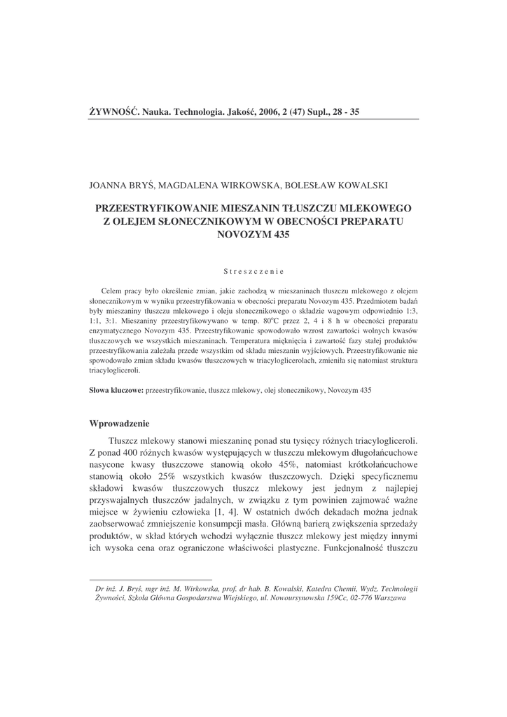 YWNO . Nauka. Technologia. Jako , 2006, 2 (47) Supl., 28 - 35 JOANNA BRY , MAGDALENA WIRKOWSKA, BOLESŁAW KOWALSKI PRZEESTRYFIKOWANIE MIESZANIN TŁUSZCZU MLEKOWEGO Z OLEJEM SŁONECZNIKOWYM W OBECNO CI PREPARATU NOVOZYM 435 Streszczenie Celem pracy było okre lenie zmian, jakie zachodz w mieszaninach tłuszczu mlekowego z olejem słonecznikowym w wyniku przeestryfikowania w obecno ci preparatu Novozym 435. Przedmiotem bada były mieszaniny tłuszczu mlekowego i oleju słonecznikowego o składzie wagowym odpowiednio 1:3, 1:1, 3:1. Mieszaniny przeestryfikowywano w temp. 80oC przez 2, 4 i 8 h w obecno ci preparatu enzymatycznego Novozym 435. Przeestryfikowanie spowodowało wzrost zawarto ci wolnych kwasów tłuszczowych we wszystkich mieszaninach. Temperatura mi kni cia i zawarto fazy stałej produktów przeestryfikowania zale ała przede wszystkim od składu mieszanin wyj ciowych. Przeestryfikowanie nie spowodowało zmian składu kwasów tłuszczowych w triacyloglicerolach, zmieniła si natomiast struktura triacylogliceroli. Słowa kluczowe: przeestryfikowanie, tłuszcz mlekowy, olej słonecznikowy, Novozym 435 Wprowadzenie Tłuszcz mlekowy stanowi mieszanin ponad stu tysi cy ró nych triacylogliceroli. Z ponad 400 ró nych kwasów wyst puj cych w tłuszczu mlekowym długoła cuchowe nasycone kwasy tłuszczowe stanowi około 45%, natomiast krótkoła cuchowe stanowi około 25% wszystkich kwasów tłuszczowych. Dzi ki specyficznemu składowi kwasów tłuszczowych tłuszcz mlekowy jest jednym z najlepiej przyswajalnych tłuszczów jadalnych, w zwi zku z tym powinien zajmowa wa ne miejsce w ywieniu człowieka [1, 4]. W ostatnich dwóch dekadach mo na jednak zaobserwowa zmniejszenie konsumpcji masła. Główn barier zwi kszenia sprzeda y produktów, w skład których wchodzi wył cznie tłuszcz mlekowy jest mi dzy innymi ich wysoka cena oraz ograniczone wła ciwo ci plastyczne. Funkcjonalno tłuszczu Dr in . J. Bry , mgr in . M. Wirkowska, prof. dr hab. B. Kowalski, Katedra Chemii, Wydz. Technologii ywno ci, Szkoła Główna Gospodarstwa Wiejskiego, ul. Nowoursynowska 159Cc, 02-776 Warszawa PRZEESTRYFIKOWANIE MIESZANIN TŁUSZCZU MLEKOWEGO Z OLEJEM SŁONECZNIKOWYM… 29 mlekowego oraz jego warto zdrowotn mo na polepszy poprzez mieszanie go z olejami ro linnymi oraz poddanie mieszanin modyfikacjom [8]. Potencjalnie najwi ksze znaczenie technologiczne ma reakcja przeestryfikowania, która umo liwia dokonywanie zmian rozmieszczenia kwasów tłuszczowych w triacyloglicerolach. Dzi ki temu mo na otrzymywa tłuszcze zmodyfikowane o po danej temperaturze topnienia i o okre lonych wła ciwo ciach krystalizacyjnych [6]. Proces przeestryfikowania mo e zachodzi w obecno ci katalizatorów chemicznych i biologicznych. Obecnie coraz wi kszym zainteresowaniem cieszy si przeestryfikowanie tłuszczów z zastosowaniem katalizatorów biologicznych, jakimi s enzymy lipolityczne. W procesie enzymatycznego przeestryfikowania tłuszczów reakcje przebiegaj z dostateczn szybko ci w łagodnych warunkach, co umo liwia łatwiejsze sterowanie procesem i przerwanie go na z góry zało onym etapie [15]. Celem pracy było okre lenie zmian, jakie zachodz w mieszaninach tłuszczu mlekowego z olejem słonecznikowym w wyniku przeestryfikowania w obecno ci preparatu Novozym 435. Materiał i metody bada Przedmiotem bada były mieszaniny tłuszczu mlekowego i oleju słonecznikowego o składzie wagowym odpowiednio 1:3, 1:1, 3:1. Głównymi składnikami tłuszczu mlekowego s kwasy: palmitynowy (29,9%) oraz oleinowy (20,9%). W oleju słonecznikowym wyst puje głównie kwas linolowy (61,2%) oraz oleinowy (25,3%). Reakcje przeestryfikowania mieszanin wykonywano przez 2, 4 i 8 h w temp. 80°C w obecno ci preparatu enzymatycznego Novozym 435. Preparat ten zawiera lipaz niespecyficzn , otrzyman z Candida antarctica, immobilizowan na makroporowatej ywicy akrylowej. Zawarto wody w preparacie wynosiła 2%, a jego dozowanie wynosiło 8% wzgl dem masy tłuszczu. W mieszaninach przed i po przeestryfikowaniu oznaczano liczb kwasow metod miareczkow [14]. Frakcje triacylogliceroli (TAG) izolowano metod chromatografii kolumnowej [12]. W wyizolowanych z mieszanin fizycznych i produktów ich przeestryfikowania frakcjach triacylogliceroli oznaczano temperatur mi kni cia metod kapilary otwartej [13] – wykonywano dwa równoległe oznaczenia, a bezwzgl dne ró nice pomi dzy wynikami nie przekraczały 0,5°C - oraz zawarto fazy stałej metod pulsacyjnego protonowego magnetycznego rezonansu j drowego [11] – wykonywano po dwa równoległe oznaczenia, a bezwzgl dne ró nice pomi dzy wynikami nie przekraczały warto ci przewidzianych w Polskiej Normie [11]. Okre lano równie skład kwasów tłuszczowych metod chromatografii gazowej [10] oraz ich rozmieszczenie w pozycjach sn-2 i sn-1,3 triacylogliceroli [2]. W tłuszczach, obok triacylogliceroli, znajduj si równie pewne ilo ci monoi diacylogliceroli, a tak e wolnych kwasów tłuszczowych stanowi cych frakcj 30 Joanna Bry , Magdalena Wirkowska, Bolesław Kowalski nietriacyloglicerolow . Zwi kszona zawarto tej frakcji w produkcie tłuszczowym mo e zmniejsza jego odporno na utlenianie, a tak e jest przyczyn strat substancji tłuszczowej [7]. Zawarto wolnych kwasów tłuszczowych (FFA) w mieszaninach fizycznych oraz w produktach ich przeestryfikowania została obliczona na podstawie liczb kwasowych oraz wyników oznacze GLC. Bezwzgl dna ró nica pomi dzy wynikami dwóch równoległych oznacze wolnych kwasów tłuszczowych nie przekraczała 3% redniej arytmetycznej tych wyników, co jest zgodne z Polsk Norm [14]. Wyniki i dyskusja W wyniku przeestryfikowania zaobserwowano znacz cy wzrost zawarto ci wolnych kwasów tłuszczowych (rys. 1). W procesie enzymatycznego przeestryfikowania zachodz dwie przeciwstawne reakcje: cz ciowa hydroliza i ponowna estryfikacja niepełnych acylogliceroli, co powoduje, e w ko cowym produkcie obecne s , obok acylogliceroli, równie pewne ilo ci wolnych kwasów tłuszczowych [6]. Naj