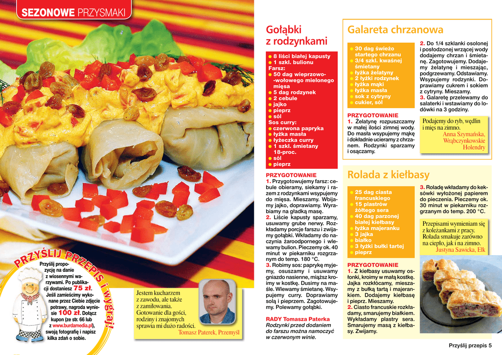 SEZONOWE PRZYSMAKI Gołąbki z rodzynkami 8 liści białej kapusty 1 szkl. bulionu Farsz: ● 50 dag wieprzowo-wołowego mielonego mięsa ● 5 dag rodzynek ● 2 cebule ● jajko ● pieprz ● sól Sos curry: ● czerwona papryka ● łyżka masła ● łyżeczka curry ● 1 szkl. śmietany 18-proc. ● sól ● pieprz ● ● Przyślij propozycję na danie z wiosennymi warzywami. Po publikacji dostaniesz 75 zł. Jeśli zamieścimy wykonane przez Ciebie zdjęcie potrawy, nagroda wyniesie 100 zł. Dołącz kupon (ze str. 66 lub z www.burdamedia.pl), swoją fotografię i napisz kilka zdań o sobie. Jestem kucharzem z zawodu, ale także z zamiłowania. Gotowanie dla gości, rodziny i znajomych sprawia mi dużo radości. Tomasz Paterek, Przemyśl PRZYGOTOWANIE 1. Przygotowujemy farsz: cebule obieramy, siekamy i razem z rodzynkami wsypujemy do mięsa. Mieszamy. Wbijamy jajko, doprawiamy. Wyrabiamy na gładką masę. 2. Liście kapusty sparzamy, usuwamy grube nerwy. Rozkładamy porcje farszu i zwijamy gołąbki. Wkładamy do naczynia żaroodpornego i wlewamy bulion. Pieczemy ok. 40 minut w piekarniku rozgrzanym do temp. 180 °C. 3. Robimy sos: paprykę myjemy, osuszamy i usuwamy gniazdo nasienne, miąższ kroimy w kostkę. Dusimy na maśle. Wlewamy śmietanę. Wsypujemy curry. Doprawiamy solą i pieprzem. Zagotowujemy. Polewamy gołąbki. RADY Tomasza Paterka Rodzynki przed dodaniem do farszu można namoczyć w czerwonym winie. Galareta chrzanowa ● ● ● ● ● ● ● ● 30 dag świeżo startego chrzanu 3/4 szkl. kwaśnej śmietany łyżka żelatyny 2 łyżki rodzynek łyżka mąki łyżka masła sok z cytryny cukier, sól PRZYGOTOWANIE 1. Żelatynę rozpuszczamy w małej ilości zimnej wody. Do masła wsypujemy mąkę i dokładnie ucieramy z chrzanem. Rodzynki sparzamy i osączamy. 2. Do 1/4 szklanki osolonej i posłodzonej wrzącej wody dodajemy chrzan i śmietanę. Zagotowujemy. Dodajemy żelatynę i mieszając, podgrzewamy. Odstawiamy. Wsypujemy rodzynki. Doprawiamy cukrem i sokiem z cytryny. Mieszamy. 3. Galaretę przelewamy do salaterki i wstawiamy do lodówki na 3 godziny. Podajemy do ryb, wędlin i mięs na zimno. Anna Szymańska, Wrąbczynkowskie Holendry Rolada z kiełbasy ● ● ● ● ● ● ● ● 25 dag ciasta francuskiego 15 plastrów żółtego sera 40 dag parzonej białej kiełbasy łyżka majeranku 3 jajka białko 3 łyżki bułki tartej pieprz 3. Roladę wkładamy do keksówki wyłożonej papierem do pieczenia. Pieczemy ok. 30 minut w piekarniku rozgrzanym do temp. 200 °C. Przepisami wymieniam się z koleżankami z pracy. Rolada smakuje zarówno na ciepło, jak i na zimno. Justyna Sawicka, Ełk PRZYGOTOWANIE 1. Z kiełbasy usuwamy osłonki, kroimy w małą kostkę. Jajka rozkłócamy, mieszamy z bułką tartą i majerankiem. Dodajemy kiełbasę i pieprz. Mieszamy. 2. Ciasto francuskie rozkładamy, smarujemy białkiem. Wykładamy plastry sera. Smarujemy masą z kiełbasy. Zwijamy. Przyślij przepis 5