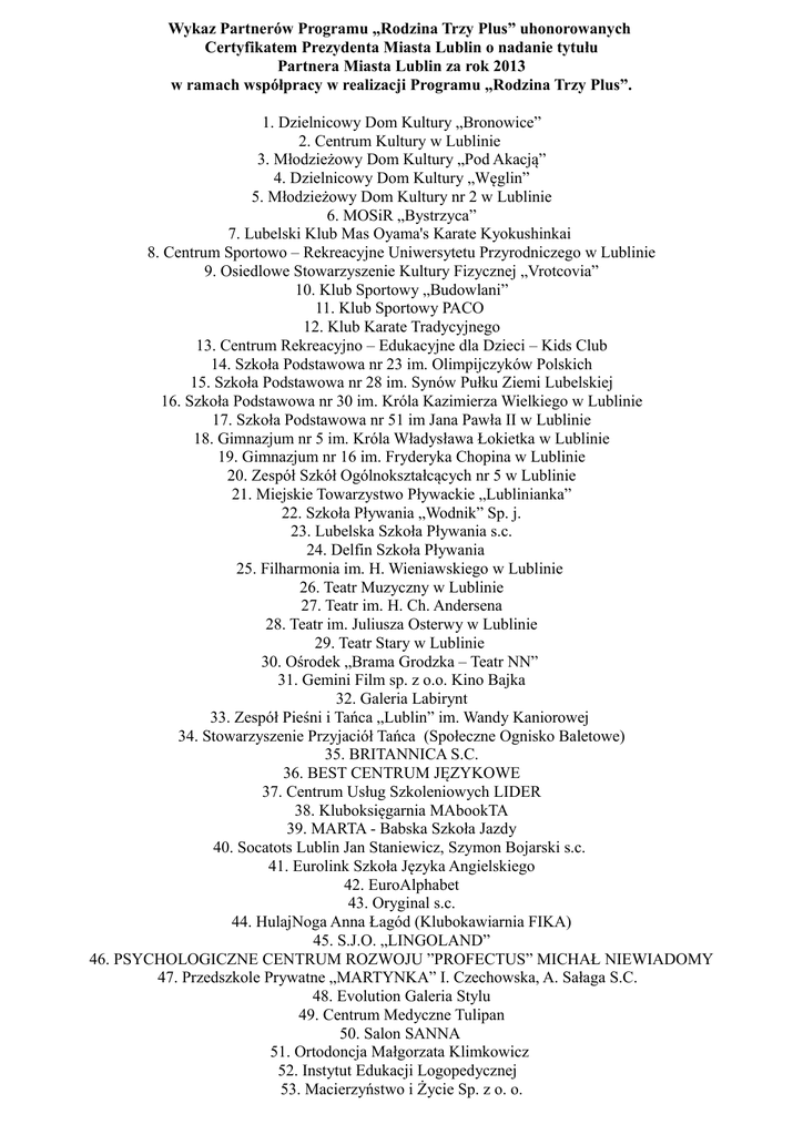 Wykaz Partnerów Programu „Rodzina Trzy Plus” uhonorowanych Certyfikatem Prezydenta Miasta Lublin o nadanie tytułu Partnera Miasta Lublin za rok 2013 w ramach współpracy w realizacji Programu „Rodzina Trzy Plus”. 1. Dzielnicowy Dom Kultury „Bronowice” 2. Centrum Kultury w Lublinie 3. Młodzieżowy Dom Kultury „Pod Akacją” 4. Dzielnicowy Dom Kultury „Węglin” 5. Młodzieżowy Dom Kultury nr 2 w Lublinie 6. MOSiR „Bystrzyca” 7. Lubelski Klub Mas Oyama's Karate Kyokushinkai 8. Centrum Sportowo – Rekreacyjne Uniwersytetu Przyrodniczego w Lublinie 9. Osiedlowe Stowarzyszenie Kultury Fizycznej „Vrotcovia” 10. Klub Sportowy „Budowlani” 11. Klub Sportowy PACO 12. Klub Karate Tradycyjnego 13. Centrum Rekreacyjno – Edukacyjne dla Dzieci – Kids Club 14. Szkoła Podstawowa nr 23 im. Olimpijczyków Polskich 15. Szkoła Podstawowa nr 28 im. Synów Pułku Ziemi Lubelskiej 16. Szkoła Podstawowa nr 30 im. Króla Kazimierza Wielkiego w Lublinie 17. Szkoła Podstawowa nr 51 im Jana Pawła II w Lublinie 18. Gimnazjum nr 5 im. Króla Władysława Łokietka w Lublinie 19. Gimnazjum nr 16 im. Fryderyka Chopina w Lublinie 20. Zespół Szkół Ogólnokształcących nr 5 w Lublinie 21. Miejskie Towarzystwo Pływackie „Lublinianka” 22. Szkoła Pływania „Wodnik” Sp. j. 23. Lubelska Szkoła Pływania s.c. 24. Delfin Szkoła Pływania 25. Filharmonia im. H. Wieniawskiego w Lublinie 26. Teatr Muzyczny w Lublinie 27. Teatr im. H. Ch. Andersena 28. Teatr im. Juliusza Osterwy w Lublinie 29. Teatr Stary w Lublinie 30. Ośrodek „Brama Grodzka – Teatr NN” 31. Gemini Film sp. z o.o. Kino Bajka 32. Galeria Labirynt 33. Zespół Pieśni i Tańca „Lublin” im. Wandy Kaniorowej 34. Stowarzyszenie Przyjaciół Tańca (Społeczne Ognisko Baletowe) 35. BRITANNICA S.C. 36. BEST CENTRUM JĘZYKOWE 37. Centrum Usług Szkoleniowych LIDER 38. Kluboksięgarnia MAbookTA 39. MARTA - Babska Szkoła Jazdy 40. Socatots Lublin Jan Staniewicz, Szymon Bojarski s.c. 41. Eurolink Szkoła Języka Angielskiego 42. EuroAlphabet 43. Oryginal s.c. 44. HulajNoga Anna Łagód (Klubokawiarnia FIKA) 45. S.J.O. „LINGOLAND” 46. PSYCHOLOGICZNE CENTRUM ROZWOJU ”PROFECTUS” MICHAŁ NIEWIADOMY 47. Przedszkole Prywatne „MARTYNKA” I. Czechowska, A. Sałaga S.C. 48. Evolution Galeria Stylu 49. Centrum Medyczne Tulipan 50. Salon SANNA 51. Ortodoncja Małgorzata Klimkowicz 52. Instytut Edukacji Logopedycznej 53. Macierzyństwo i Życie Sp. z o. o. 54. CenterMed Sp. z o.o. 55. Gabinet Psychoterapii i Pomocy Psychologicznej Katarzyna Stadejek 56. Leroy Merlin Polska Sp. z o.o. 57. Lublindis Sp. z o.o. (E. Leclerc z siedzibą ul. Tomasza Zana) 58. Turisdis Sp. z o.o. (E. Leclerc z siedzibą ul. Turystyczna) 59. OBI Superhobby Market Budowlany Sp. z o.o. Market OBI 036 60. OBI Superhobby Market Budowlany Sp. z o.o. Market OBI 013 61. PH PIMAX Maluga Władysław 62. PW MAKROPOL Sp. z o.o. 63. Marcin Palczewski (Telepizza ) 64. Restauracja Country 65. Apetito Lunch-bar (BON APPETIT S.C.) 66. Fabryka Pizzy (DB GROUP Sp. j .) 67. Kawiarnia Central Park (MN GASTRO) 68. Restauracja Oranżeria (BENSIP Sp. z o.o.) 69. BE BEAUTY 70. Baby Fant Sp. j. 71. RAMPERS Spółka Jawna 72. Krzyś Krzysztof Adamus 73. Pracownia Optyczna „Orange Optic” 74. Pracownia Optyczna „Orange Optic” 75. Zegarki s.c. 76. F.U. Fantasy Event (Niebieski Słoń – zabawki edukacyjne) 77. MiniModa (Xander) 78. PAWO Sp. z o.o. 79. AMBRA Sp. z o.o. 80. Salony Optyczne Wrzos 81. AUTO OPONY Maciej Bielecki 82. www.sklep.motoroils.pl (P.W. Mal-Tom) 83. FRENO Benedykt Gazi 84. 196 26 Damel Taxi s.c. 85. Biuro Rachunkowe DUO-PROFIT 86. ALFA KOMPUTER S.C. 87. Ctrl – Usługi Informatyczne Maciej Wośko 88. PRINT SERVICE 89. MEGA-PIKSEL s.c 90. Niedziałek - Marek Niedziałek 91. NplaySp. z o.o. 92. Księgarnia internetowa naukowa.pl 93. ARS DEKO 94. VICO Spółka jawna 95. Logopeda Monika Łuszczuk 96. GORBI Sp. z o.o.