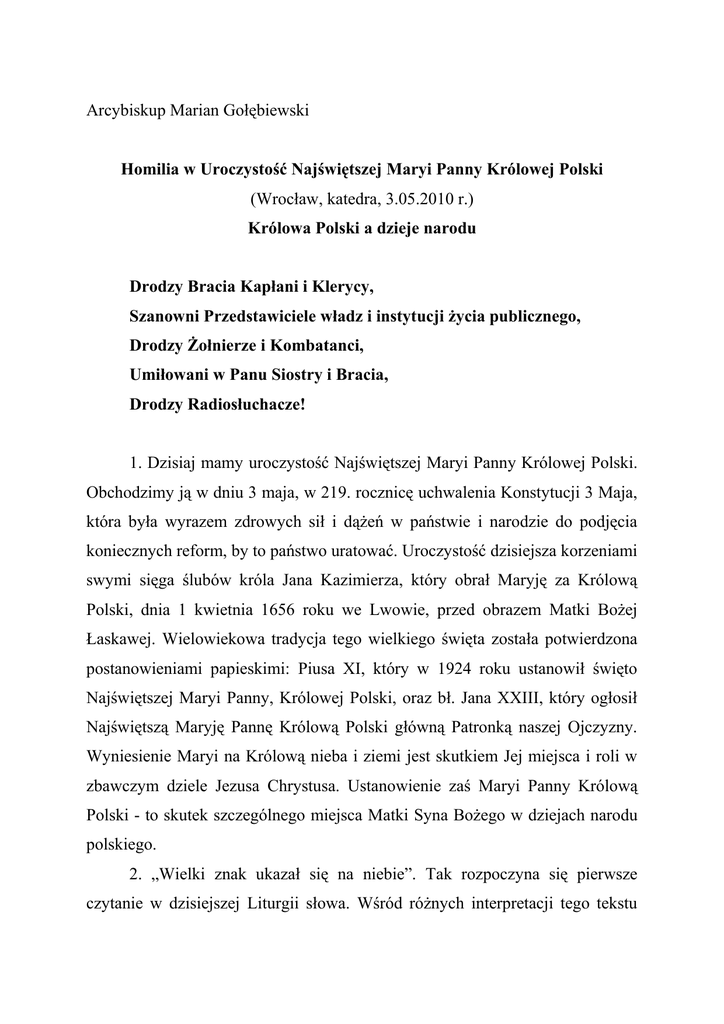 Arcybiskup Marian Gołębiewski Homilia w Uroczystość Najświętszej Maryi Panny Królowej Polski (Wrocław, katedra, 3.05.2010 r.) Królowa Polski a dzieje narodu Drodzy Bracia Kapłani i Klerycy, Szanowni Przedstawiciele władz i instytucji życia publicznego, Drodzy Żołnierze i Kombatanci, Umiłowani w Panu Siostry i Bracia, Drodzy Radiosłuchacze! 1. Dzisiaj mamy uroczystość Najświętszej Maryi Panny Królowej Polski. Obchodzimy ją w dniu 3 maja, w 219. rocznicę uchwalenia Konstytucji 3 Maja, która była wyrazem zdrowych sił i dążeń w państwie i narodzie do podjęcia koniecznych reform, by to państwo uratować. Uroczystość dzisiejsza korzeniami swymi sięga ślubów króla Jana Kazimierza, który obrał Maryję za Królową Polski, dnia 1 kwietnia 1656 roku we Lwowie, przed obrazem Matki Bożej Łaskawej. Wielowiekowa tradycja tego wielkiego święta została potwierdzona postanowieniami papieskimi: Piusa XI, który w 1924 roku ustanowił święto Najświętszej Maryi Panny, Królowej Polski, oraz bł. Jana XXIII, który ogłosił Najświętszą Maryję Pannę Królową Polski główną Patronką naszej Ojczyzny. Wyniesienie Maryi na Królową nieba i ziemi jest skutkiem Jej miejsca i roli w zbawczym dziele Jezusa Chrystusa. Ustanowienie zaś Maryi Panny Królową Polski - to skutek szczególnego miejsca Matki Syna Bożego w dziejach narodu polskiego. 2. „Wielki znak ukazał się na niebie”. Tak rozpoczyna się pierwsze czytanie w dzisiejszej Liturgii słowa. Wśród różnych interpretacji tego tekstu 2 istnieją dwie główne: eklezjologiczna i mariologiczna. Najważniejszą podstawą mariologicznej interpretacji znaku Niewiasty jest jednak mesjańskie rozumienie postaci „Syna - Mężczyzny”, który będzie „pasł wszystkie narody rózgą żelazną” (Ap 12,5; por. Ps 2,9; 110,2). Najbardziej właściwa wydaje się jednak interpretacja integralna tego tekstu, według której sens wyrazowy Niewiasty (Ap 12) jest eklezjologiczny i wskazuje na Kościół jako Lud Boży, ale sens ten mieści w sobie znaczenie mariologiczne, stosownie do wyjątkowego miejsca Maryi w Kościele. Drugie czytanie, wyjęte z Listu do Kolosan, w pierwszej części ukazuje godność wszystkich braci i sióstr, którzy uwierzyli w Chrystusa. Mają oni udział w dziedzictwie świętych i stali się uczestnikami światłości. Druga część tego tekstu ukazuje niezwykłe funkcje „umiłowanego Syna” Boga, dzięki któremu odbiorcy listu mają udział w wielkiej godności świętych. W antyfonie psalmu responsoryjnego dochodzi do głosu uznanie ludu i Rady Starszych Izraela względem Judyty w słowach: „Tyś wielką chlubą naszego narodu” (Jdt 15,9). Przywołane wezwanie liturgia odnosi do Maryi. Jak Judyta była błogosławiona przez Boga Najwyższego, tak również Maryja jest pełna łaski, jest wybrana i błogosławiona między niewiastami. Jak Judyta uratowała swój naród z opresji i zagrożenia, tak Maryja wielokrotnie ratowała naród nasz w różnych niebezpieczeństwach. Relacja o Matce i umiłowanym uczniu stojących pod krzyżem należy do kluczowych tekstów mariologicznych Nowego Testamentu. Maryi dane było doświadczyć tego wszystkiego, przez co przechodziło wiele kobiet, patrząc na tragiczną śmierć swego dziecka. W swoim bólu i cierpieniu Maryja nie jest osamotniona. Przede wszystkim pamięta o Niej Jej Boski Syn, którego wolą Matka zostaje oddana pod opiekę św. Jana. W sposób szczególny wybrana spośród kobiet i błogosławiona, Maryja, staje się z woli Boskiego Syna przybraną Matką wszystkich uczniów Jezusa Chrystusa. Odtąd swoją macierzyńską opieką otacza cały Kościół. Jako czuła i kochająca Matka, jest 3 także Maryja prawdziwą Królową naszych serc i całego polskiego narodu. Drogą matczynej posługi i cierpienia Maryja stała się tą, którą czcimy jako Królową świata i polskiego narodu. Drodzy Bracia i Siostry! 3. Dzisiejsza uroczystość ukazuje pełną wzniosłych wydarzeń przeszłość polskiego narodu, który doznawał przemożnej opieki swojej Pani i Królowej. Takie spojrzenie na historię nie jest czymś niezwykłym, ale ma podstawy biblijne i mocny fundament teologiczny. Wydarzenia zbawcze mają charakter historyczny i są nam dostępne przez wydarzenia historyczne. Wszystko zaczęło się w 966 roku, kiedy to pierwszy historyczny władca Polan Mieszko I przyjął wraz z narodem chrzest święty, żeniąc się z czeską Dobrawą, i w ten sposób wprowadził Polskę do rodziny narodów chrześcijańskich. Od tego momentu Chrystus i Jego Matka idą przez wieki z narodem polskim. Od niepamiętnych czasów towarzyszy naszym dziejom ojczystym dostojna pieśń. Oto jej słowa: „Bogurodzica Dziewica, Bogiem sławiena Maryja! U Twego Syna Gospodzina Matko zwolena Maryja, Ziści nam, spuści nam. Kyrie eleison. Twego dziela Krzciciela, Bożycze, Usłysz głosy, napełń myśli człowiecze. Słysz modlitwę, jąż nosimy, A dać raczy, Jegoż prosimy: A na świecie zbożny pobyt, Po żywocie rajski przebyt. Kyrie eleison. Jest to najstarsza polska pieśń religijna i maryjna. Była śpiewana przez rycerstwo polskie w XV wieku, między innymi przed bitwą pod Grunwaldem. 4 W jej słowach wyraziła się wiara, nadzieja i miłość zaszczepiona w sercach naszego ludu na chrzcie świętym. Około 1582 roku, na przełomie epoki piastowskiej i jagiellońskiej, przywędrował do nas Wizerunek „Czarnej Madonny”, skupiający przy sobie wiarę, nadzieję i miłość praojców, którą ich serca wyrażały od dawna. Obrona Częstochowy - tak przejmująco opisana przez H. Sienkiewicza - stała się początkiem wydarzeń, które od XVII wieku kłębiły się na polskim niebie. Urosła ona do rangi symbolu. Kiedy narodem przestali rządzić polscy królowie, Pani z Jasnej Góry została ogłoszona przez jednego z nich Królową Polski. Ta świadomość pomagała przetrwać narodowi w poczuciu jego własnej suwerenności. To 