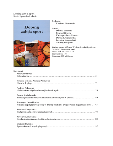 Doping zabija sport Skutki i przeciwdziałanie Redaktor: Wiesława Granowska Autorzy: Dariusz Błachnio Ryszard Grucza Katarzyna Iwaszkiewicz Dorota Kwiatkowska Jarosław Krzywański Andrzej Pokrywka Wydawnictwo: Oficyna Wydawniczo-Poligraficzna "ADAM", Warszawa 2006 ISBN: 978-83-7232-747-5 Liczba stron: 135 Wymiary: 165 x 235mm Spis treści: Jerzy Jurkiewicz Od wydawcy ………………………………………………………………………….. 5 Ryszard Grucza, Andrzej Pokrywka Historia dopingu ……………………..……………………………………………….. 7 Andrzej Pokrywka Nieświadome uŜycie substancji zabronionych………………………………………... 29 Dorota Kwiatkowska Zanieczyszczenie odŜywek środkami zabronionymi w sporcie.……………………… 49 Katarzyna Iwaszkiewicz Walka z dopingiem w sporcie w prawie polskim i uregulowania międzynarodowe .. 65 Jarosław Krzywański Wyłączenia dla celów terapeutycznych ………………………………………………. 75 Jarosław Krzywański Działania niepoŜądane środków dopingujących …………………………………….. 83 Dariusz Błachnio System kontroli antydopingowej ……………………………… ……………………. 97