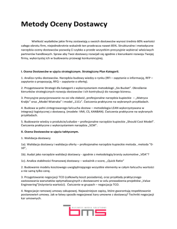 Metody Oceny Dostawcy Wielkość wydatków jakie firmy zostawiają u swoich dostawców wynosi średnio 60% wartości całego obrotu firm, niejednokrotnie wskaźnik ten przekracza nawet 85%. Strukturalne i metodyczne narzędzia oceny dostawców pozwolą Ci szybko a przede wszystkim precyzyjnie wybierać właściwych partnerów handlowych. Spraw aby Twoi dostawcy rozwijali się zgodnie z kierunkami rozwoju Twojej firmy, wykorzystaj ich w budowaniu przewagi konkurencyjnej. I. Ocena Dostawców w ujęciu strategicznym. Strategiczny Plan Kategorii. 1. Analiza rynku dostawców. Narzędzia budowy wiedzy o rynku (RFI – zapytanie o informację, RFP – zapytanie o propozycję, RFQ – zapytanie o ofertę). 2. Przygotowanie Strategii dla kategorii z wykorzystaniem metodologii „Six Bucket”. Określenie kierunków strategicznych rozwoju dostawców i ich kontrybucji do naszego biznesu. 3. Precyzyjne pozycjonowanie na osi siła słabość, profesjonalne narzędzia kupieckie – „Matryca Kraljic” oraz „Model Wiatraka” i model „11Cs”. Ćwiczenia praktyczne na wybranych przykładach. 4. Budowa w pełni zintegrowanego łańcucha dostaw – metodologia LEAN wykorzystywana w integracji logistycznej z dostawcą. (modele: VMI, CS, KANBAN). Ćwiczenia praktyczne na wybranych przykładach. 5. Budowanie wiedzy o produkcie/usłudze – profesjonalne narzędzie kupieckie „Should Cost Model”. Ćwiczenia praktyczne z wykorzystaniem narzędzia „SCM”. II. Ocena Dostawców w ujęciu taktycznym. 1. Walidacja dostawcy 1a). Walidacja dostawcy i walidacja oferty – profesjonalne narzędzie kupieckie metoda , metoda ”010”, 1b). Audyt jako narzędzie walidacji dostawcy - zgodnie z metodologią branży automotive „VDA”? 1c). Analiza stabilności finansowej dostawcy – wskaźnik z-score, „Quick Ratio” 2. Budowanie modelu kosztowego uwzględniającego wszystkie elementy w całym łańcuchu wartości a nie samą tylko cenę. 3. Przygotowanie negocjacji TCO (całkowity koszt posiadania), oraz przykłady praktycznego zastosowania warsztatów optymalizacyjnych z dostawcami w celu prowadzenia projektów „Value Engineering”(inżynieria wartości). Ćwiczenie w grupach – negocjacja TCO. 4. Negocjacje ramowej umowy zakupowej. Najważniejsze zapisy, które gwarantują respektowanie postanowień umowy. Jak w łatwy sposób negocjować kary umowne z dostawcą? Techniki negocjacji kar umownych. III. Ocena i rozwój dostawcy na poziomie operacyjnym 1.Metody oceny dostawcy w trakcie trwania współpracy. 2.Narzędzia oceny dostawcy. Jak stworzyć sprawny system monitoringu i oceny dostawcy. 3.Przygotowanie planu rozwoju dostawcy i działań korygujących. Wszystkie wykorzystane w szkoleniu modele, metodologie i narzędzia wykorzystywane są w praktyce, do zarządzania dostawcami przez większość międzynarodowych korporacji; są to nowoczesne metody pracy profesjonalnych kupców.