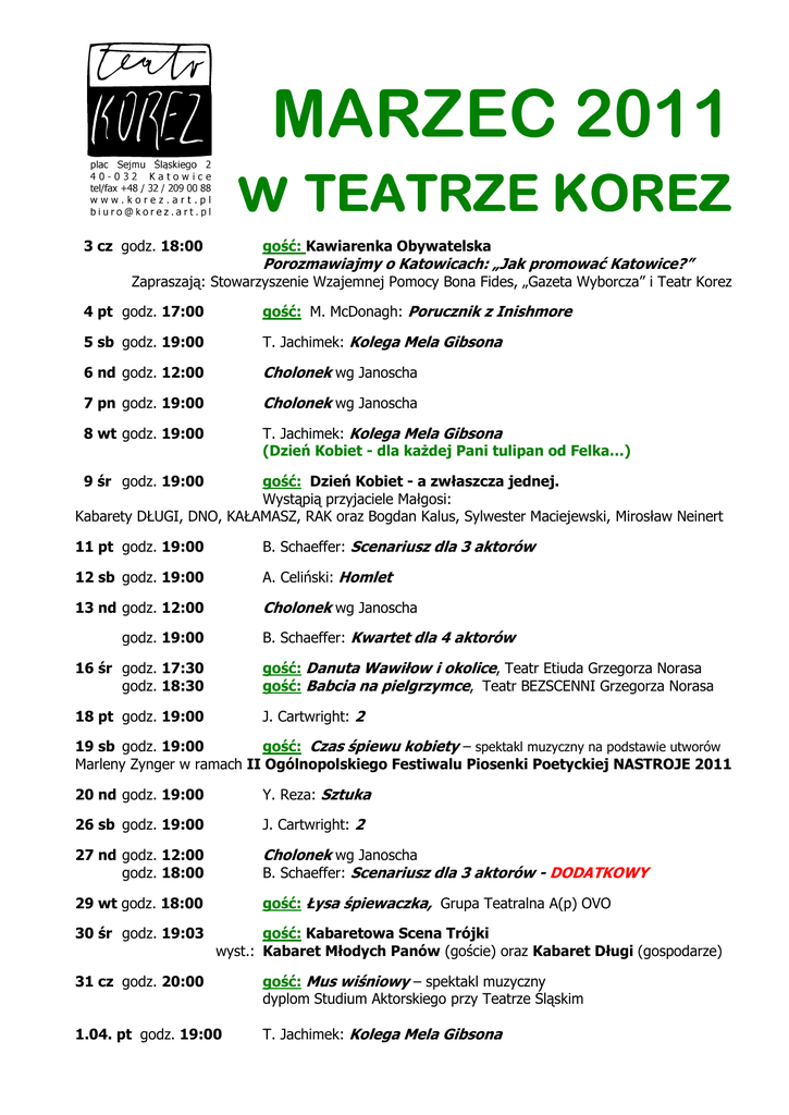 MARZEC 2011 w TEATRZE KOREZ 3 cz godz. 18:00 gość: Kawiarenka Obywatelska Porozmawiajmy o Katowicach: „Jak promować Katowice?” Zapraszają: Stowarzyszenie Wzajemnej Pomocy Bona Fides, „Gazeta Wyborcza” i Teatr Korez 4 pt godz. 17:00 gość: M. McDonagh: Porucznik z Inishmore 5 sb godz. 19:00 T. Jachimek: Kolega Mela Gibsona 6 nd godz. 12:00 Cholonek wg Janoscha 7 pn godz. 19:00 Cholonek wg Janoscha 8 wt godz. 19:00 T. Jachimek: Kolega Mela Gibsona (Dzień Kobiet - dla kaŜdej Pani tulipan od Felka…) 9 śr godz. 19:00 gość: Dzień Kobiet - a zwłaszcza jednej. Wystąpią przyjaciele Małgosi: Kabarety DŁUGI, DNO, KAŁAMASZ, RAK oraz Bogdan Kalus, Sylwester Maciejewski, Mirosław Neinert 11 pt godz. 19:00 B. Schaeffer: Scenariusz dla 3 aktorów 12 sb godz. 19:00 A. Celiński: Homlet 13 nd godz. 12:00 Cholonek wg Janoscha B. Schaeffer: Kwartet dla 4 aktorów godz. 19:00 16 śr godz. 17:30 godz. 18:30 gość: Danuta Wawiłow i okolice, Teatr Etiuda Grzegorza Norasa gość: Babcia na pielgrzymce, Teatr BEZSCENNI Grzegorza Norasa 18 pt godz. 19:00 J. Cartwright: 2 19 sb godz. 19:00 gość: Czas śpiewu kobiety – spektakl muzyczny na podstawie utworów Marleny Zynger w ramach II Ogólnopolskiego Festiwalu Piosenki Poetyckiej NASTROJE 2011 20 nd godz. 19:00 Y. Reza: Sztuka 26 sb godz. 19:00 J. Cartwright: 2 27 nd godz. 12:00 godz. 18:00 Cholonek wg Janoscha B. Schaeffer: Scenariusz dla 3 aktorów - DODATKOWY 29 wt godz. 18:00 gość: Łysa śpiewaczka, Grupa Teatralna A(p) OVO 30 śr godz. 19:03 gość: Kabaretowa Scena Trójki wyst.: Kabaret Młodych Panów (goście) oraz Kabaret Długi (gospodarze) 31 cz godz. 20:00 gość: Mus wiśniowy – spektakl muzyczny dyplom Studium Aktorskiego przy Teatrze Śląskim 1.04. pt godz. 19:00 T. Jachimek: Kolega Mela Gibsona