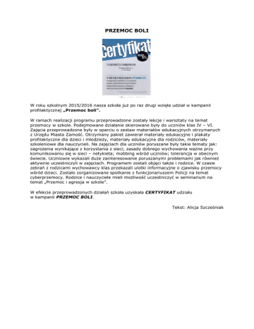 PRZEMOC BOLI W roku szkolnym 2015/2016 nasza szkoła już po raz drugi wzięła udział w kampanii profilaktycznej „Przemoc boli”. W ramach realizacji programu przeprowadzone zostały lekcje i warsztaty na temat przemocy w szkole. Podejmowane działanie skierowane były do uczniów klas IV – VI. Zajęcia przeprowadzone były w oparciu o zestaw materiałów edukacyjnych otrzymanych z Urzędu Miasta Zamość. Otrzymany pakiet zawierał materiały edukacyjne i plakaty profilaktyczne dla dzieci i młodzieży, materiały edukacyjne dla rodziców, materiały szkoleniowe dla nauczycieli. Na zajęciach dla uczniów poruszane były takie tematy jak: zagrożenia wynikające z korzystania z sieci; zasady dobrego wychowania ważne przy komunikowaniu się w sieci – netykieta; mobbing wśród uczniów; tolerancja w obecnym świecie. Uczniowie wykazali duże zainteresowanie poruszanymi problemami jak również aktywnie uczestniczyli w zajęciach. Programem zostali objęci także i rodzice. W czasie zebrań z rodzicami wychowawcy klas przekazali ulotki informacyjne o zjawisku przemocy wśród dzieci. Zostało zorganizowane spotkanie z funkcjonariuszem Policji na temat cyberprzemocy. Rodzice i nauczyciele mieli możliwość uczestniczyć w seminarium na temat „Przemoc i agresja w szkole”. W efekcie przeprowadzonych działań szkoła uzyskała CERTYFIKAT udziału w kampanii PRZEMOC BOLI. Tekst: Alicja Szcześniak