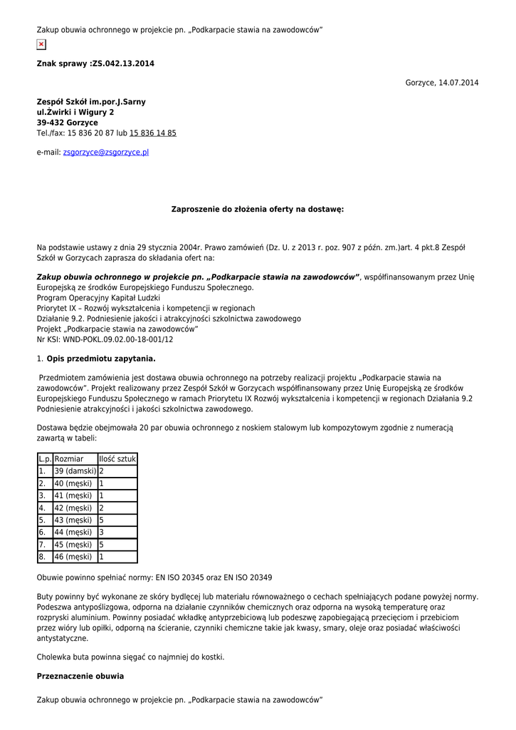 Zakup obuwia ochronnego w projekcie pn. „Podkarpacie stawia na zawodowców” Znak sprawy :ZS.042.13.2014 Gorzyce, 14.07.2014 Zespół Szkół im.por.J.Sarny ul.Żwirki i Wigury 2 39-432 Gorzyce Tel./fax: 15 836 20 87 lub 15 836 14 85 e-mail: [email protected] Zaproszenie do złożenia oferty na dostawę: Na podstawie ustawy z dnia 29 stycznia 2004r. Prawo zamówień (Dz. U. z 2013 r. poz. 907 z późn. zm.)art. 4 pkt.8 Zespół Szkół w Gorzycach zaprasza do składania ofert na: Zakup obuwia ochronnego w projekcie pn. „Podkarpacie stawia na zawodowców”, współfinansowanym przez Unię Europejską ze środków Europejskiego Funduszu Społecznego. Program Operacyjny Kapitał Ludzki Priorytet IX – Rozwój wykształcenia i kompetencji w regionach Działanie 9.2. Podniesienie jakości i atrakcyjności szkolnictwa zawodowego Projekt „Podkarpacie stawia na zawodowców” Nr KSI: WND-POKL.09.02.00-18-001/12 1. Opis przedmiotu zapytania. Przedmiotem zamówienia jest dostawa obuwia ochronnego na potrzeby realizacji projektu „Podkarpacie stawia na zawodowców”. Projekt realizowany przez Zespół Szkół w Gorzycach współfinansowany przez Unię Europejską ze środków Europejskiego Funduszu Społecznego w ramach Priorytetu IX Rozwój wykształcenia i kompetencji w regionach Działania 9.2 Podniesienie atrakcyjności i jakości szkolnictwa zawodowego. Dostawa będzie obejmowała 20 par obuwia ochronnego z noskiem stalowym lub kompozytowym zgodnie z numeracją zawartą w tabeli: L.p. Rozmiar Ilość sztuk 1. 39 (damski) 2 2. 40 (męski) 1 3. 41 (męski) 1 4. 42 (męski) 2 5. 43 (męski) 5 6. 44 (męski) 3 7. 45 (męski) 5 8. 46 (męski) 1 Obuwie powinno spełniać normy: EN ISO 20345 oraz EN ISO 20349 Buty powinny być wykonane ze skóry bydlęcej lub materiału równoważnego o cechach spełniających podane powyżej normy. Podeszwa antypoślizgowa, odporna na działanie czynników chemicznych oraz odporna na wysoką temperaturę oraz rozpryski aluminium. Powinny posiadać wkładkę antyprzebiciową lub podeszwę zapobiegającą przecięciom i przebiciom przez wióry lub opiłki, odporną na ścieranie, czynniki chemiczne takie jak kwasy, smary, oleje oraz posiadać właściwości antystatyczne. Cholewka buta powinna sięgać co najmniej do kostki. Przeznaczenie obuwia Zakup obuwia ochronnego w projekcie pn. „Podkarpacie stawia na zawodowców” Zakup obuwia ochronnego w projekcie pn. „Podkarpacie stawia na zawodowców” Buty przeznaczone są do ochrony osobistej uczniów odbywających miesięczny staż w zakładach odlewniczych. 2. Termin wykonania dostawy Termin realizacji dostawy do 24 lipca 2014. Rozliczenie zadania nastąpi jednorazowo po zrealizowaniu dostawy i dostarczeniu faktury. 1. Miejsce dostawy Zespół Szkół im.por.J.Sarny/ Centrum Kształcenia Praktycznego , ul.Żwirki i Wigury 2, 39-432 Gorzyce, sekretariat CKP. 1. Miejsce oraz termin składania i otwarcia ofert Oferty należy składać do sekretariatu Zespołu Szkół im.por.J.Sarny , ul.Żwirki i Wigury 2, 39-432 Gorzyce lub pocztą internetową na adres [email protected], do dnia 2014-07-18 do godz. 10:00 Otwarcie i wybór ofert nastąpi w dniu 2014-07-18 o godz. 10:30 w sekretariacie Zespołu Szkół im.por.J.Sarny , ul.Żwirki i Wigury 2, 39-432 Gorzyce 5. Opis sposobu obliczenia ceny Kryterium wyboru jest najniższa cena ZATWIERDZAM Wicedyrektor Zespołu Szkół w Gorzycach ds. CKP Jarosław Augustynowicz Otrzymują: 1. 2. 3. 4. 5. 6. a/a strona bip zamawiającego: http://bip.zsgorzyce.pl/ UNIMET Sp. z o.o. oddz. Stalowa Wola; ul. Energetyków 14 a; mail: [email protected] KAMEX Sp. z o.o. ul. Korczaka 33 a; Mielec; mail: [email protected] MULTI-SERVICE Sp. z o.o. ul. Firlejowska 32; Lublin; mail: [email protected] F.H. Kwasek Sp. J. ul. Żwirki i Wigury 4; Sandomierz; mail: [email protected] Gorzyce, dnia 18.07.2014 r. Znak sprawy :ZS.042.13.2014 KAMEX Sp. z o.o. ul. Korczaka 33 a 39-300 Mielec mail: [email protected] Zawiadomienie o wyborze najkorzystniejszej oferty W postępowaniu prowadzonym na podstawie ustawy z dnia 29 stycznia 2004r. Prawo zamówień (Dz. U. z 2013 r. poz. 907 z późn. zm.)art. 4 pkt.8 na: Zakup obuwia ochronnego w projekcie pn. „Podkarpacie stawia na zawodowców”, współfinansowanym przez Unię Europejską ze środków Europejskiego Funduszu Społecznego. Zamawiający: Zespół Szkół im. por. J. Sarny adres: ul. Żwirki i Wigury 2, 39-432 Gorzyce tel.: 15 836-20-87 Zakup obuwia ochronnego w projekcie pn. „Podkarpacie stawia na zawodowców” Zakup obuwia ochronnego w projekcie pn. „Podkarpacie stawia na zawodowców” e-mail: [email protected] Biorąc pod uwagę najniższą cenę, jako kryterium wyboru najkorzystniejszej oferty Zamawiający dokonał wyboru oferty nr 1 złożonej przez: Nazwa i adres Wykonawcy, którego ofertę wybrano: KAMEX Sp. z o.o. ul. Korczaka 33 a 39-300 Mielec NIP: 817-10-03-127 mail: [email protected] Cena: 1749,06 zł brutto Termin, po którego upływie może być zawarta umowa w sprawie zamówienia publicznego: po upływie 1 dnia od dnia przesłania zawiadomienia o wyborze najkorzystniejszej oferty. Wicedyrektor Zespołu Szkół w Gorzycach ds. Centrum Kształcenia Praktycznego Jarosław Augustynowicz Zakup obuwia ochronnego w projekcie pn. „Podkarpacie stawia na zawodowców”