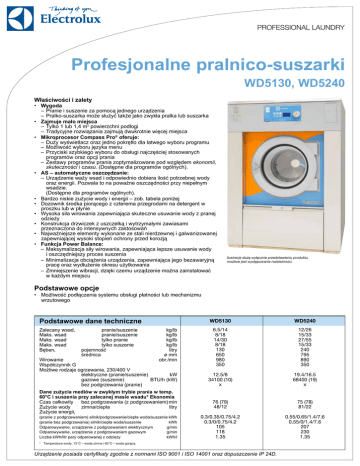 PROFESSIONAL LAUNDRY Profesjonalne pralnico-suszarki WD5130, WD5240 Właściwości i zalety • • • • • • • • • • Wygoda –Pranie i suszenie za pomocą jednego urządzenia – Pralko-suszarka może służyć także jako zwykła pralka lub suszarka Zajmuje mało miejsca –Tylko 1 lub 1,4 m2 powierzchni podłogi – Tradycyjne rozwiązania zajmują dwukrotnie więcej miejsca Mikroprocesor Compass Pro® oferuje: – Duży wyświetlacz oraz jedno pokrętło dla łatwego wyboru programu – Możliwość wyboru języka menu – Przyciski szybkiego wyboru do obsługi najczęściej stosowanych programów oraz opcji prania – Zestawy programów prania zoptymalizowane pod względem ekonomii, skuteczności i czasu. (Dostępne dla programów ogólnych). AS – automatyczne oszczędzanie: – Urządzenie waży wsad i odpowiednio dobiera ilość potrzebnej wody oraz energii. Pozwala to na poważne oszczędności przy niepełnym wsadzie. (Dostępne dla programów ogólnych). Bardzo niskie zużycie wody i energii – zob. tabela poniżej Dozownik środka piorącego z czterema przegrodami na detergent w proszku lub w płynie Wysoka siła wirowania zapewniająca skuteczne usuwanie wody z pranej odzieży Konstrukcja drzwiczek z uszczelką i wytrzymałymi zawiasami przeznaczona do intensywnych zastosowań Najważniejsze elementy wykonane ze stali nierdzewnej i galwanizowanej zapewniającej wysoki stopień ochrony przed korozją Funkcja Power Balance: – Maksymalizacja siły wirowania, zapewniająca lepsze usuwanie wody i oszczędniejszy proces suszenia – Minimalizacja obciążenia urządzenia, zapewniająca jego bezawaryjną pracę oraz wydłużenie okresu użytkowania – Zmniejszenie wibracji, dzięki czemu urządzenie można zainstalować w każdym miejscu Ilustracje służą wyłącznie przedstawieniu produktu, możliwe jest występowanie rozbieżności. Podstawowe opcje • Możliwość podłączenia systemu obsługi płatności lub mechanizmu wrzutowego Podstawowe dane techniczne WD5130 WD5240 Zalecany wsad, pranie/suszenie kg/lb Maks. wsad pranie/suszenie kg/lb Maks. wsad tylko pranie kg/lb Maks. wsad tylko suszenie kg/lb Bęben, pojemność litry średnica ø mm Wirowanie obr./min Współczynnik G Możliwe rodzaje ogrzewania, 230/400 V elektryczne (pranie/suszenie) kW gazowe (suszenie) BTU/h (kW) bez podgrzewania (pranie) 6.5/14 8/18 14/30 8/18 130 650 980 350 12/26 15/33 27/55 15/33 240 795 890 350 12.5/8 34100 (10) x 19.4/16.5 68400 (19) x 76 (79) 48/12 75 (78) 81/22 0.3/0.35/0.75/4.2 0.3/0/0.75/4.2 105 118 1.35 0.55/0.65/1.4/7.6 0.55/0/1.4/7.6 207 230 1.35 Dane zużycia mediów w zwykłym trybie prania w temp. 60°C i suszenia przy zalecanej masie wsadu* Ekonomia Czas całkowity bez podgrzewania (z podgrzewaniem)min Zużycie wody zimna/ciepła litry Zużycie energii, (pranie z podgrzewaniem) silnik/podgrzewanie/ciepła woda/suszeniekWh (pranie bez podgrzewania) silnik/ciepła woda/suszenie kWh Odparowywanie, urządzenie z podgrzewaniem elektrycznym g/min Odparowywanie, urządzenie z podgrzewaniem gazowym g/min Liczba kWh/litr pary odparowanej z odzieży kWh/l * Temperatura wody: 15°C – woda zimna i 65°C – woda gorąca. Urządzenie posiada certyfikaty zgodnie z normami ISO 9001 i ISO 14001 oraz dopuszczenie IP 24D. Przyłącza elektryczne WD5130 WD5240 Grzanie Napięcie Pralka El. 220-240V 3AC 50 Hz kW(A) 220-240V 3AC 60 Hz kW(A) 380-415V 3AC 50 Hz kW(A) 380-415V 3AC 60 Hz kW(A) 13.2(35) 13.2(35) 13.2(20) 13.2(20) 20.1(50) 20.1(50) 20.2(35) 20.2(35) Suszarka El. 220-240V 3AC 50 Hz 220-240V 3AC 60 Hz 380-415V 3AC 50 Hz 380-415V 3AC 60 Hz kW(A) kW(A) kW(A) kW(A) 8.3(25) 8.3(25) 8.3(16) 8.3(16) 16.8(50) 16.8(50) 16.8(35) 16.8(35) 220-415V 1/3AC 50 Hz kW(A) bez podgrzewania 220-415V 1/3AC 60 Hz kW(A) 1.3(10) 1.3(10) 2.5(16) 2.5(16) 20 150-400 27 75 150 1/2 5 20 150-400 60 75 150 1/2 5 Gaz/ Przyłącze wody i pary Zawory wody Ciśnienie wody A 3 G 1 8 2 DN kPa Przepustowość przy ciśnieniu 300 kPa l/min Zawór odpływowy Ø mm Przepustowość odpływu l/min Zawór gazu ISO 7/1-R Układy dozowania płynów piorących F N D Wylot powietrza ø mm Przepływ odprowadzanego powietrza m3/h Spadek ciśnienia Maks. w Pa 125 340 280 200 580 350 M B 13.7 10 5.5 ± 1.3 4 L Strona przednia Wymagania dotyczące podłoża A Częstotliwość sił dynamicznych Hz 13 16.49 1 Maks. obciążenie podłoża przy wirowaniu GkN 3.0 ± 0.5 6 C Przyłącza powietrza Poziomy hałasu Poziom ciśnienia akustycznego* 8 Poziom mocy akustycznej (IEC 60704-2-4) dB(A) dB(A) 787 83 70 78 Ciepło emitowane Masa Objętość transportowa Wymiary w mm A Szerokość B Głębokość C Wysokość D E F G H I K L M N O P Q 1 2 3 4 5 6 7 D C F 5 15 5 15 P netto, kg m3 402 1.95 597 2.75 L 910 1110 1330 435 12 5 1195 1055 90 1240 1095 A 105 275 385 410 535 585 450 1020 1350 J 1450 500 1550 1170 95 1360 1215 105 265 440 430 650 710 535 N Panel sterowania Drzwiczki WD5130: ø395 mm, WD5240: ø435 mm Pojemnik z detergentem Zimna lub ciepła woda Odpływ Przyłącze gazowe Przyłącza dozowania płynów M 3 2 8 9 10 11 12 13 K I H 11 O E Widok z lewej G 1 13 9 4 10 7 8 Przyłącze elektryczne Ciepła woda Zimna woda Przyłącze wylotowe Przemiennik wentylatora Wlot powietrza (opcja) WD5130: ø125 mm, WD5240: ø160 mm P 6 C I F D H 11 O N L * Przybliżona wartość w miejscu przebywania osoby obsługującej w pralni średniej wielkości. J M 12 5 Strona tylna www.electrolux.com/laundrysystems Share more of our thinking at www.electrolux.com K Art. No. 438919535PL/2013.08.20 ** Dane średnie. Waga brutto/objętość transportowa zależy od konfiguracji. W celu uzyskania dokładnych danych proszę skontaktować się z działem logistyki. Zastrzega się prawo do zmiany danych technicznym bez powiadomienia. % zainstalowanej mocy, pralka, maks. % zainstalowanej mocy, suszarka,6maks. Dane transportowe** 13