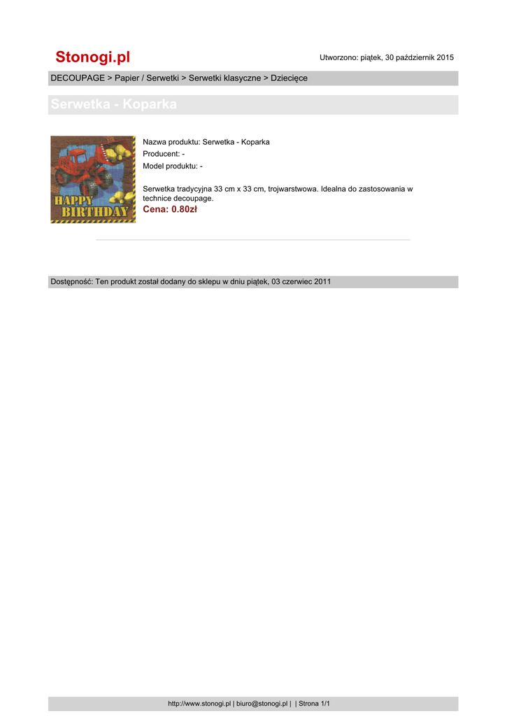 Stonogi.pl Utworzono: piątek, 30 październik 2015 DECOUPAGE > Papier / Serwetki > Serwetki klasyczne > Dziecięce Serwetka - Koparka Nazwa produktu: Serwetka - Koparka Producent: Model produktu: Serwetka tradycyjna 33 cm x 33 cm, trojwarstwowa. Idealna do zastosowania w technice decoupage. Cena: 0.80zł Dostępność: Ten produkt został dodany do sklepu w dniu piątek, 03 czerwiec 2011 http://www.stonogi.pl | [email protected] | | Strona 1/1