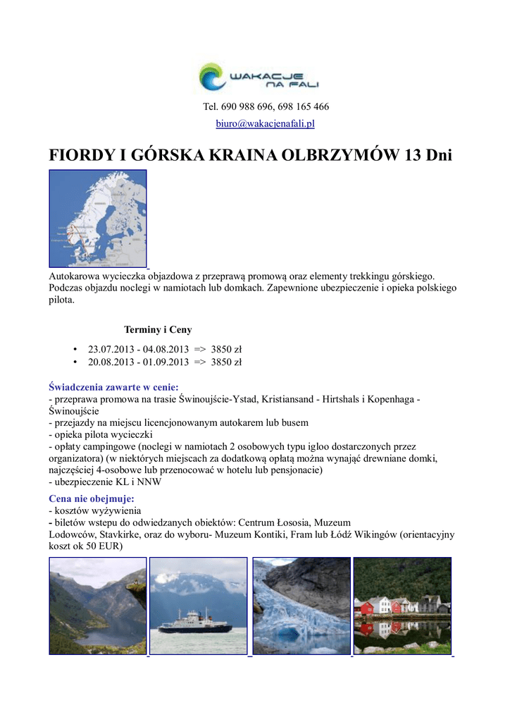 Tel. 690 988 696, 698 165 466 [email protected] FIORDY I GÓRSKA KRAINA OLBRZYMÓW 13 Dni Autokarowa wycieczka objazdowa z przeprawą promową oraz elementy trekkingu górskiego. Podczas objazdu noclegi w namiotach lub domkach. Zapewnione ubezpieczenie i opieka polskiego pilota. Terminy i Ceny • • 23.07.2013 - 04.08.2013 => 3850 zł 20.08.2013 - 01.09.2013 => 3850 zł Świadczenia zawarte w cenie: - przeprawa promowa na trasie Świnoujście-Ystad, Kristiansand - Hirtshals i Kopenhaga Świnoujście - przejazdy na miejscu licencjonowanym autokarem lub busem - opieka pilota wycieczki - opłaty campingowe (noclegi w namiotach 2 osobowych typu igloo dostarczonych przez organizatora) (w niektórych miejscach za dodatkową opłatą można wynająć drewniane domki, najczęściej 4-osobowe lub przenocować w hotelu lub pensjonacie) - ubezpieczenie KL i NNW Cena nie obejmuje: - kosztów wyżywienia - biletów wstepu do odwiedzanych obiektów: Centrum Łososia, Muzeum Lodowców, Stavkirke, oraz do wyboru- Muzeum Kontiki, Fram lub Łódź Wikingów (orientacyjny koszt ok 50 EUR) Program 1 dzień POZNAŃ Wyjazd z Poznania ok. godz. 15.00 Zapewniamy odbiór z dworca PKP wszystkich przyjeżdżających spoza Poznania. Przejazd do Świnoujścia. Noc na promie. 2 dzień SZWECJA - GOETEBORG Poznajemy Szwecję: Goeteborg - spacer po centrum, Tanum - obszar wpisany przez UNESCO na listę Światowego Dziedzictwa Kultury. Znajdują się tu stanowiska sztuki naskalnej pochodzące z epoki brązu. Następnie przejeżdżamy do Oslo, nocleg na campingu. 3 dzień OSLO - GÓRY JOTUNHEIMEN Miasto Oslo poznajemy korzystając z miejskich rowerów. Zobaczymy centrum, ratusz, parlament, pałac królewski, nabrzeże portowe. Odwiedzimy także słynny, pełen rzeźb Park Vigelanda, a zwiedzanie zakończymy w jednym z wielu muzeów zlokalizowanych na półwyspie muzealnym Bygdoy. Po południu przejedziemy do Parku Narodowego Jotunheimen obejmującego najwyższą część Gór Skandynawskich, tam zakwaterowanie na campingu. 4 dzień TREKKING GÓRSKI NA BESSEGEN Całodniowy trekking górski. Najpierw przepłyniemy statkiem przez szmaragdowo-zielone wody Jeziora Gjende. Drogę powrotną pokonamy granią, którą biegnie jeden z najpiękniejszych szlaków górskich Norwegii. Zdobędziemy szczyt Bessegen - roztacza się z niego przepiękny widok na jezioro, lodowce i góry Skandynawskie (czas przejścia ok. 7-8 godz.). Nocleg na campingu. 5 dzień LODOWIEC NIGARDSBREEN lub GALDHOPIGGEN Wcześnie rano wyjazd z campingu. Przejazd do Gaupne pod lodowiec Jostedalsbreen - trekking do jęzora lodowca Nigardsbreen. Opcjonalnie (zamiennie dla chętnych) możliwość zdobycia najwyższego szczytu Norwegii Galdhopiggen (2469 m.n.p.m.) Czas przejścia ok. 6 – 7 godz. (Nie wymaga żadnego specjalnego sprzętu). Wieczorem przejazd w okolice Lom. 6 dzień GEIRANGER - 7 SIÓSTR Rano zwiedzamy miejscowości Lom z typowym dla norweskiej architektury sakralnej drewnianym kościółkiem (Stavkirke). Następnie wyruszamy w drogę do Geiranger, miejscowości leżącej na początku Geirangerfjorden - najbardziej urokliwego fiordu Norwegii. Po drodze wjedziemy na szczyt Dalsnibby (1500 m n.p.m.), skąd rozpościera się widok na cały fiord. Dalej już z pokładu promu podziwiamy strome ściany Geirangerfjorden i piękny Wodospad Siedmiu Sióstr. 7 dzień LODOWIEC Przejazd do Parku Narodowego Jostedalsbreen chroniącego największy lodowiec w kontynentalnej części Europy. Wycieczka na jęzor lodowcowy. Następnie krótka wizyta na innym lodowcu Boyabreen. Fjaerland - Norweskie Muzeum Lodowców - multimedialna skarbnica wiedzy o lodzie. Przejazd do Laerdal - małego zabytkowego miasteczka znanego z funkcjonującego tutaj Centrum Łososia - tu dowiemy się wszystkiego o tych niezwykłych i smacznych rybach. 8 dzień LAERDAL - BERGEN Przejazd jednym z najdłuższych tuneli drogowych świata (24,5 km), zapoznamy się z jego rozświetlonymi na niebiesko salami. Następnie krótki postój we Flam - miejscowości rozsławionej przez kolej górską zaczynającą tutaj swój bieg. Popołudnie spędzimy w Bergen - stolicy fiordów. Spacer po zabytkowym Bryggen i słynnym targu rybnym, gdzie można kupić świeże owoce morza, ryby, a nawet kanapkę z mięsem z wieloryba. 9 dzeń HARDANGERVIDDA – WODOSPAD VORINGSFOSSEN Przejazd do wodospadu Voringsfossen. 2 godzinny spacer doliną, pod samą kaskadę wodospadu. Dla chętnych wizyta w Centrum Parku Narodowego Hardangervidda – ekspozycja poświęcona przyrodzie i osadnictwu na płaskowyżu. (wstęp ok. 100 NOK). Przejazd malowniczą drogą wzdłuż płaskowyżu Hardangervidda. 10 dzień PREKESTOLEN - AMBONA SKALNA Piesza wycieczka na punkt widokowy na Lysefjord, zdobywamy słynną ambonę Prekestolen (naga, granitowa skała wznosząca się pionowo 600 metrów nad poziom wody). 11 dzień PLAŻA MANDAL Przejazd na południe Norwegii, odpoczynek i kąpiel na najdłuższej norweskiej plaży, w najdalej na południe wysuniętym mieście Norwegii - Mandal. Nocleg na campingu nad morzem. 12 dzień DANIA - KOPENHAGA Przeprawa promowa przez cieśninę Skagerrak do Danii. Przejazd do Kopenhagi. Spacer po centrum. Wieczorem odpływamy promem do Świnoujścia. 13 dzień Przypływamy do Świnoujścia w godzinach rannych. Powrót do domu Dodatkowe Informacje Charakter wyprawy Wyprawa przebiega wg ustalonego, sprawdzonego programu, który został już zweryfikowany wcześniej. Nad wszystkim czuwa doświadczony pilot, który zna teren i możliwości, zajmuje się organizacją i załatwianiem formalności. Program możemy w miarę możliwości modyfikować (rozbudowywać) zgodnie z Waszymi zainteresowaniami oraz możliwościami pogodowymi. Transport Jedziemy minibusem osobowym. W zależności od ilości uczestników jest to Mercedes Sprinter (15 os.) lub VW Caravelle (8 os.). Samochód jest zawsze klimatyzowany i posiada odtwarzacz CD/DVD/mp3 oraz dużą przestrzeń bagażową. Przeprawa promowa Przeprawa promowa Świn