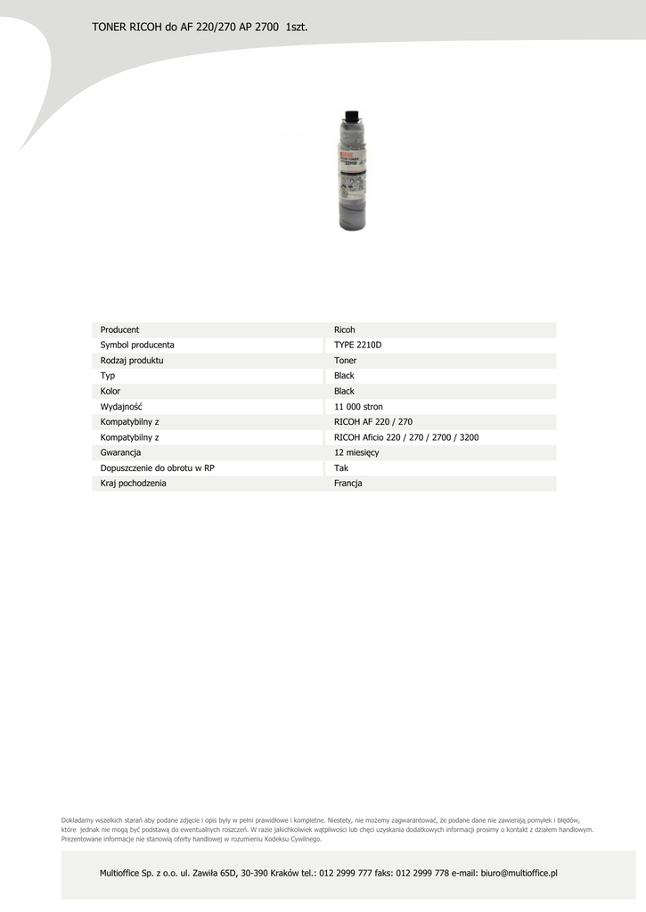 TONER RICOH do AF 220/270 AP 2700 1szt. Producent Ricoh Symbol producenta TYPE 2210D Rodzaj produktu Toner Typ Black Kolor Black Wydajność 11 000 stron Kompatybilny z RICOH AF 220 / 270 Kompatybilny z RICOH Aficio 220 / 270 / 2700 / 3200 Gwarancja 12 miesięcy Dopuszczenie do obrotu w RP Tak Kraj pochodzenia Francja Dokładamy wszelkich starań aby podane zdjęcie i opis były w pełni prawidłowe i kompletne. Niestety, nie możemy zagwarantować, że podane dane nie zawierają pomyłek i błędów, które jednak nie mogą być podstawą do ewentualnych roszczeń. W razie jakichkolwiek wątpliwości lub chęci uzyskania dodatkowych informacji prosimy o kontakt z działem handlowym. Prezentowane informacje nie stanowią oferty handlowej w rozumieniu Kodeksu Cywilnego. Multioffice Sp. z o.o. ul. Zawiła 65D, 30-390 Kraków tel.: 012 2999 777 faks: 012 2999 778 e-mail: [email protected]