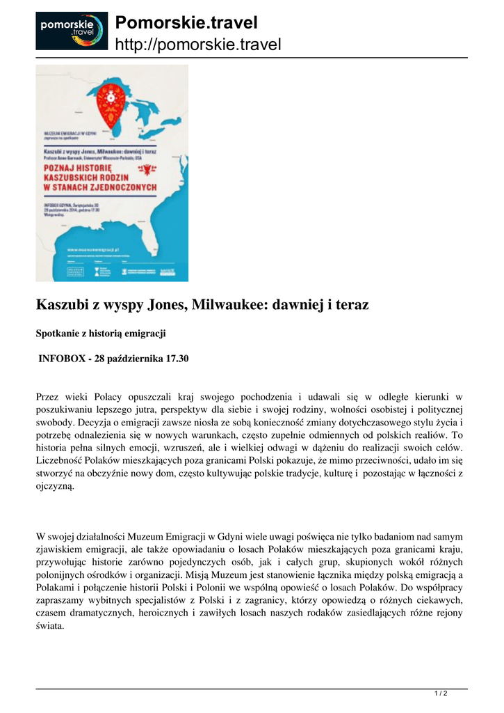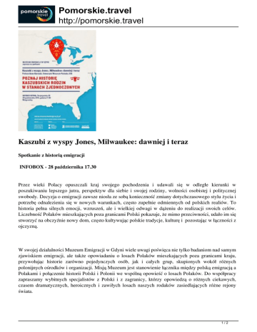 Pomorskie.travel http://pomorskie.travel Kaszubi z wyspy Jones, Milwaukee: dawniej i teraz Spotkanie z historią emigracji INFOBOX - 28 października 17.30 Przez wieki Polacy opuszczali kraj swojego pochodzenia i udawali się w odległe kierunki w poszukiwaniu lepszego jutra, perspektyw dla siebie i swojej rodziny, wolności osobistej i politycznej swobody. Decyzja o emigracji zawsze niosła ze sobą konieczność zmiany dotychczasowego stylu życia i potrzebę odnalezienia się w nowych warunkach, często zupełnie odmiennych od polskich realiów. To historia pełna silnych emocji, wzruszeń, ale i wielkiej odwagi w dążeniu do realizacji swoich celów. Liczebność Polaków mieszkających poza granicami Polski pokazuje, że mimo przeciwności, udało im się stworzyć na obczyźnie nowy dom, często kultywując polskie tradycje, kulturę i pozostając w łączności z ojczyzną. W swojej działalności Muzeum Emigracji w Gdyni wiele uwagi poświęca nie tylko badaniom nad samym zjawiskiem emigracji, ale także opowiadaniu o losach Polaków mieszkających poza granicami kraju, przywołując historie zarówno pojedynczych osób, jak i całych grup, skupionych wokół różnych polonijnych ośrodków i organizacji. Misją Muzeum jest stanowienie łącznika między polską emigracją a Polakami i połączenie historii Polski i Polonii we wspólną opowieść o losach Polaków. Do współpracy zapraszamy wybitnych specjalistów z Polski i z zagranicy, którzy opowiedzą o różnych ciekawych, czasem dramatycznych, heroicznych i zawiłych losach naszych rodaków zasiedlających różne rejony świata. 1/2 Pomorskie.travel http://pomorskie.travel Szczegóły wydarzenia Zapraszamy na spotkanie z Profesor Anne Gurnack z Uniwersytetu Wisconsin-Parkside, USA, która opowie o niezwykłej historii Kaszubów, zamieszkujących niegdyś wyspę Jones Island na jeziorze Michigan w Stanie Wisconsin. Zagadnienie emigracji z Kaszub do Ameryki Północnej nieustannie wzbudza zainteresowanie i żywe emocje, tak w naszym regionie, jak i w skupiskach polonijnych, tym bardziej, że jest to temat stosunkowo mniej opracowany niż na przykład zagadnienie kaszubskiej emigracji do Kanady. W kraju „klonowego liścia” swoje badania prowadził choćby dr Jan Drzeżdżon, a o Kaszubach i ich potomkach tam żyjących możemy przeczytać m. in. w publikacjach prof. Józefa Borzyszkowskiego, Izabeli Jost, Kazimierza Ickiewicza czy ks. Władysława Szulista, który opisywał również osadnictwo w USA. Tym bardziej cieszy aktywność na polach zachowania pamięci i popularyzacji wiedzy badaczy zza oceanu, takich jak profesor Anne Gurnack. Jej prelekcja przybliży wyjątkowe miejsce – wyspę Jones oraz ludzi, którzy je współtworzyli, ukazane na szerszym tle emigracji z obszaru Kaszub. Kaszubi byli jednymi z pierwszych polskich emigrantów w Milwaukee, dla których okolice jeziora Michigan stały się nową ojczyzną. Na wyspie Jones odnaleźli amerykański odpowiednik kaszubskiej przyrody i możliwość kontynuowania swojego stylu życia jako rybacy. Stworzyli tam silną polską społeczność, która zamieszkiwała te tereny do czasu przymusowego wysiedlenia w związku z rozbudową portu przez Illinois Steel Company. Mimo iż od 1940 roku Kaszubi nie mieszkają już na wyspie, są z nią silnie związani i raz do roku spotykają się w utworzonym tam specjalnie dla nich Parku Kaszubskim, by wspólnie celebrować pamięć o „swojej wyspie” i swoim kaszubskim pochodzeniu. Profesor Anne Gurnack Emerytowana profesor Uniwersytetu Wisconsin-Parkside. Profesor Gurnack kierowała Wydziałem Politologii, Prawa i Filozofii na Uniwersytecie Wisconsin-Parkside, była także Kierownikiem Studiów Interdyscyplinarnych na tej uczelni. Przedmiotem jej badań jest Polonia nowojorska i Polonia z Milwaukee. Wykład prowadzony będzie w języku angielskim, z równoległym tłumaczeniem na język polski. Spotkanie zorganizowano w ramach współpracy z Wydziałem Historycznym Uniwersytetu Gdańskiego. Wstęp wolny. PCIT 2/2 Powered by TCPDF (www.tcpdf.org)