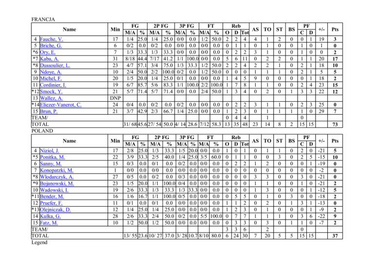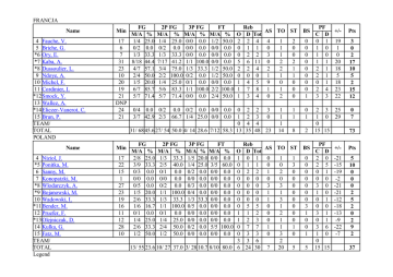 FRANCJA Name 4 Fauche, V. 5 Briche, G. *6 Ory, E. *7 Kaba, A. *8 Dussoulier, L. 9 Ndoye, A. 10 Michel, F. 11 Cordinier, I. *12 Smock, Y. 13 Wallez, A. *14 Eliezer-Vanerot, C. 15 Brun, P. TEAM/ TOTAL POLAND Name 4 Niziol, J. *5 Ponitka, M. 6 Sanny, M. 7 Konopatzki, M. *8 Wlodarczyk, A. *9 Bojanowski, M. 10 Wadowski, I. *11 Bender, M. 12 Pruefer, F. *13 Olejniczak, D. 14 Kulka, G. 15 Fatz, M. TEAM/ TOTAL Legend Min 17 6 7 31 23 10 20 19 21 DNP 24 21 Min 17 22 15 1 27 23 19 16 11 12 28 10 FG M/A % 1/4 25.0 0/2 0.0 1/3 33.3 8/18 44.4 4/7 57.1 2/4 50.0 1/5 20.0 6/7 85.7 5/7 71.4 2P FG 3P FG FT M/A % M/A % M/A % 1/4 25.0 0/0 0.0 1/2 50.0 0/2 0.0 0/0 0.0 0/0 0.0 1/3 33.3 0/0 0.0 0/0 0.0 7/17 41.2 1/1 100.0 0/0 0.0 3/4 75.0 1/3 33.3 1/2 50.0 2/2 100.0 0/2 0.0 1/2 50.0 1/4 25.0 0/1 0.0 0/0 0.0 5/6 83.3 1/1 100.0 2/2 100.0 5/7 71.4 0/0 0.0 2/4 50.0 0/4 0.0 0/2 3/7 42.9 2/3 O 2 0 0 5 2 0 1 1 1 0 1 0 31/ 68 45.6 27/ 54 50.0 4/ 14 28.6 7/12 58.3 13 FG M/A % 2/8 25.0 3/9 33.3 0/3 0.0 0/0 0.0 0/5 0.0 1/5 20.0 2/6 33.3 1/6 16.7 0/1 0.0 1/4 25.0 2/6 33.3 1/2 50.0 0.0 0/2 0.0 0/0 0.0 66.7 1/4 25.0 0/0 0.0 2P FG 3P FG FT M/A % M/A % M/A % 1/3 33.3 1/5 20.0 0/0 0.0 2/5 40.0 1/4 25.0 3/5 60.0 0/1 0.0 0/2 0.0 0/0 0.0 0/0 0.0 0/0 0.0 0/0 0.0 0/2 0.0 0/3 0.0 0/0 0.0 1/1 100.0 0/4 0.0 0/0 0.0 1/3 33.3 1/3 33.3 0/0 0.0 1/1 100.0 0/5 0.0 0/0 0.0 0/1 0.0 0/0 0.0 0/0 0.0 1/4 25.0 0/0 0.0 0/0 0.0 2/4 50.0 0/2 0.0 5/5 100.0 1/2 50.0 0/0 0.0 0/0 0.0 O 1 0 0 0 0 0 0 0 1 1 0 0 3 13/ 55 23.6 10/ 27 37.0 3/ 28 10.7 8/10 80.0 6 Reb D Tot 2 4 1 1 2 2 6 11 2 4 0 0 4 5 7 8 3 4 2 2 4 35 AS TO ST BS 4 0 3 0 2 1 9 1 0 1 1 1 2 2 1 0 1 2 2 0 0 2 1 1 0 0 0 0 0 0 0 0 0 0 0 1 2 3 3 0 4 48 23 1 1 1 14 1 1 0 1 8 2 Reb D Tot 0 1 1 1 2 2 0 0 0 0 0 0 0 0 5 5 1 2 2 3 7 7 3 3 3 6 24 30 AS TO ST 0 0 1 0 3 1 1 0 0 0 1 0 7 1 0 2 0 3 1 3 1 2 1 1 3 2 20 BS 1 3 0 0 0 0 0 0 0 0 1 0 0 0 0 0 0 0 0 3 1 0 0 1 5 5 PF C D 0 1 1 0 1 0 1 1 2 1 2 1 0 1 2 4 3 3 +/- Pts 19 1 0 20 18 5 18 23 22 3 0 2 17 10 5 2 15 12 2 3 25 1 0 29 0 15 15 0 7 PF C D 2 0 2 5 0 1 0 0 3 0 1 0 0 1 0 0 3 1 0 1 3 6 1 0 0 15 15 73 +/- Pts -21 -15 -19 -2 -21 -21 -12 -18 -13 -9 -22 -7 5 10 0 0 0 2 5 2 0 2 9 2 37 MinMinutes played TotTotal rebounds BSBlocked shots