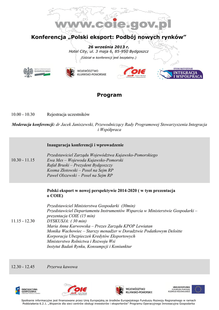 Konferencja „Polski eksport: Podbój nowych rynków” 26 września 2013 r. Hotel City, ul. 3 maja 6, 85-950 Bydgoszcz (Udział w konferencji jest bezpłatny.) Program 10.00 - 10.30 Rejestracja uczestników Moderacja konferencji: dr Jacek Janiszewski, Przewodniczący Rady Programowej Stowarzyszenia Integracja i Współpraca Inauguracja konferencji i wprowadzenie 10.30 - 11.15 Przedstawiciel Zarządu Województwa Kujawsko-Pomorskiego Ewa Mes – Wojewoda Kujawsko-Pomorski Rafał Bruski – Prezydent Bydgoszczy Kosma Złotowski – Poseł na Sejm RP Paweł Olszewski – Poseł na Sejm RP Polski eksport w nowej perspektywie 2014-2020 ( w tym prezentacja o COIE) 11.15 - 12.30 12.30 - 12.45 Przedstawiciel Ministerstwa Gospodarki (30min) Przedstawiciel Departamentu Instrumentów Wsparcia w Ministerstwie Gospodarki – prezentacja COIE (15 min) DYSKUSJA: ( 30 min) Maria Anna Karwowska – Prezes Zarządu KPOP Lewiatan Monika Wachowiec – Starszy menadżer w Doradztwie Podatkowym Deloitte Korporacja Ubezpieczeń Kredytów Eksportowych Ministerstwo Rolnictwa i Rozwoju Wsi Instytut Badań Rynku, Konsumpcji i Koniunktur Przerwa kawowa Spotkanie informacyjne jest finansowane przez Unię Europejską ze środków Europejskiego Funduszu Rozwoju Regionalnego w ramach Poddziałania 6.2.1. „Wsparcie dla sieci centrów obsługi inwestorów i eksporterów” Programu Operacyjnego Innowacyjna Gospodarka Konferencja „Polski eksport: Podbój nowych rynków” 26 września 2013 r. Hotel City, ul. 3 maja 6, 85-950 Bydgoszcz (Udział w konferencji jest bezpłatny.) Uwarunkowania i ograniczenia eksportu na rynkach wschodnich - Pomorze trampoliną współpracy z Rosją. 12.45 - 13.45 Józef Oleksy – Premier RP w latach 2005-2006 Ambasada Rosji w Polsce Ministerstwo Spraw Zagranicznych Obwód Kaliningrad Obwód Ługańsk Izba Celna w Toruniu Nowe wyzwania gospodarcze dla polskiego eksportu: Afryka 13.45 – 14.45 14.45 – 15.15 Przedstawiciel Ministerstwa Gospodarki – prezentacja programu „Go Africa” (15min) Przedstawiciel THINKTANK – prezentacja „Polska-Afryka. Gdzie szukać gospodarczych szans?” (15 min) Ambasada Demokratycznej Republiki Konga (15min) Przedstawiciel/e przedsiębiorców z Kongo Ambasada Republiki Południowej Afryki (15min) Lunch Nowe wyzwania gospodarcze dla polskiego eksportu: Ameryka Południowa 15.15 - 16.15 dr Joanna Gocłowska- Bolek, Centrum Studiów Latynoamerykańskich (CESLA UW) – Rola i pozycja Ameryki Łacińskiej w gospodarce światowej. Przypadek Brazylii– prezentacja( 15min) Instytut Badań Rynku, Konsumpcji i Koniunktur – Rynki zagraniczne dla polskiego biznesu: Kraje Ameryki Łacińskiej - Argentyna, Brazylia, Kolumbia. – prezentacja Argentyna + Kolumbia (30 min) Ambasada Brazylii ( 15 min) Spotkanie informacyjne jest finansowane przez Unię Europejską ze środków Europejskiego Funduszu Rozwoju Regionalnego w ramach Poddziałania 6.2.1. „Wsparcie dla sieci centrów obsługi inwestorów i eksporterów” Programu Operacyjnego Innowacyjna Gospodarka Konferencja „Polski eksport: Podbój nowych rynków” 26 września 2013 r. Hotel City, ul. 3 maja 6, 85-950 Bydgoszcz (Udział w konferencji jest bezpłatny.) Właściwe działania marketingowe na rynkach zagranicznych 16.15-17.00 Przedstawiciel agencji PR – strategie marketingowe a działania PR - wstęp (10min) Przedstawiciel agencji PR – ekspansja na rynki zagraniczne – case study (15min) Maria Anna Karwowska – Prezes Zarządu KPOP Lewiatan – ekspansja na rynki wschodnie – case study (20min) Spotkanie informacyjne jest finansowane przez Unię Europejską ze środków Europejskiego Funduszu Rozwoju Regionalnego w ramach Poddziałania 6.2.1. „Wsparcie dla sieci centrów obsługi inwestorów i eksporterów” Programu Operacyjnego Innowacyjna Gospodarka