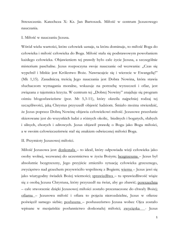 Streszczenie. Katecheza X: Ks. Jan Bartoszek. Miłość w centrum Jezusowego nauczania. I. Miłość w nauczaniu Jezusa. Wśród wielu wartości, które człowiek uznaje, ta która dominuje, to miłość Boga do człowieka i miłość człowieka do Boga. Miłość stała się podstawowym powołaniem każdego człowieka. Objawieniem tej prawdy było całe życie Jezusa, a szczególnie misterium paschalne. Jezus rozpoczyna swoje nauczanie od wezwania: „Czas się wypełnił i bliskie jest Królestwo Boże. Nawracajcie się i wierzcie w Ewangelię!” (Mk 1,15). Zasadniczą treścią Jego nauczania jest Dobra Nowina, która stawia słuchaczom wymagania moralne, wskazuje na potrzebę wyrzeczeń i ofiar, jest związana z tajemnica krzyża. W centrum tej „Dobrej Nowiny” znajduje się program ośmiu błogosławieństw (por. Mt 5,3-11), który określa najpełniej rodzaj tej szczęśliwości, jaką Chrystus przyszedł objawić ludziom. Śmiało można stwierdzić, że Jezus poprzez Dobrą Nowinę objawia człowiekowi miłość. Jezusowe przesłanie skierowane jest do wszystkich ludzi z różnych okolic, biednych i bogatych, słabych i silnych, chorych i zdrowych. Jezus objawił prawdę o Bogu jako Bogu miłości, a w swoim człowieczeństwie stał się znakiem odwiecznej miłości Boga. II. Przymioty Jezusowej miłości. Miłość Jezusowa jest: doskonała – to ideał, który odpowiada wizji człowieka jako osoby wolnej, wezwanej do uczestnictwa w życiu Bożym; bezgrzeszna – Jezus był absolutnie bezgrzeszny, Jego przyjście zmieniło sytuację człowieka grzesznego, zwycięstwo nad grzechem przywróciło wspólnotę z Bogiem; wierna – Jezus jawi się jako wiarygodny świadek Bożej wierności; sprawiedliwa – tu sprawiedliwość wiąże się z osobą Jezusa Chrystusa, który przyszedł na świat, aby go zbawić; powszechna – całe stworzenie dzięki Jezusowej miłości zostało przeznaczone do chwały Bożej; ofiarna – Jezusowa miłość i ofiara to pojęcia nierozdzielne, Jezus w ofierze poświęcił samego siebie; posłuszna – posłuszeństwo Jezusa wobec Ojca zostało wpisane w mesjańskie posłannictwo doskonałej miłości; zwycięska - Jezus 1 zwycięża zło dobrem, zwyciężyła miłość; zobowiązująca – w drodze człowieka ku ostatecznemu celowi nic nie może dokonać się bez Chrystusa. Wypełnienie w życiu Bożego prawa miłości jest dla człowieka najważniejszą drogą do zbawienia. Ta droga została wyznaczona przez Chrystusa. Jego miłość jest zobowiązująca dla całej wspólnoty ludzkiej; troskliwa – opiekuńcza, Jezus uzdrawiał, czynił cuda, dobrze czynił każdemu człowiekowi; ponadczasowa – Jezus przyniósł wszystkim ludziom szanse powrotu do Boga. Wymienione przymioty miłości Jezusowej, nasuwają wnioski duszpasterskiego działania. To działania służące osobistemu umocnieniu wiary poprzez lekturę Pisma Świętego. Uwagę należy zwrócić na sakrament chrztu i jego znaczenie dla rozwoju wiary i czynne uczestnictwo w Eucharystii. Trzeba stworzyć warsztat, który pomoże formować siebie i innych. Konieczna jest również społeczna wrażliwość, która powinna obejmować rodziny, miejsca pracy, wszystkie przestrzenie, gdzie obecny jest człowiek. Te powyższe założenia, przymioty Jezusowej miłości mogą być inspiracją do dyskusji nad tematem: jak ja rozumiem pojęcie miłości? 2