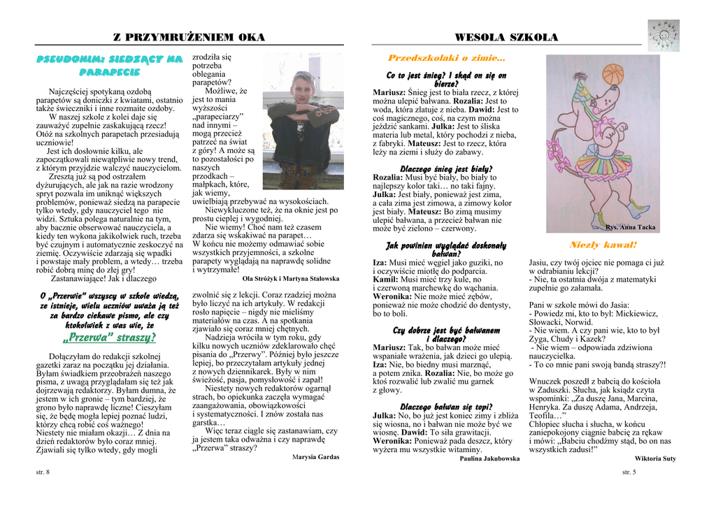 Z PRZYMRUŻENIEM OKA pseudonim: siedzący na parapecie Najczęściej spotykaną ozdobą parapetów są doniczki z kwiatami, ostatnio także świeczniki i inne rozmaite ozdoby. W naszej szkole z kolei daje się zauważyć zupełnie zaskakującą rzecz! Otóż na szkolnych parapetach przesiadują uczniowie! Jest ich dosłownie kilku, ale zapoczątkowali niewątpliwie nowy trend, z którym przyjdzie walczyć nauczycielom. Zresztą już są pod ostrzałem dyżurujących, ale jak na razie wrodzony spryt pozwala im uniknąć większych problemów, ponieważ siedzą na parapecie tylko wtedy, gdy nauczyciel tego nie widzi. Sztuka polega naturalnie na tym, aby bacznie obserwować nauczyciela, a kiedy ten wykona jakikolwiek ruch, trzeba być czujnym i automatycznie zeskoczyć na ziemię. Oczywiście zdarzają się wpadki i powstaje mały problem, a wtedy… trzeba robić dobrą minę do złej gry! Zastanawiające! Jak i dlaczego O „Przerwie” wszyscy w szkole wiedzą, ze istnieje, istnieje, wielu uczniów uważa ją też za bardzo ciekawe pismo, ale czy ktokolwiek z was wie, że „Przerwa” straszy? Dołączyłam do redakcji szkolnej gazetki zaraz na początku jej działania. Byłam świadkiem przeobrażeń naszego pisma, z uwagą przyglądałam się też jak dojrzewają redaktorzy. Byłam dumna, że jestem w ich gronie – tym bardziej, że grono było naprawdę liczne! Cieszyłam się, że będę mogła lepiej poznać ludzi, którzy chcą robić coś ważnego! Niestety nie miałam okazji… Z dnia na dzień redaktorów było coraz mniej. Zjawiali się tylko wtedy, gdy mogli str. 8 WESOŁA SZKOŁA zrodziła się potrzeba oblegania parapetów? Możliwe, że jest to mania wyższości „parapeciarzy” nad innymi – mogą przecież patrzeć na świat z góry! A może są to pozostałości po naszych przodkach – małpkach, które, jak wiemy, uwielbiają przebywać na wysokościach. Niewykluczone też, że na oknie jest po prostu cieplej i wygodniej. Nie wiemy! Choć nam też czasem zdarza się wskakiwać na parapet… W końcu nie możemy odmawiać sobie wszystkich przyjemności, a szkolne parapety wyglądają na naprawdę solidne i wytrzymałe! Ola Stróżyk i Martyna Stałowska Przedszkolaki o zimie… Co to jest śnieg? I skąd on się on bierze? Mariusz: Śnieg jest to biała rzecz, z której można ulepić bałwana. Rozalia: Jest to woda, która zlatuje z nieba. Dawid: Jest to coś magicznego, coś, na czym można jeździć sankami. Julka: Jest to śliska materia lub metal, który pochodzi z nieba, z fabryki. Mateusz: Jest to rzecz, która leży na ziemi i służy do zabawy. Dlaczego śnieg jest biały? Rozalia: Musi być biały, bo biały to najlepszy kolor taki… no taki fajny. Julka: Jest biały, ponieważ jest zima, a cała zima jest zimowa, a zimowy kolor jest biały. Mateusz: Bo zimą musimy ulepić bałwana, a przecież bałwan nie może być zielono – czerwony. Jak powinien wyglądać doskonały bałwan? Iza: Musi mieć węgiel jako guziki, no i oczywiście miotłę do podparcia. Kamil: Musi mieć trzy kule, no i czerwoną marchewkę do wąchania. Weronika: Nie może mieć zębów, ponieważ nie może chodzić do dentysty, bo to boli. zwolnić się z lekcji. Coraz rzadziej można było liczyć na ich artykuły. W redakcji rosło napięcie – nigdy nie mieliśmy materiałów na czas. A na spotkania zjawiało się coraz mniej chętnych. Nadzieja wróciła w tym roku, gdy kilku nowych uczniów zdeklarowało chęć pisania do „Przerwy”. Później było jeszcze lepiej, bo przeczytałam artykuły jednej z nowych dziennikarek. Były w nim świeżość, pasja, pomysłowość i zapał! Niestety nowych redaktorów ogarnął strach, bo opiekunka zaczęła wymagać zaangażowania, obowiązkowości i systematyczności. I znów została nas garstka… Więc teraz ciągle się zastanawiam, czy ja jestem taka odważna i czy naprawdę „Przerwa” straszy? Dlaczego bałwan się topi? Julka: No, bo już jest koniec zimy i zbliża się wiosna, no i bałwan nie może być we wiosnę. Dawid: To siła grawitacji. Weronika: Ponieważ pada deszcz, który wyżera mu wszystkie witaminy. Marysia Gardas Paulina Jakubowska Czy dobrze jest być bałwanem i dlaczego? Mariusz: Tak, bo bałwan może mieć wspaniałe wrażenia, jak dzieci go ulepią. Iza: Nie, bo biedny musi marznąć, a potem znika. Rozalia: Nie, bo może go ktoś rozwalić lub zwalić mu garnek z głowy. Rys. Anna Tacka Niezły kawał! Jasiu, czy twój ojciec nie pomaga ci już w odrabianiu lekcji? - Nie, ta ostatnia dwója z matematyki zupełnie go załamała. Pani w szkole mówi do Jasia: - Powiedz mi, kto to był: Mickiewicz, Słowacki, Norwid. - Nie wiem. A czy pani wie, kto to był Zyga, Chudy i Kazek? - Nie wiem – odpowiada zdziwiona nauczycielka. - To co mnie pani swoją bandą straszy?! Wnuczek poszedł z babcią do kościoła w Zaduszki. Słucha, jak ksiądz czyta wspominki: „Za duszę Jana, Marcina, Henryka. Za duszę Adama, Andrzeja, Teofila…” Chłopiec słucha i słucha, w końcu zaniepokojony ciągnie babcię za rękaw i mówi: „Babciu chodźmy stąd, bo on nas wszystkich zadusi!” Wiktoria Suty str. 5 str. 8 str. 5