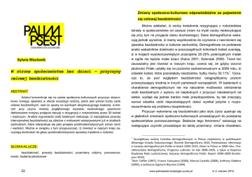 Zmiany społeczno-kulturowe odpowiedzialne za pojawienie się celowej bezdzietności Sylwia Wacławik W stronę społeczeństwa bez dzieci – przyczyny celowej bezdzietności ABSTRAKT Artykuł koncentruje się na opisie społeczno-kulturowych przyczyn stosunkowo nowego zjawiska w sferze socjologii rodziny, jakim jest wzrost liczby osób celowo bezdzietnych. Jest on oparty na wynikach eksploracyjnego badania, w którym przy użyciu metody pogłębionego wywiadu swobodnego ujawniono deklarowane motywy podjęcia decyzji o rezygnacji z rodzicielstwa przez 30 kobiet i mężczyzn. Analiza wypowiedzi osób badanych wskazuje, iż najczęstsze powody intencjonalnej bezdzietności są zbieżne z motywami wskazywanymi już w studiach zachodnich, które interpretuje się jako przejaw postmodernistycznych zmian norm i wartości. Można w związku z tym przypuszczać, iż również w naszym kraju zaczynają dochodzić do głosu postmodernistyczne sposoby myślenia o rodzinie. Można zakładać, iż osoby świadomie rezygnujące z rodzicielstwa istniały w społeczeństwie od zawsze (mam na myśli osoby niedecydujące się przy tym na przyjęcie stanu duchownego). Dane demograficzne wskazują jednak wyraźnie, iż mamy współcześnie do czynienia z nasi-leniem się zjawiska bezdzietności w kulturze zachodniej. Demografowie na podstawie analiz wskaźników dzietności w poszczególnych kohortach kobiet oceniają, iż w krajach wysokorozwiniętych przeciętnie 20-25% potencjalnych matek w ogóle nie będzie miała dzieci (Kalus 2001; Szlendak 2008). Trend ten zauważalny jest również w naszym kraju: ocenia się, że gdyby wzorce płodności Polek ustaliły się na poziomie zaobserwowanym w 2008 roku, to odsetek kobiet, które pozostałyby bezdzietne, byłby równy 30,11%1. Oznacza to, że pod względem bezdzietności osiągnęlibyśmy poziom przewyższający średnią w innych państwach europejskich. W badaniach o charakterze demograficznym nie ma naturalnie możliwości odróżnienia osób bezdzietnych z wyboru od niepłodnych z przyczyn niezależnych od siebie, wydaje się jednak bardzo mało prawdopodobne, by tak znaczący wzrost odsetka osób nieposiadających dzieci wynikał jedynie z rozpowszechnienia się problemu bezpłodności. Przyczyn wyłonienia się bezdzietności jako stylu życia upatruje się w głębokich zmianach społeczno-kulturowych prowadzących do powstania społeczeństwa ponowoczesnego. Badacze tego fenomenu2 wskazują na następujące czynniki prowadzące do takiej przemiany: zmiana charakteru 1 SŁOWA-KLUCZE: bezdzietność, powody bezdzietności, przemiany rodziny, ponowoczesność, badania jakościowe 22 Szczegółową analizę trendów demograficznych w Polsce znajdziemy w publikacjach Głównego Urzędu Statystycznego: Rocznik Demograficzny 2010, Podstawowe informacje o rozwoju demograficznym Polski w latach 2000–2010, Dzieci w Polsce w 2008 roku. Charakterystyka demograficzna, Prognoza Ludności na lata 2008−2035, a także w Raporcie Rządowej Rady Ludnościowej: Sytuacja demograficzna Polski. Raport 2008−2009 (Kurkiewicz 2010). 2 Alvin Toffler (1997), Francis Fukuyama (2000), Manuel Castells (2008), Anthony Giddens (2006), a zwłaszcza Zygmunt Bauman (1994). www.palimpsest.socjologia.uj.edu.pl nr 2, marzec 2012 Sylwia Wacławik, W stronę społeczeństwa bez dzieci – przyczyny celowej bezdzietności pracy w gospodarce opartej na wiedzy, kontrola urodzin, silny nacisk na indywidualizację oraz akceptacja nowych modeli funkcjonowania rodziny. Zjawiska te zainicjowały przemianę wartości i stylów życia oraz przejście od spojrzenia wspólnotowego do indywidualistycznego. Poniżej omówione zostaną najważniejsze procesy, które wpłynęły na uświadomienie możliwości indywidualnego wyboru prokreacyjnego, a także sprawiły, że część jednostek decyduje się na rezygnację z rodzicielstwa. Zmiana pozycji kobiet Rewolucja cyfrowa dała kobietom realne możliwości kariery innej niż rodzinna. Na fakt ten składają się dwa zjawiska: dominacja w gospodarce sfery usługowej, w wyniku której pojawiły się miejsca pracy odpowiednie dla kobiet, gdyż niewymagające znacznej siły fizycznej, oraz wynalezienie tabletki antykoncepcyjnej, co pozwoliło na świadome planowanie liczby i czasu poczęcia dzieci, a prokreacja przestała być koniecznością losową (Fukuyama 2000). Typowy dla współczesności nacisk na indywidualizację i samorealizację oraz coraz większe wymogi pracodawców skłoniły kobiety do inwestowania w rozwijanie własnych umiejętności i pogłębiania wiedzy. Spowodowało to rozwój ich samoświadomości i pewności siebie, a także wzrost ambicji. Na zmianę świadomości kobiet niebagatelny wpływ miał rozwój feminizmu. W jego różnych nurtach można znaleźć skrajnie odmienne podejście do kobiecości, prokreacji i macierzyństwa (por. Ślęczka 1999: 268; Putnam-Tong 2002: 40). Ogólnie można stwierdzić, iż feminizm podważa istnienie instynktu macierzyńskiego jako uniwersalnej, biologicznej potrzeby, oraz kwestionuje kulturowo określoną rolę matki. Szczególnie feminizm drugiej fali (lata 60. XX w.) odrzucił definicję kobiecości jednoznacznie związaną z macierzyństwem oraz zażądał dla kobiet prawa wyboru – wolności reprodukcyjnej, jednocześnie zachęcając kobiety do realizacji własnej cielesności oraz rozwoju kontaktu ze swoją biologią. 23 Indywidualizacja Epoka postindustrialna nazywana jest „epoką indywidualizmu” (Slany 2002: 53). Nastawienie indywidualistyczne jest dziś nie przywilejem a obowiązkiem. Od jednostek wymaga się prowadzenia niezależnego życia, kształtowania swojej tożsamości i biografii, podejmowania decyzji dotyczących norm i wartości. Konieczność samodzielnego konstytuowania swojego życia w każdym jego aspekcie czyni ze współczesnego człowieka „homo optionis” – wybór spośród wielu możliwości (Beck, Beck-Gernsheim 2005b: 5; Kluzowa, Slany 2003: 70). I