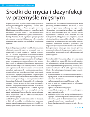 26 wyposażenie przemysłu mięsnego Środki do mycia i dezynfekcji w przemyśle mięsnym Higiena i czystość to jedne z najważniejszych czynników gwarantujących bezpieczną i zdrową żywność. Obowiązujące w Polsce przepisy prawa nakładają na przedsiębiorstwa spożywcze obowiązek wdrażania systemu HACCP, którego elementem jest Dobra Praktyka Produkcyjna (Good Manufacturing Practice). GMP reguluje i opisuje systemy utrzymania czystości i higieny na odpowiednim poziomie, zapewniającym produkcję bezpiecznej żywności. Pojęcie higieny produkcji w zakładzie mięsnym obejmuje: czystość maszyn, urządzeń oraz pomieszczeń, czystość powietrza i higienę personelu. Od kilku lat na polskim rynku można zaobserwować postęp w dziedzinie higieny produkcji. W przemyśle mięsnym przemiany te, stymulują rosnące wymagania nowoczesnych procesów technologicznych, oczekiwania klientów oraz wymagania normatywne dotyczące coraz wyższych standardów higienicznych. Wprowadzanie nowoczesnych urządzeń higienicznych i sanitarnych oraz innowacyjnych metod nie tylko umożliwia utrzymanie czystości na najwyższym poziome, ale przyczynia się do obniżenia kosztów działalności firmy. Nowe rozwiązania pozwalają na oszczędność mediów i mniejsze obciążenie ściekami środowiska naturalnego. Zmiany w procesie higienizacji prowadzą również do poprawy bezpieczeństwa, usprawnienia i komfortu pracy personelu. Zasadom higieny produkcji podporządkowane muszą być rozwiązania techniczne i konstrukcyjne maszyn i urządzeń, hal produkcyjnych, a także organizacja procesu produkcyjnego. Zakłady mięsne, ubojnie i masarnie to miejsca, w których specyfika produkcji, duże nagromadzenie materii organicznej, tłuszczów i białek powoduje powstanie sprzyjających warunków śro- dowiskowych dla rozwoju drobnoustrojów, które powodują wtórne zakażenie produktu, a także mogą być przyczyną szybszego się jego psucia. Nieusunięte pozostałości produkcyjne w zakładach przemysłu mięsnego są pożywką dla mikroorganizmów i co za tym idzie - źródłem zakażeń biologicznych. Mogą także być przyczyną skażeń substancjami toksycznymi lub szkodliwymi, jakie powstają w wyniku procesów rozkładu tych pozostałości (utlenianie, hydroliza, piroliza). Z tych względów procesy usuwania zabrudzeń w zakładach przemysłu mięsnego mają na celu głównie utrzymanie odpowiedniego stanu higieny, zarówno urządzeń technologicznych, jak i pomieszczeń produkcyjnych. Prawidłowość wykonania całego procesu mycia i dezynfekcji jest niezwykle istotna dla uzyskania odpowiedniej redukcji drobnoustrojów. Właściwie wykonane zabiegi powodują redukcję liczby drobnoustrojów o 8-10 cykli logarytmicznych. Mycie i dezynfekcja powinny przebiegać w następujących etapach: • rozmontowanie urządzeń i usunięcie widocznych gołym okiem zanieczyszczeń za pomocą szczotek, skrobaków, • spłukanie zanieczyszczeń bieżącą wodą, • mycie właściwe z zastosowaniem odpowiednich detergentów, • spłukanie środków myjących, • dezynfekcja za pomocą odpowiednich preparatów chemicznych, • dokładne spłukanie wodą środka dezynfekcyjnego i osuszenie powierzchni (nie musi być stosowane, jeśli do dezynfekcji stosuje się biodegradowalne kwasy organiczne), • kontrola skuteczności procesu mycia i dezynfekcji, cd. str. 28 28 wyposażenie przemysłu mięsnego • podjęcie działań korygujących, jeśli stwierdzi się, że proces mycia, dezynfekcji i płukania nie był skuteczny. W procesach mycia dąży się do stosowania prostych w obsłudze urządzeń technicznych, mniej agresywnych chemicznie i ekologicznych preparatów. Postęp w optymalizacji stosowanych metod i środków do mycia i dezynfekcji następuje równolegle na dwóch płaszczyznach: • wprowadzenia nowej generacji środków myjąco-dezynfekujących i dezynfekujących, • konstrukcji nowoczesnych układów myjących. Historycznie pierwsze metody konserwacji i dezynfekcji polegały na stosowaniu wyciągów roślinnych z chrzanu, czosnku, cebuli, pokrzywy czy też wodnych roztworów kwasu octowego. Kwas nadoctowy jest do tej pory jednym z najczęściej stosowanych środków bakteriobójczych używanym w wielu płynach dezynfekcyjnych. Wodorotlenek wapnia, w postaci roztworu, tzw. mleka wapiennego, jest na ogół stosowany jako środek bakterio- i grzybobójczy, np. do dezynfekcji pomieszczeń gospodarczych. Dawniej używano również sody kaustycznej - zasadowego środka myjącego, kwasu azotowego - kwaśnego środka myjącego i podchlorynu sodu - środka dezynfekującego. Dynamiczny rozwój firm oferujących środki chemiczne w ostatnich dziesięcioleciach doprowadził do powstania nowoczesnych środków do mycia i dezynfekcji. W celu zwiększenia wydajności, a przede wszystkim skuteczności procesu mycia stosuje się różne rodzaje środków powierzchniowo-czynnych. Różnią się one między innymi odczynem wytwarzanego środowiska oraz zdolnością wytwarzania czynnika myjącego jakim jest piana. Dzielą się one na: • grupę preparatów silnie zasadowych, wykorzystywanych do ciśnieniowego lub pianowego mycia pomieszczeń, maszyn i urządzeń, • zestaw preparatów zasadowych do mycia ręcznego zanieczyszczonych powierzchni, • grupę preparatów zasadowych do mycia powierzchni aluminiowych, • grupę preparatów kwaśnych do ciśnieniowego lub pianowego mycia naczyń i urządzeń, • zestaw preparatów nisko pieniąch do mycia przewodów i rurociągów transportowych. Obecnie używane środki chemiczne zawierają w swoim składzie substancje dodatkowe obniżające napięcie powierzchniowe, zapobiegające pienieniu się środków myjących czy wręcz przeciwnie tworzących gęstą i trwałą pianę, inhibitory korozji itp. Kolejnymi po myciu procesami wymagającymi dużej staranności są czynności związane z dezynfekcją, realizowane z zastosowaniem metod fizycznych (mechaniczne dział