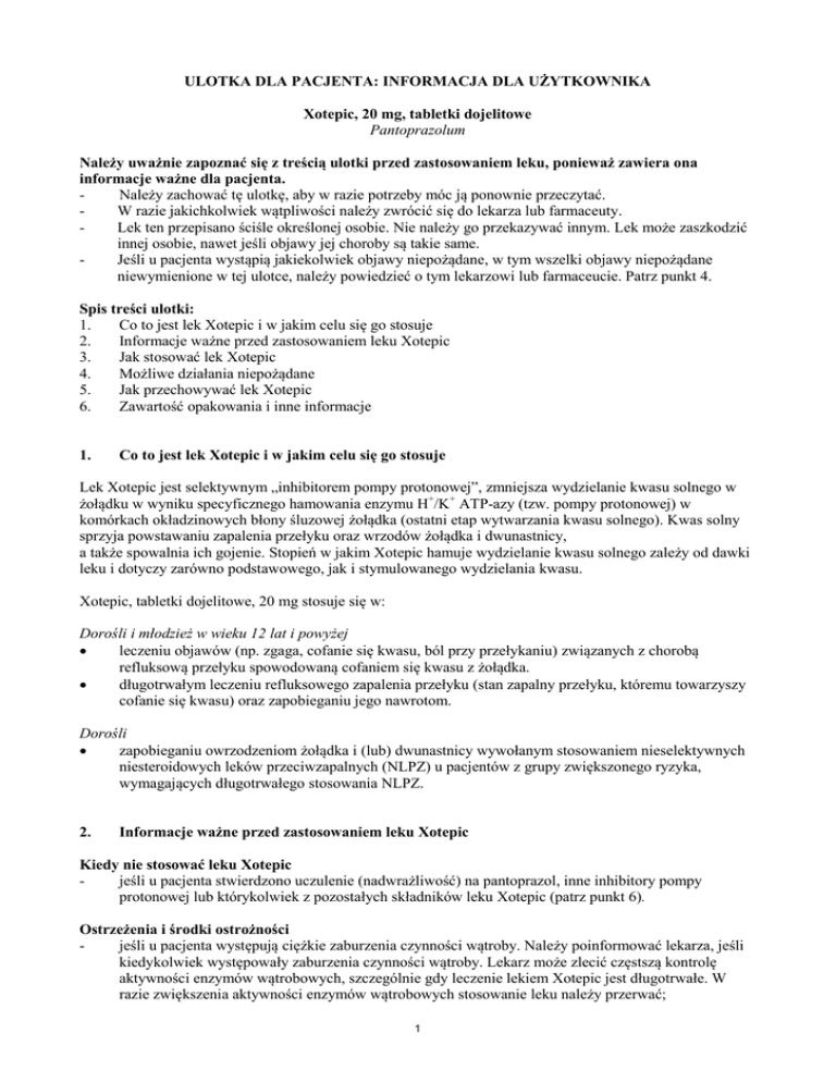 ULOTKA DLA PACJENTA: INFORMACJA DLA UŻYTKOWNIKA Xotepic, 20 mg, tabletki dojelitowe Pantoprazolum Należy uważnie zapoznać się z treścią ulotki przed zastosowaniem leku, ponieważ zawiera ona informacje ważne dla pacjenta. Należy zachować tę ulotkę, aby w razie potrzeby móc ją ponownie przeczytać. W razie jakichkolwiek wątpliwości należy zwrócić się do lekarza lub farmaceuty. Lek ten przepisano ściśle określonej osobie. Nie należy go przekazywać innym. Lek może zaszkodzić innej osobie, nawet jeśli objawy jej choroby są takie same. Jeśli u pacjenta wystąpią jakiekolwiek objawy niepożądane, w tym wszelki objawy niepożądane niewymienione w tej ulotce, należy powiedzieć o tym lekarzowi lub farmaceucie. Patrz punkt 4. Spis treści ulotki: 1. Co to jest lek Xotepic i w jakim celu się go stosuje 2. Informacje ważne przed zastosowaniem leku Xotepic 3. Jak stosować lek Xotepic 4. Możliwe działania niepożądane 5. Jak przechowywać lek Xotepic 6. Zawartość opakowania i inne informacje 1. Co to jest lek Xotepic i w jakim celu się go stosuje Lek Xotepic jest selektywnym „inhibitorem pompy protonowej”, zmniejsza wydzielanie kwasu solnego w żołądku w wyniku specyficznego hamowania enzymu H+/K+ ATP-azy (tzw. pompy protonowej) w komórkach okładzinowych błony śluzowej żołądka (ostatni etap wytwarzania kwasu solnego). Kwas solny sprzyja powstawaniu zapalenia przełyku oraz wrzodów żołądka i dwunastnicy, a także spowalnia ich gojenie. Stopień w jakim Xotepic hamuje wydzielanie kwasu solnego zależy od dawki leku i dotyczy zarówno podstawowego, jak i stymulowanego wydzielania kwasu. Xotepic, tabletki dojelitowe, 20 mg stosuje się w: Dorośli i młodzież w wieku 12 lat i powyżej leczeniu objawów (np. zgaga, cofanie się kwasu, ból przy przełykaniu) związanych z chorobą refluksową przełyku spowodowaną cofaniem się kwasu z żołądka. długotrwałym leczeniu refluksowego zapalenia przełyku (stan zapalny przełyku, któremu towarzyszy cofanie się kwasu) oraz zapobieganiu jego nawrotom. Dorośli zapobieganiu owrzodzeniom żołądka i (lub) dwunastnicy wywołanym stosowaniem nieselektywnych niesteroidowych leków przeciwzapalnych (NLPZ) u pacjentów z grupy zwiększonego ryzyka, wymagających długotrwałego stosowania NLPZ. 2. Informacje ważne przed zastosowaniem leku Xotepic Kiedy nie stosować leku Xotepic jeśli u pacjenta stwierdzono uczulenie (nadwrażliwość) na pantoprazol, inne inhibitory pompy protonowej lub którykolwiek z pozostałych składników leku Xotepic (patrz punkt 6). Ostrzeżenia i środki ostrożności jeśli u pacjenta występują ciężkie zaburzenia czynności wątroby. Należy poinformować lekarza, jeśli kiedykolwiek występowały zaburzenia czynności wątroby. Lekarz może zlecić częstszą kontrolę aktywności enzymów wątrobowych, szczególnie gdy leczenie lekiem Xotepic jest długotrwałe. W razie zwiększenia aktywności enzymów wątrobowych stosowanie leku należy przerwać; 1 - - - jeśli pacjent musi stale stosować leki z grupy niesteroidowych leków przeciwzapalnych (NLPZ) i jednocześnie przyjmować Xotepic, ze względu na podwyższone ryzyko powikłań ze strony żołądka lub jelit. Podwyższone ryzyko zostanie ocenione zgodnie z czynnikami ryzyka dla danego pacjenta, takimi jak wiek (65 lat lub więcej), wrzody żołądka lub dwunastnicy w wywiadzie lub krwawienie z żołądka lub jelit; jeśli u pacjenta występuje niedobór witaminy B12 lub występują czynniki ryzyka wskazujące na możliwość zmniejszenia stężenia witaminy B12, a pacjent leczony jest długotrwale pantoprazolem. Podobnie jak w przypadku wszystkich leków zmniejszających (hamujących) wydzielanie kwasu solnego w żołądku, pantoprazol może prowadzić do zmniejszonego wchłaniania witaminy B12; jeśli pacjent przyjmuje lek zawierający atazanawir (stosowany w leczeniu zakażenia HIV) jednocześnie z pantoprazolem, powinien poprosić lekarza o szczegółową poradę; jeśli pacjent przyjmuje leki zmniejszające wydzielanie kwasu solnego w żołądku (może to wiązać się z niewielkim zwiększaniem ryzyka zakażeń przewodu pokarmowego, np. Salmonella, Campylobacter i C. difficile); Przyjmując inhibitory pompy protonowej jak Xotepic zwłaszcza w okresie dłuższym niż jeden rok, może zwiększyć się nieznacznie ryzyko wystąpienia złamań kości biodrowej, kości nadgarstka lub kręgosłupa. Należy poinformować lekarza w przypadku rozpoznanej osteoporozy lub przyjmowania leków z grupy kortykosteroidów (mogących zwiększać ryzyko wystąpienia osteoporozy). W przypadku pojawienia się następujących objawów należy natychmiast poinformować lekarza: niezamierzona utrata masy ciała nawracające wymioty trudności z przełykaniem krwawe wymioty bladość i osłabienie (niedokrwistość) krew w kale ciężkie i (lub) uporczywe biegunki, ponieważ stosowanie leku Xotepic wiąże się z niewielkim zwiększeniem ryzyka wystąpienia biegunki zakaźnej. W przypadku długotrwałego leczenia, dłużej niż przez 1 rok, pacjentów należy objąć regularnym nadzorem lekarza. Przed rozpoczęciem leczenia, lekarz prowadzący powinien wykluczyć możliwość wrzodu żołądka lub przełyku o charakterze nowotworowym, ponieważ leczenie pantoprazolem może maskować objawy choroby nowotworowej i opóźnić jej prawidłowe rozpoznanie. Pacjenci, u których nie obserwuje się poprawy, wymagają przeprowadzenia dodatkowych badań. Zaleca się kontrolę czasu protrombinowego, INR (międzynarodowego współczynnika znormalizowanego) po rozpoczęciu, zakończeniu lub podczas nieregularnego stosowania pantoprazolu. Lek Xotepic a inne leki Należy powiedzieć lekarzowi o przyjmowaniu następujących leków: ketokonazolu, itrakonazolu, pozakonazolu (stosowanych w leczeniu zakażeń grzybiczych), erlotynibu (stosowany w pewnych typach nowotworów), ponieważ Xotepic może hamować prawidłowe działanie tych i innych lekó