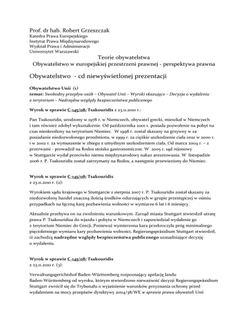 Prof. dr hab. Robert Grzeszczak Katedra Prawa Europejskiego Instytut Prawa Międzynarodowego Wydział Prawa i Administracji Uniwersytet Warszawski Teorie obywatelstwa Obywatelstwo w europejskiej przestrzeni prawnej - perspektywa prawna Obywatelstwo - cd niewyświetlonej prezentacji Obywatelstwo Unii (1) temat: Swobodny przepływ osób – Obywatel Unii – Wyroki skazujące – Decyzja o wydaleniu z terytorium – Nadrzędne względy bezpieczeństwa publicznego Wyrok w sprawie C-145/08; Tsakouridis z 23.11.2010 r.: Pan Tsakouridis, urodzony w 1978 r. w Niemczech, obywatel grecki, mieszkał w Niemczech i tam również zdobył wykształcenie. Od października 2001 r. posiada pozwolenie na pobyt na czas nieokreślony na terytorium Niemiec. W 1998 r. został skazany na grzywny w za posiadanie niedozwolonego przedmiotu, w 1999 r. za ciężkie uszkodzenie ciała oraz w 2000 r. i w 2002 r. za wymuszenie w zbiegu z umyślnym uszkodzeniem ciała. Od marca 2004 r. – z przerwami - prowadził na Rodos stoisko gastronomiczne. W 2005 r. sąd rejonowy w Stuttgarcie wydał przeciwko niemu międzynarodowy nakaz aresztowania. W listopadzie 2006 r. P. Tsakouridis został zatrzymany na Rodos, a następnie przewieziony do Niemiec. Wyrok w sprawie C-145/08; Tsakouridis z 23.11.2010 r. (2): Wyrokiem sądu krajowego w Stuttgarcie z sierpnia 2007 r. P. Tsakouridis został skazany za niedozwolony handel znaczną ilością środków odurzających w grupie przestępczej w ośmiu przypadkach na łączną karę pozbawienia wolności w wymiarze 6 lat i 6 miesięcy. Aktualnie przebywa on na zwolnieniu warunkowym. Zarząd miasta Stuttgart stwierdził utratę prawa P. Tsakouridisa do wjazdu i pobytu w Niemczech i zapowiedział wydalenie go z terytorium Niemiec do Grecji. Ponieważ wymierzona kara przekroczyła próg minimalnego pięcioletniego wymiaru kary pozbawienia wolności, Regierungspräsidium Stuttgart stwierdził, iż zachodzą nadrzędne względy bezpieczeństwa publicznego uzasadniające decyzję o wydaleniu. Wyrok w sprawie C-145/08; Tsakouridis z 23.11.2010 r. (3): Verwaltungsgerichtshof Baden-Württemberg rozpoznający apelację landu Baden-Württemberg od wyroku, którym stwierdzono nieważność decyzji Regierungspräsidium Stuttgart zwrócił się do Trybunału o wyjaśnienie warunków przyznania ochrony przed wydaleniem na mocy przepisów dyrektywy 2004/38/WE w sprawie prawa obywateli Unii i członków ich rodzin do swobodnego przemieszczania się i pobytu na terytorium państw członkowskich. Dyrektywa stanowi m.in., że decyzja o wydaleniu podjęta w stosunku do obywatela Unii, który zamieszkiwał w przyjmującym państwie członkowskim przez poprzednie dziesięć lat, może być uzasadniona wyłącznie nadrzędnymi względami bezpieczeństwa publicznego. obywatelstwo unijne wolność przemieszczania się TSUE z 22 maja 2012 r. (C 348/09) stwierdził, że popełnienie przestępstwa zaliczanego do szczególnie poważnych dziedzin przestępczości wymienionych w Traktacie o Funkcjonowaniu Unii Europejskiej (art. 83 ust. 1) mogą uzasadniać wydalenie obywatela Unii, pomimo, iż mieszkał w przyjmującym państwie członkowskim przez okres dłuższy niż dziesięć lat. Trybunał zaznaczył jednak, że przed podjęciem decyzji o wydaleniu, państwo przyjmujące powinno uwzględnić w szczególności długość pobytu danej osoby na jego terytorium, jej wiek, stan zdrowia, sytuację rodzinną i ekonomiczną, integrację społeczną i kulturalną oraz stopień więzi z krajem pochodzenia (art. 28 ust. 1 Dyrektywy nr 2004/38/WE) Wyrok w sprawie C-208/09; Sayn-Wittgenstein (DE-1); wyrok z 2010-10-14 Po zakończeniu pierwszej wojny światowej zarówno Niemcy jak i Austria przekształciły się w republiki, w których zniesiono szlachectwo, a także wszelkie przywileje i tytuły z nim związane. Od tamtej pory na mocy przepisów o charakterze konstytucyjnym sprzeczne z prawem stało się używanie przez obywateli austriackich jakichkolwiek tytułów szlacheckich, a zakaz ten rozciągnięty został na stanowiące część nazwiska takie przedimki jak „von” oraz „zu”. Z kolei w Niemczech nadane dotychczas tytuły, pomimo pozbawienia ich dotychczasowego znaczenia, stały się częścią nazwiska rodowego przekazywanego wszystkim dzieciom, przy czym w zależności od płci dziecka podlegały wariacjom, przybierając formę męską albo żeńską jak na przykład Fürst (książę) i Fürstin (księżna). Wyrok w sprawie C-208/09; Sayn-Wittgenstein (DE-2) Ilonka Sayn-Wittgenstein jest obywatelką austriacką, urodzoną w 1944 r. we Wiedniu jako Ilonka Kerekes. W październiku 1991 r., kiedy nastąpiło jej formalne przysposobienie przez obywatela niemieckiego, Lothara Fürst von Sayn-Wittgenstein, została ona wpisana do akt pod nazwiskiem „Havel, z domu Kerekes”. W związku z jej wnioskiem do władz we Wiedniu o zarejestrowanie tej nowej tożsamości, sąd opiekuńczy orzekł, że z chwilą przysposobienia jej nazwisko rodowe otrzymuje brzmienie „Fürstin von Sayn-Wittgenstein”, będące żeńską formą nazwiska przysposabiającego. Następnie władze wiedeńskie wydały jej świadectwo urodzenia na nazwisko Ilonka Fürstin von Sayn-Wittgenstein. W 2003 r. austriacki trybunał konstytucyjny wydał wyrok w sprawie o podobnych okolicznościach faktycznych do sprawy I. Sayn-Wittgenstein. Orzekł on, że zgodnie z ustawą o zniesieniu szlachectwa niedopuszczalne jest przekazanie obywatelowi austriackiemu, w drodze przysposobienia przez obywatela niemieckiego, nazwiska zawierającego były tytuł szlachecki. Wyrok ten potwierdził również dotychczasową linię orzeczniczą, zgodnie z którą w przeciwieństwie do prawa niemieckiego prawo austriackie nie zezwala na formułowanie nazwisk męskich i żeńskich na podstawie różnych reguł. Wyrok w sprawie C-208/09; Sayn-Wittgenstein (DE-3) Po wydaniu tego wyroku władze prowadzące akta stanu cywilnego we Wiedniu doszły do wniosku, że wpis dotyczą